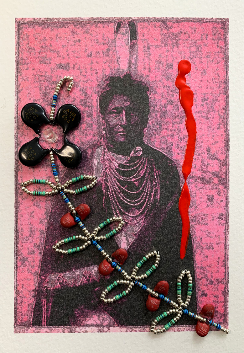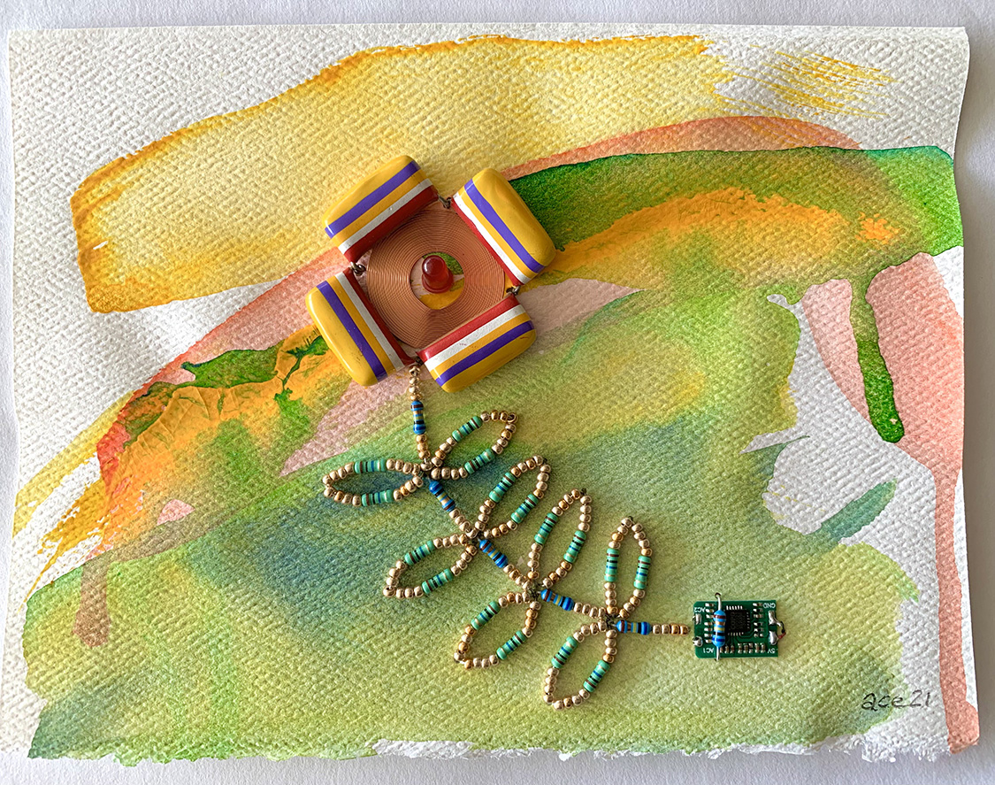 Bloodline #2 (2020) digital output, capacitors, resistors, light emitting diodes, beads, acrylic on paper 18 x 13 cm. Private Collection (Toronto). -