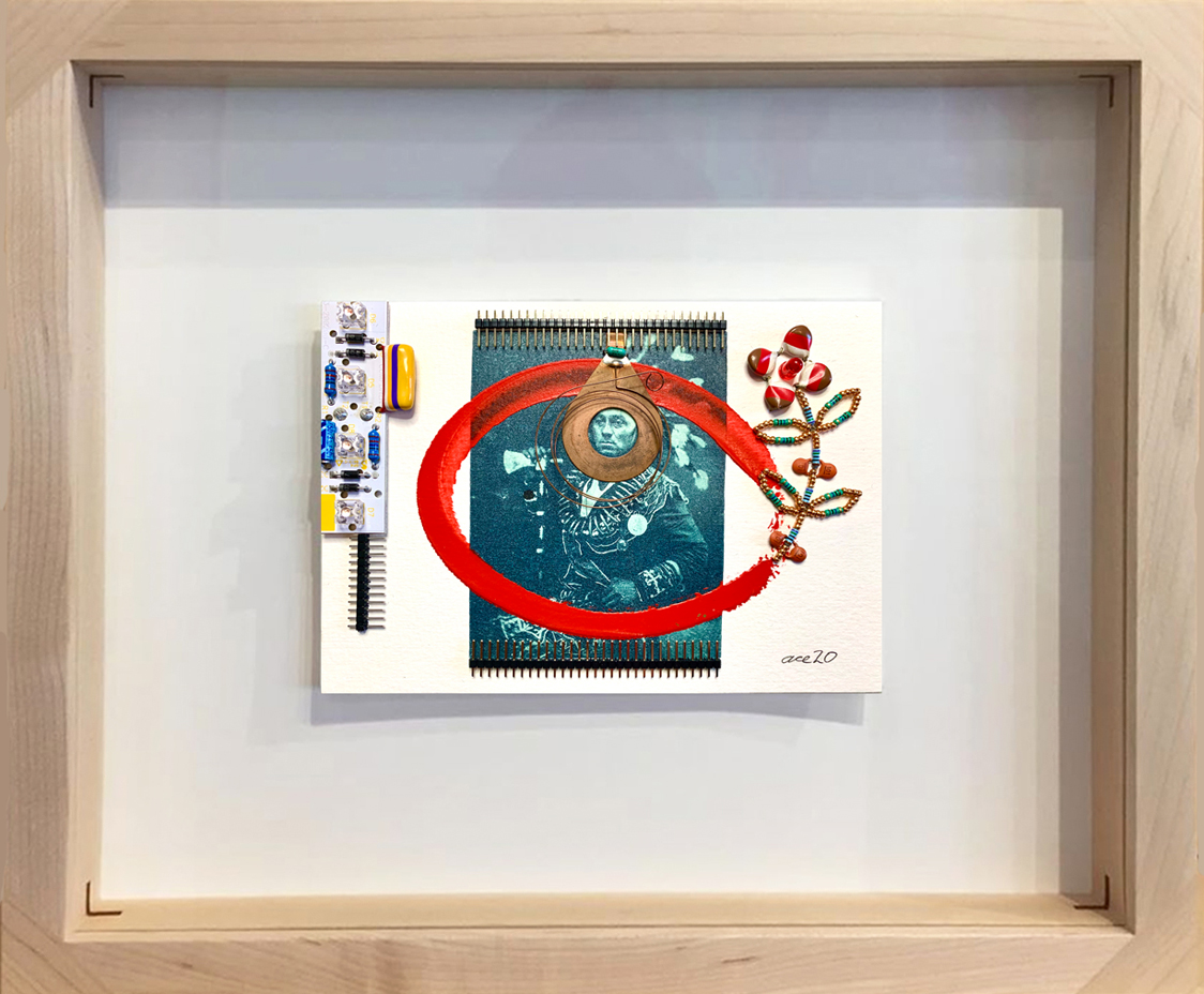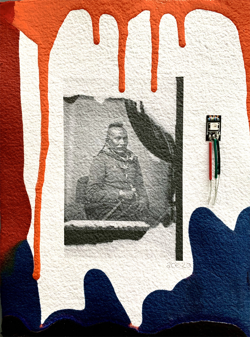 Coadjute (2020) digital output, acrylic and electronic components on handmade paper 17.8 x 24.1 cm. Collection of the Artist. -