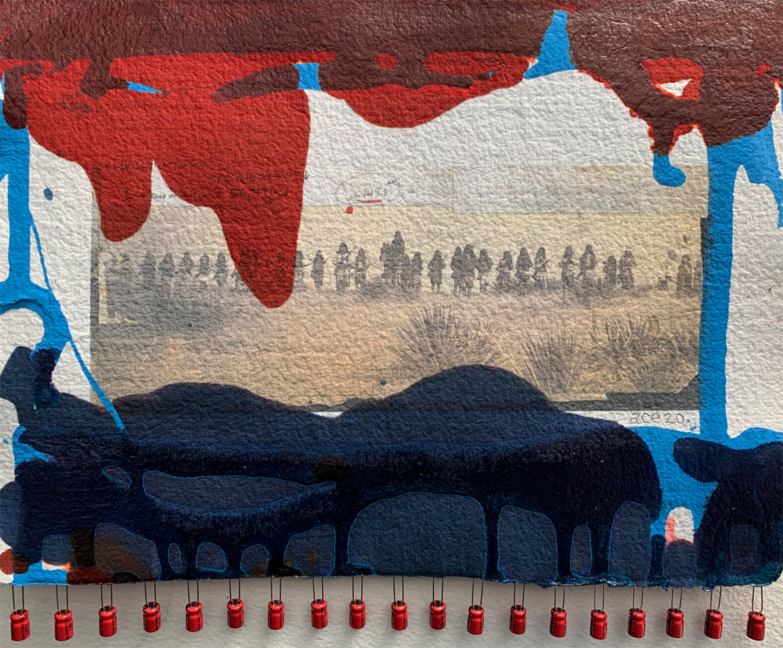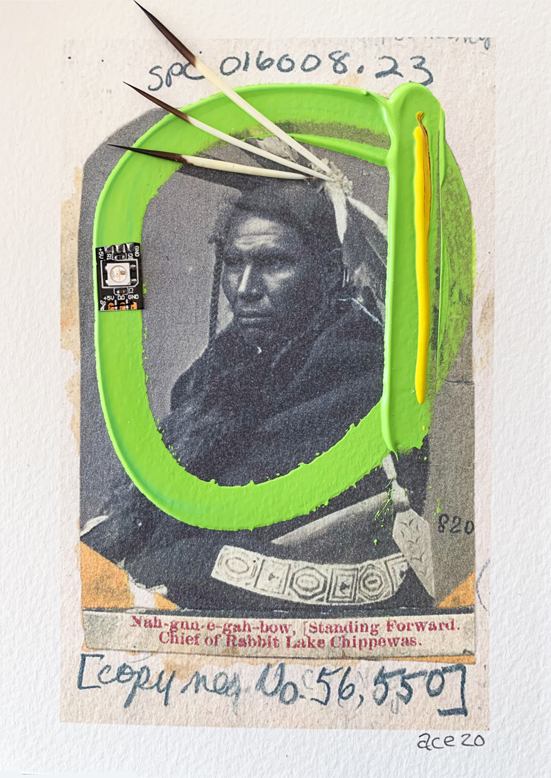Micro-Chip and Nahgunegahbow (Standing Forward) (2020) mixed media on paper 18 x 13 cm. Private Collection (Ottawa). -