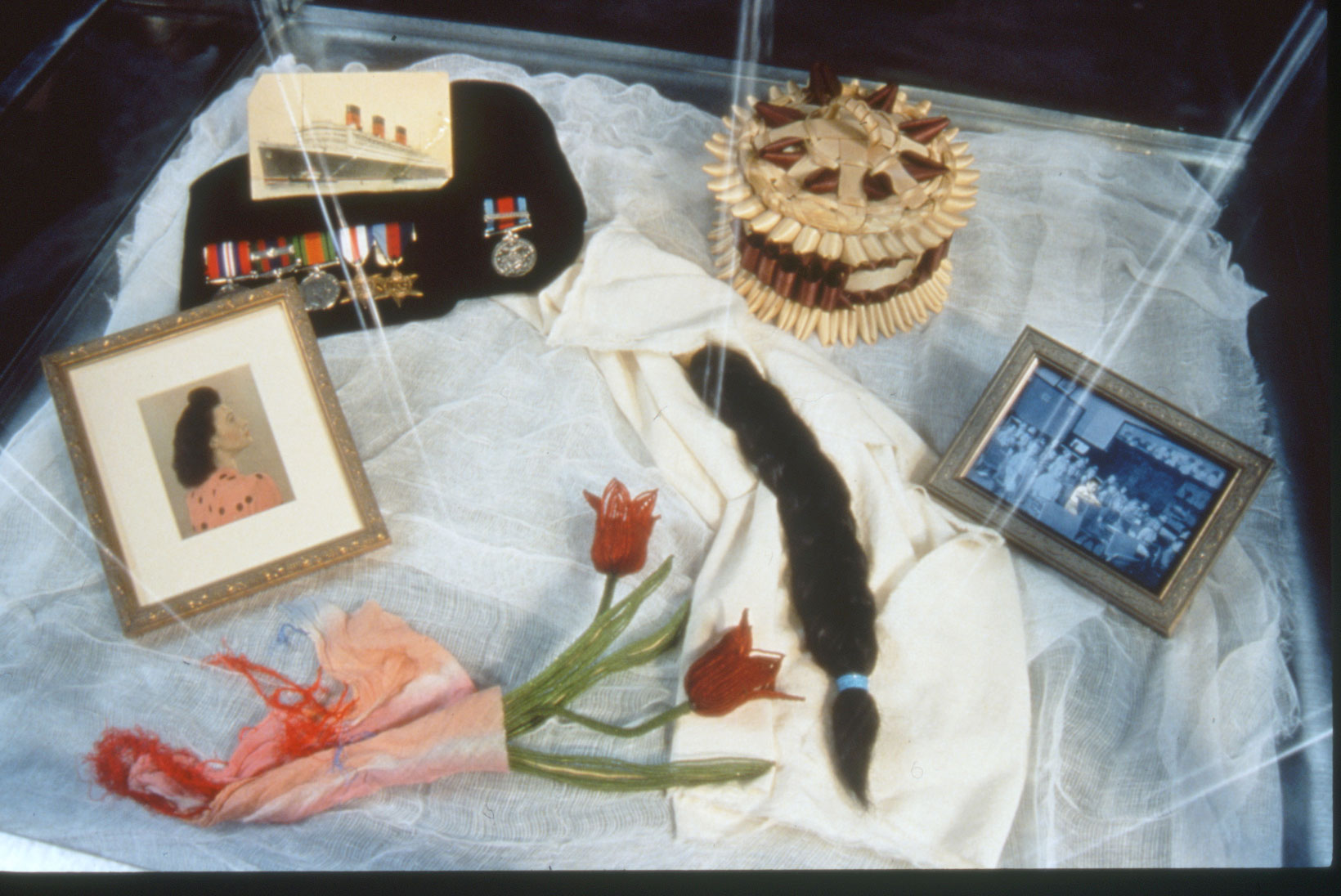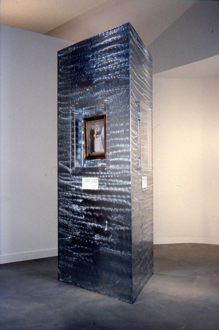 To introduce the installation, I chose my parents’ wedding portrait, taken in Birmingham, England, in 1945. The photograph is in its original frame with an inscription “For King and Country”. The photograph offers little information, other than it was the end of World War II, and it marked the joining in matrimony of a Canadian Indigenous soldier and an English woman. I thought it was an ideal starting point to fill in that negative space and trace the circumstances surrounding my family’s historical past and future together. Seven steel poles form an apex directly over a metal and glass display case as a metaphor for my family’s lodge. Each pole represents one of my seven family members and is a metaphor for their individual and collective strength. Seven objects are arranged on cloth as a metaphor for a sacred medicine bundle; my father is represented by WWII medals; my mother by a post‑card of the Queen Mary; my brother by a school photograph; my great‑aunt by a splint ash basket; my other great‑aunt by a hand‑coloured portrait; my cousin by beaded flowers; my grandmother, who is now deceased, by an artificial braid of hair. Each object is a window into their lives, where the object is metaphor for personal memory and sacred gift.