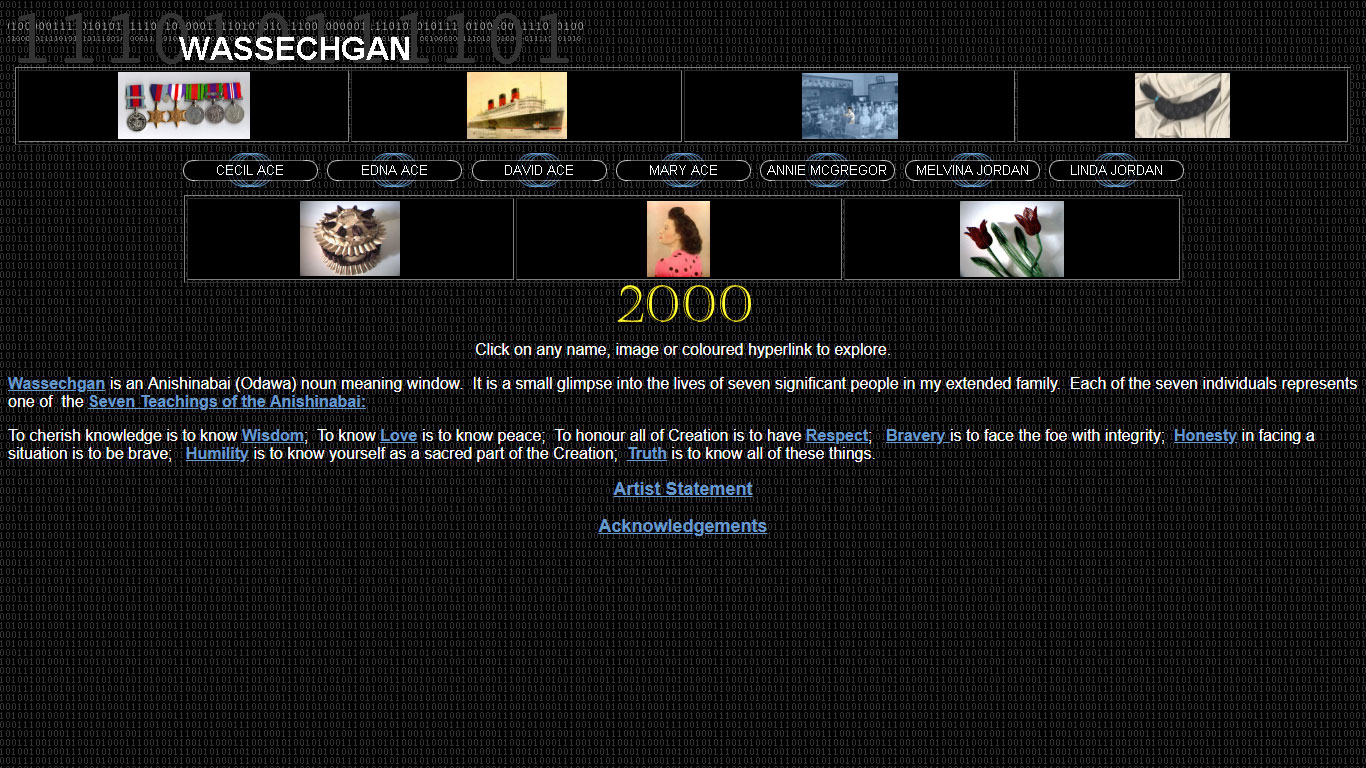 Since the installation is a tribute to the life and contribution of these seven individuals, I chose to situate myself on the periphery. I reference myself through the wire sculpture of trickster/storyteller Nanabush for in Wassechgan, I am the storyteller, providing a brief glimpse through one of many possible windows.