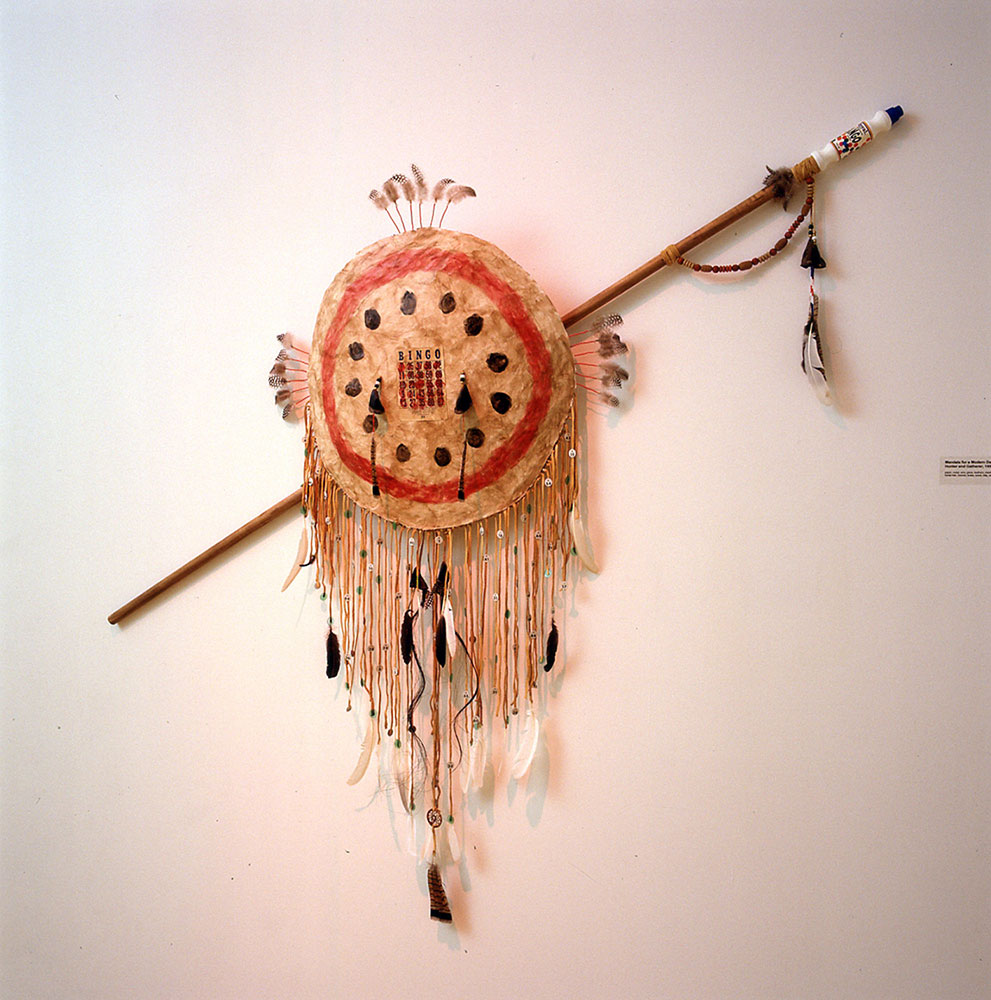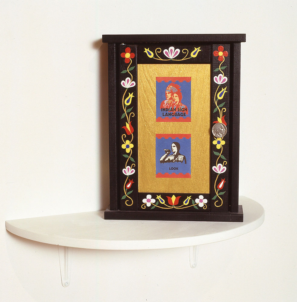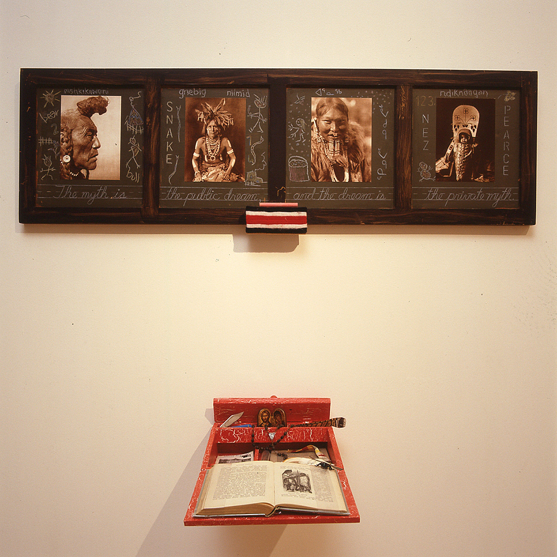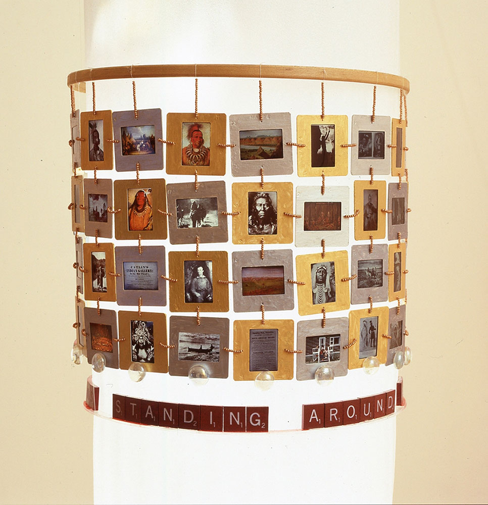 The exhibition was installed around a central illuminated post with historical representations of Indigenous people and Ace’s family in 35mm transparencies linked together and illuminated by the post and a continuously running text in Scrabble™ letters spelling out “modern Indians standing around at the post – modern Indians standing around at the post-modern…” In creating new works for the exhibition, Ace addressed a multiplicity of social, cultural, spiritual and historical issues that were drawn directly from his own personal experience and those of his family and Anishinaabe community. Although some of the works were couched in dark humour and parody, many others were a blatant and tragic commentary on the impact of colonization, enforced assimilation and environmental change.