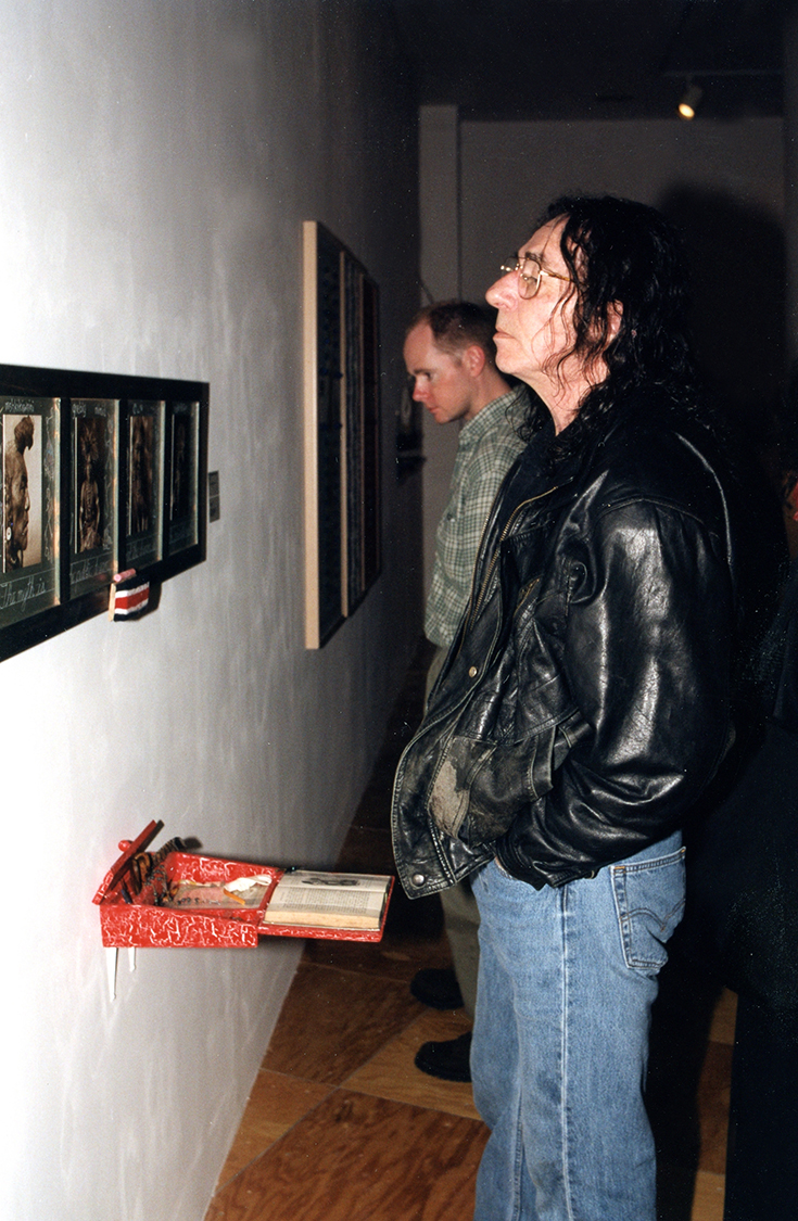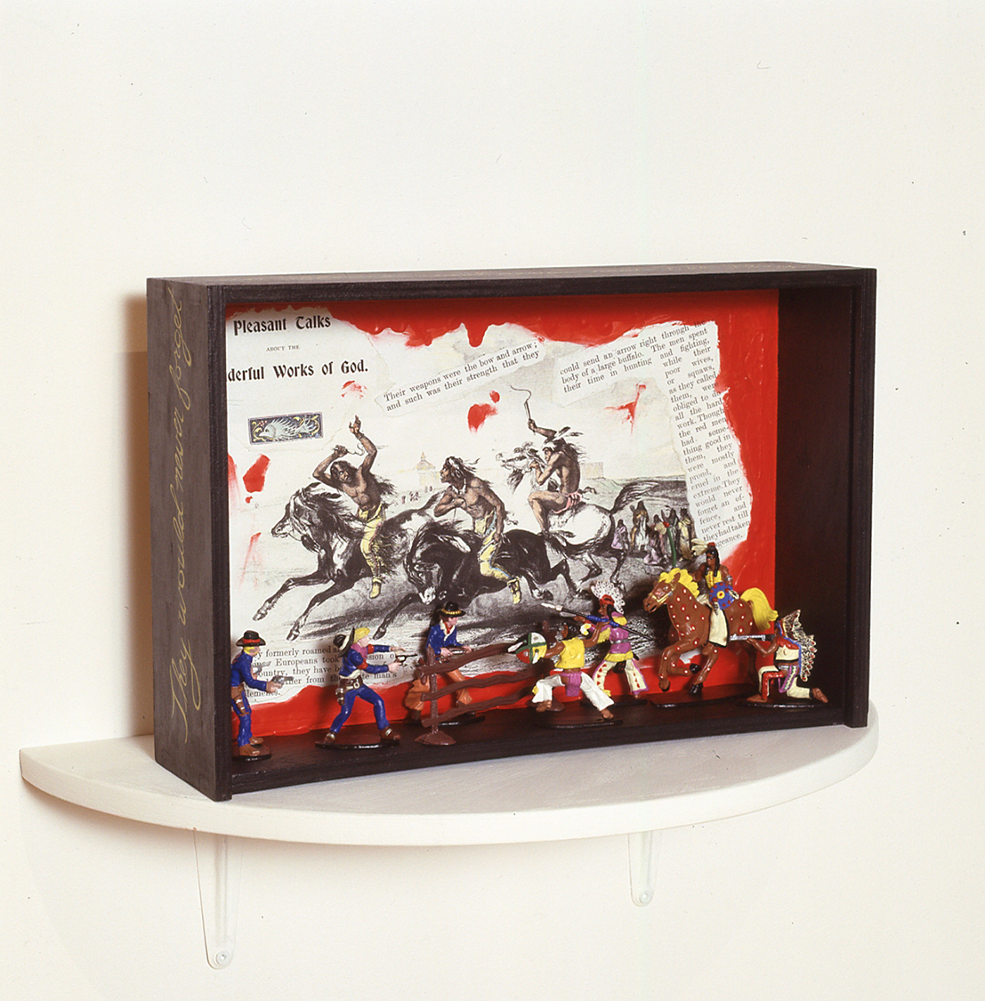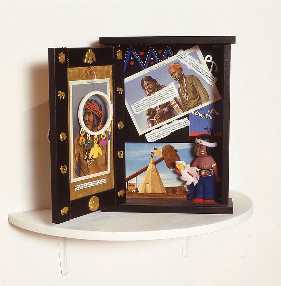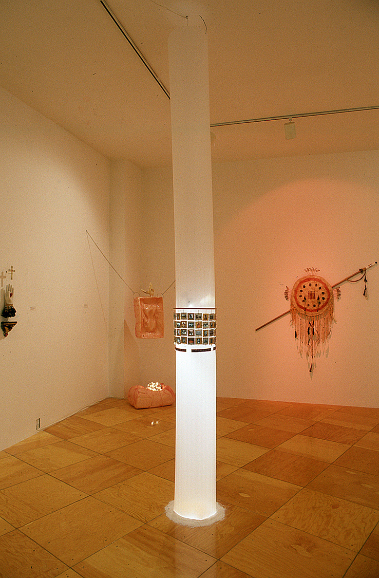 The exhibition was installed around a central illuminated post with historical representations of Indigenous people and Ace’s family in 35mm transparencies linked together and illuminated by the post and a continuously running text in Scrabble™ letters spelling out “modern Indians standing around at the post – modern Indians standing around at the post-modern…” In creating new works for the exhibition, Ace addressed a multiplicity of social, cultural, spiritual and historical issues that were drawn directly from his own personal experience and those of his family and Anishinaabe community. Although some of the works were couched in dark humour and parody, many others were a blatant and tragic commentary on the impact of colonization, enforced assimilation and environmental change.