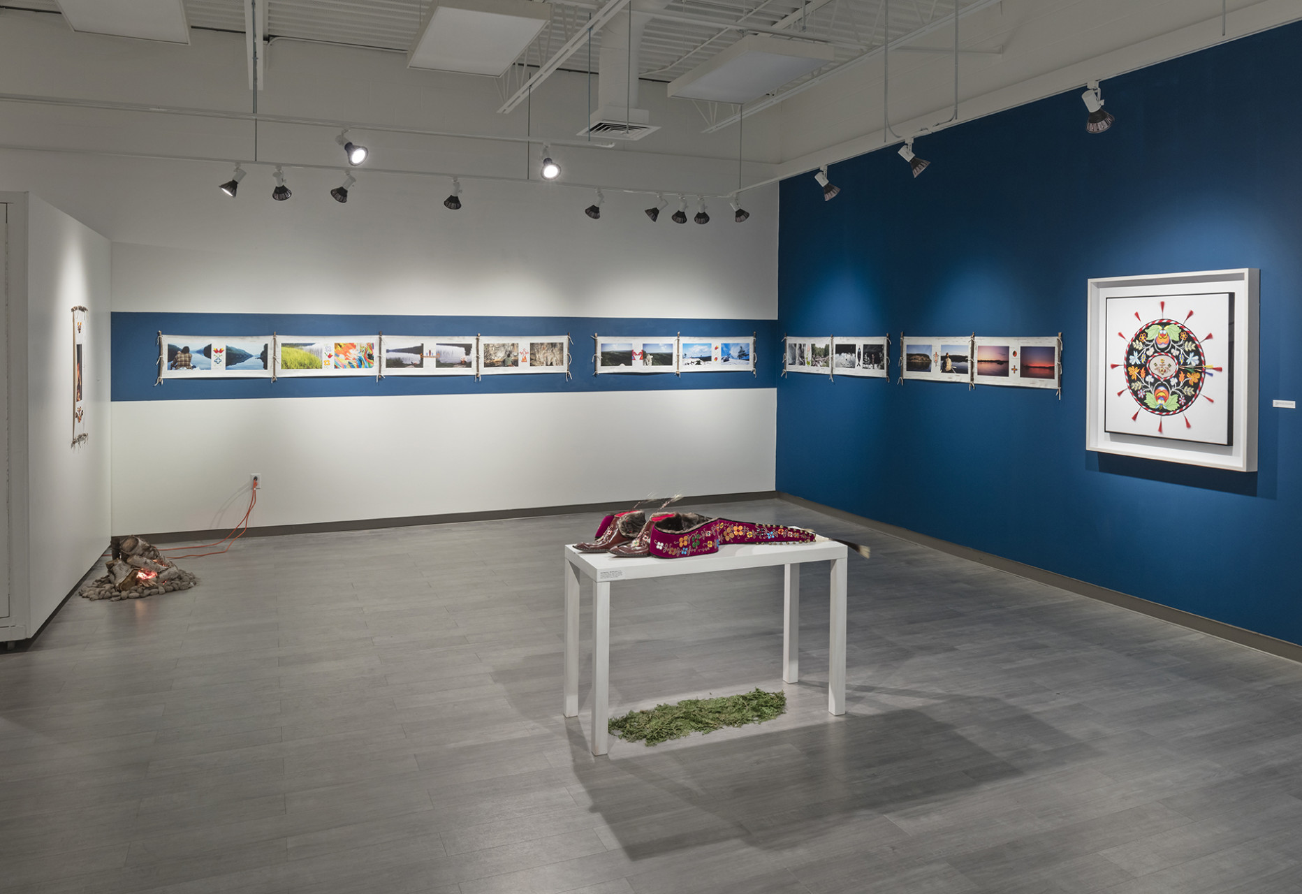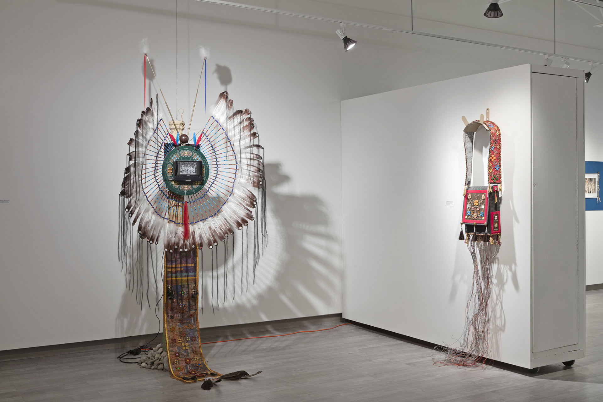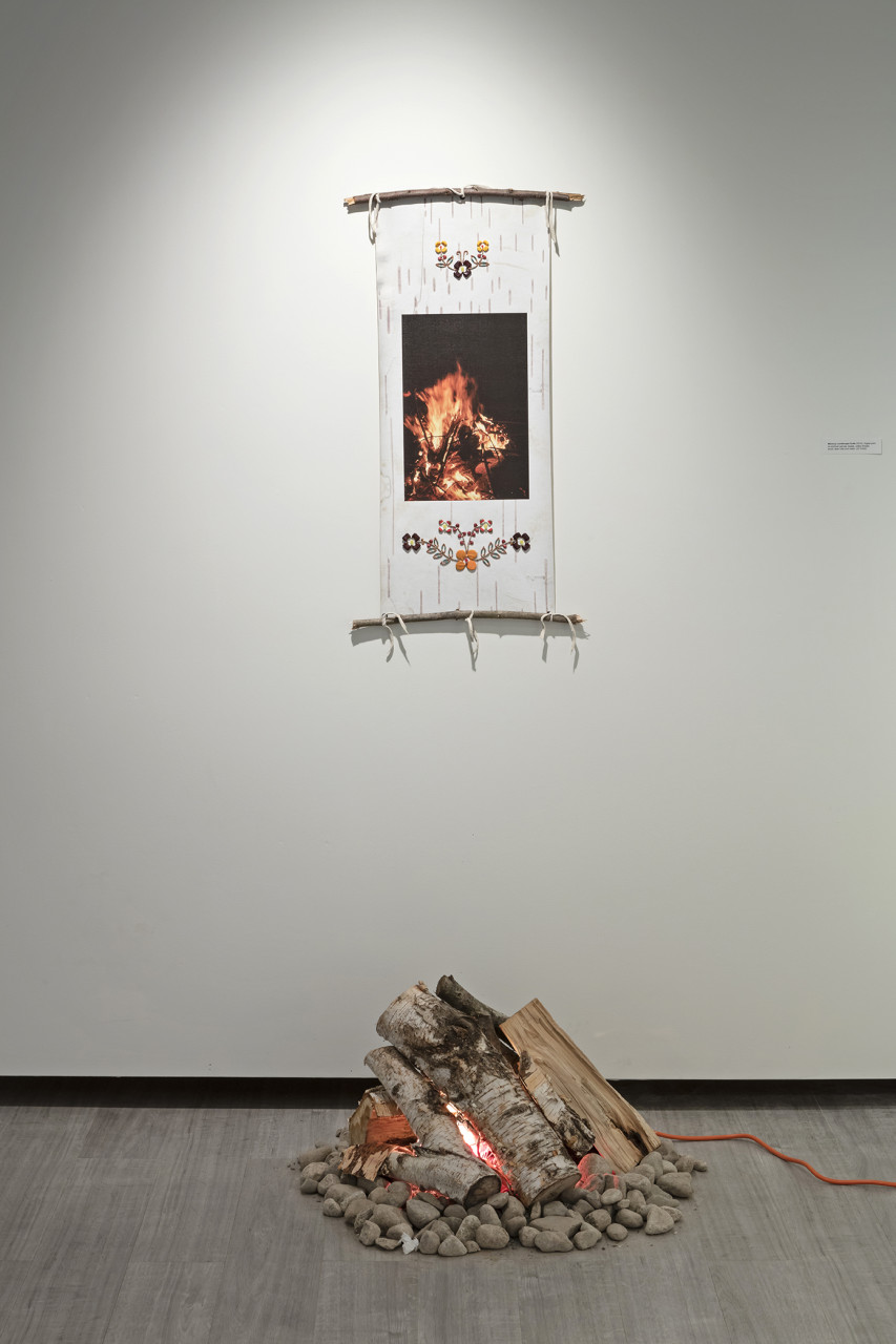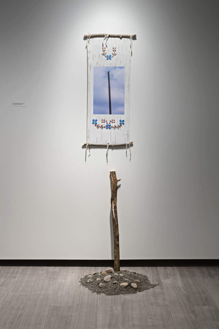 Drawing inspiration from multiple facets of traditional Anishinaabeg culture gathered from historical sources, found objects and cultural research, Ace creates objects and imagery that utilize many traditional techniques, forms and motifs and infuses these with a contemporary energy that grounds the work, and by extension the artist himself firmly in the present historical moment. In the bead works that permeate all the pieces in the exhibition the artist uses traditional glass beads in conjunction with capacitors, resistors and light emitting diodes that turn our readings of these objects on their heads. He extends this material mash up by using traditional glass beads to create representations of electronic schematics as well as transposing traditional designs into a digital signal seen on a video monitor hidden beneath the folds of a traditional bandolier bag. In a memorial work dedicated to his late adopted brother titled Memory Landscape, Ace uses the form of the Anishinaabeg sacred birch bark scroll to weave a personal narrative that reveals their shared journey as youths exploring their traditional territory by canoe. Archival Kodachrome images transposed onto scanned pieces of birch bark and infused with hybrid bead-work tell a personal story filled with poignancy and power.