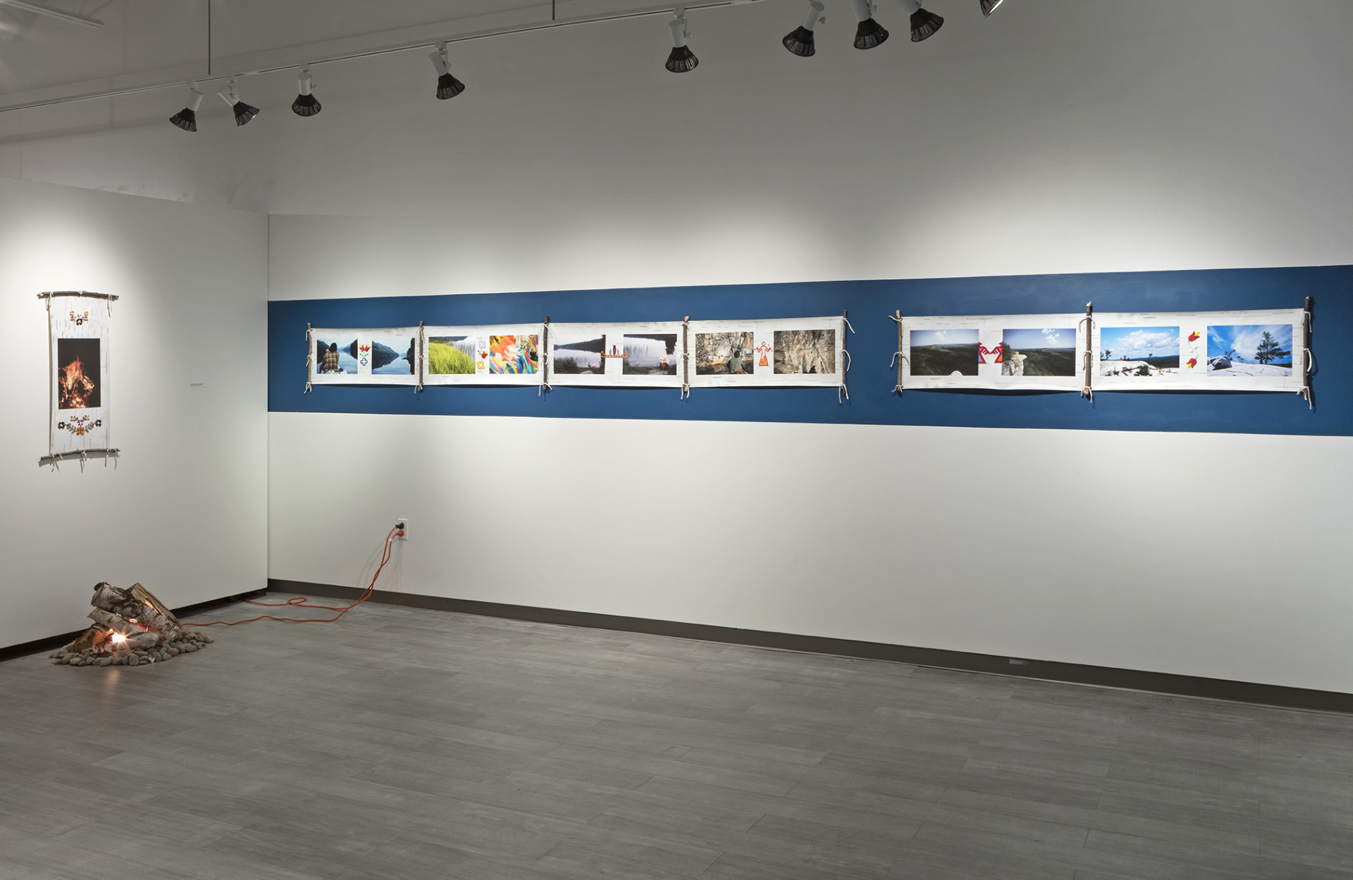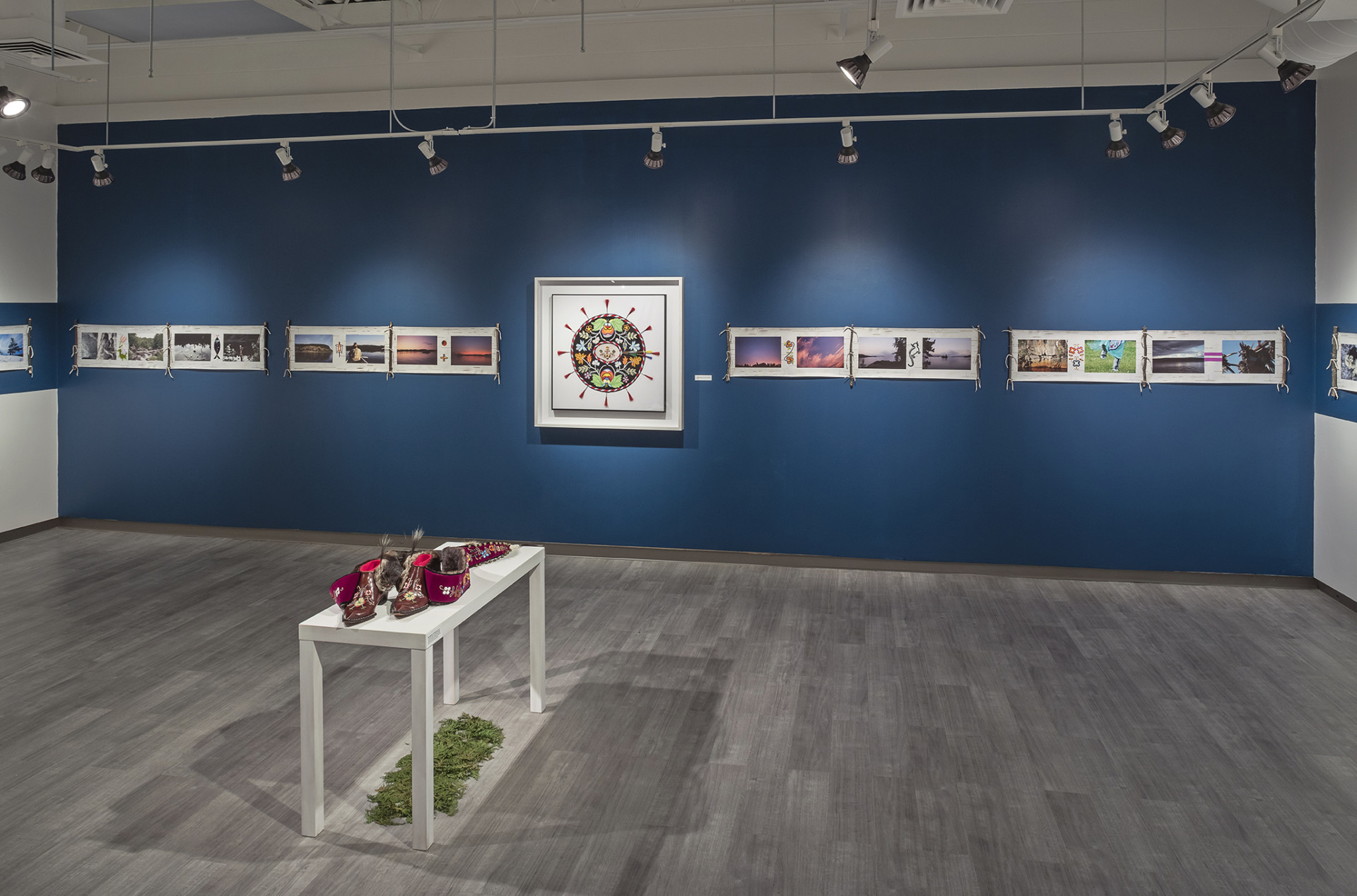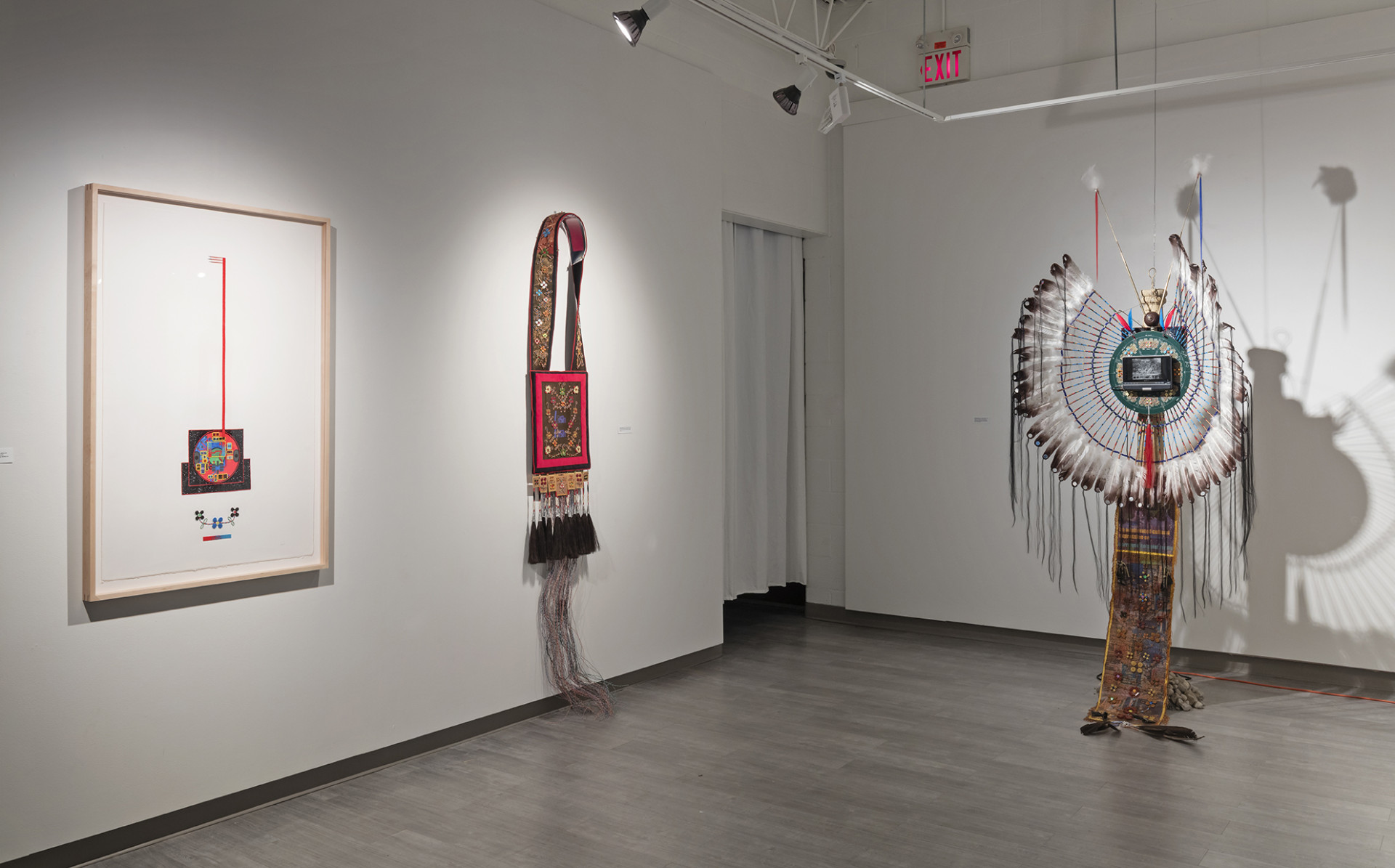 Drawing inspiration from multiple facets of traditional Anishinaabeg culture gathered from historical sources, found objects and cultural research, Ace creates objects and imagery that utilize many traditional techniques, forms and motifs and infuses these with a contemporary energy that grounds the work, and by extension the artist himself firmly in the present historical moment. In the bead works that permeate all the pieces in the exhibition the artist uses traditional glass beads in conjunction with capacitors, resistors and light emitting diodes that turn our readings of these objects on their heads. He extends this material mash up by using traditional glass beads to create representations of electronic schematics as well as transposing traditional designs into a digital signal seen on a video monitor hidden beneath the folds of a traditional bandolier bag. In a memorial work dedicated to his late adopted brother titled Memory Landscape, Ace uses the form of the Anishinaabeg sacred birch bark scroll to weave a personal narrative that reveals their shared journey as youths exploring their traditional territory by canoe. Archival Kodachrome images transposed onto scanned pieces of birch bark and infused with hybrid bead-work tell a personal story filled with poignancy and power.