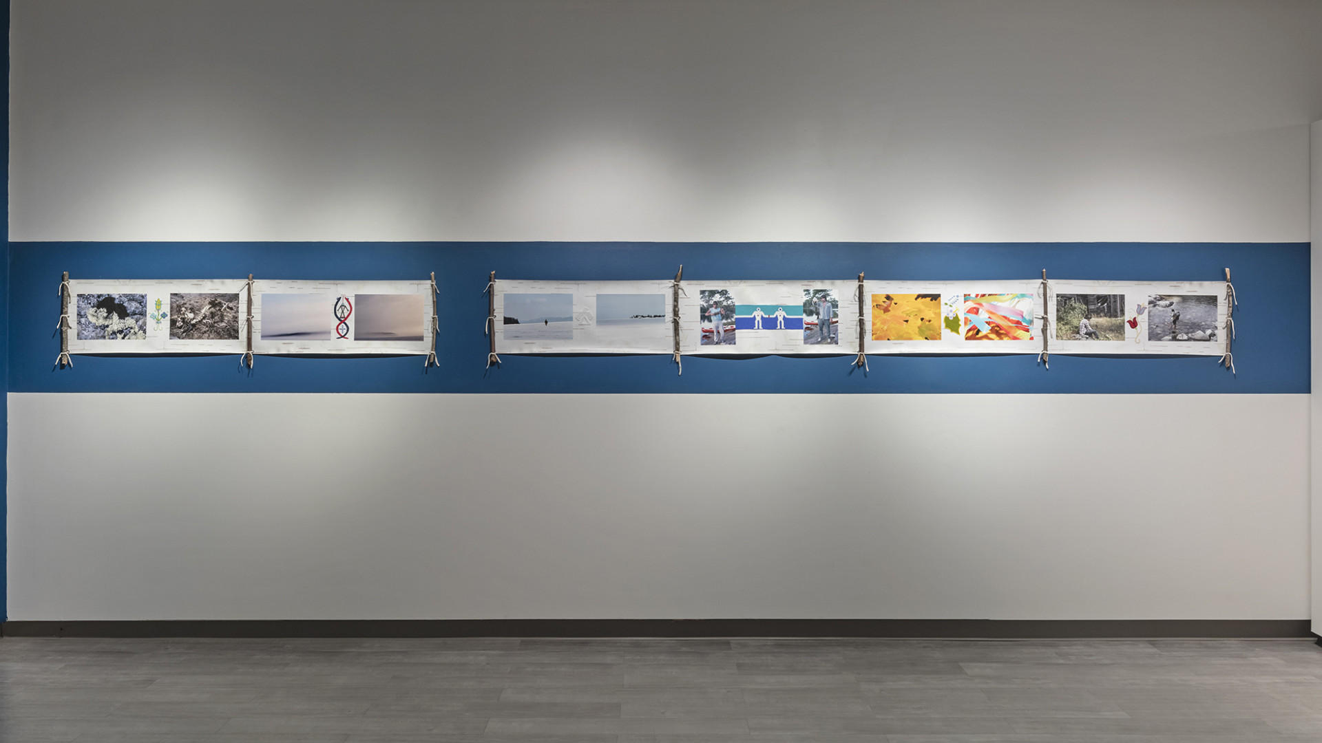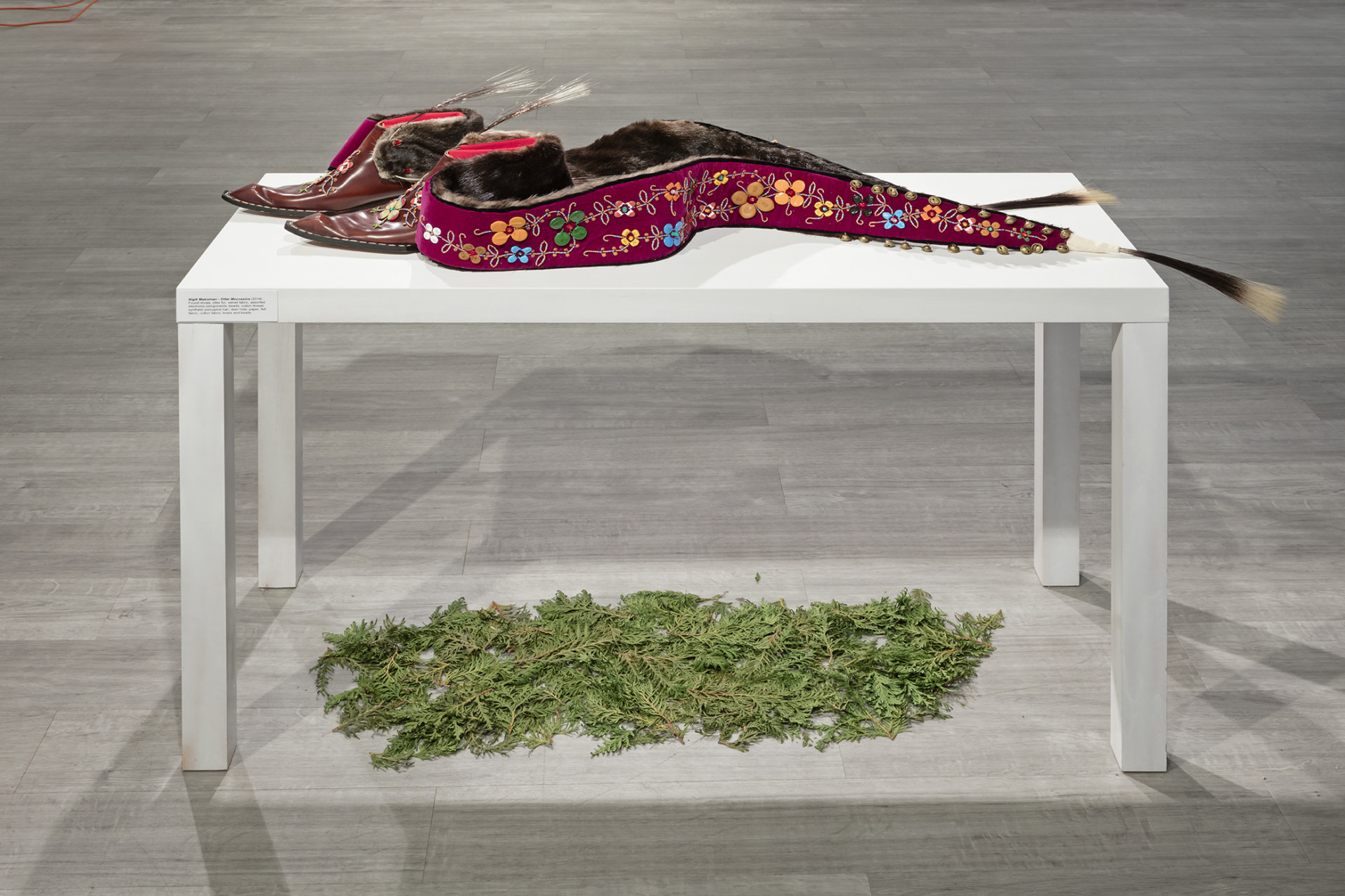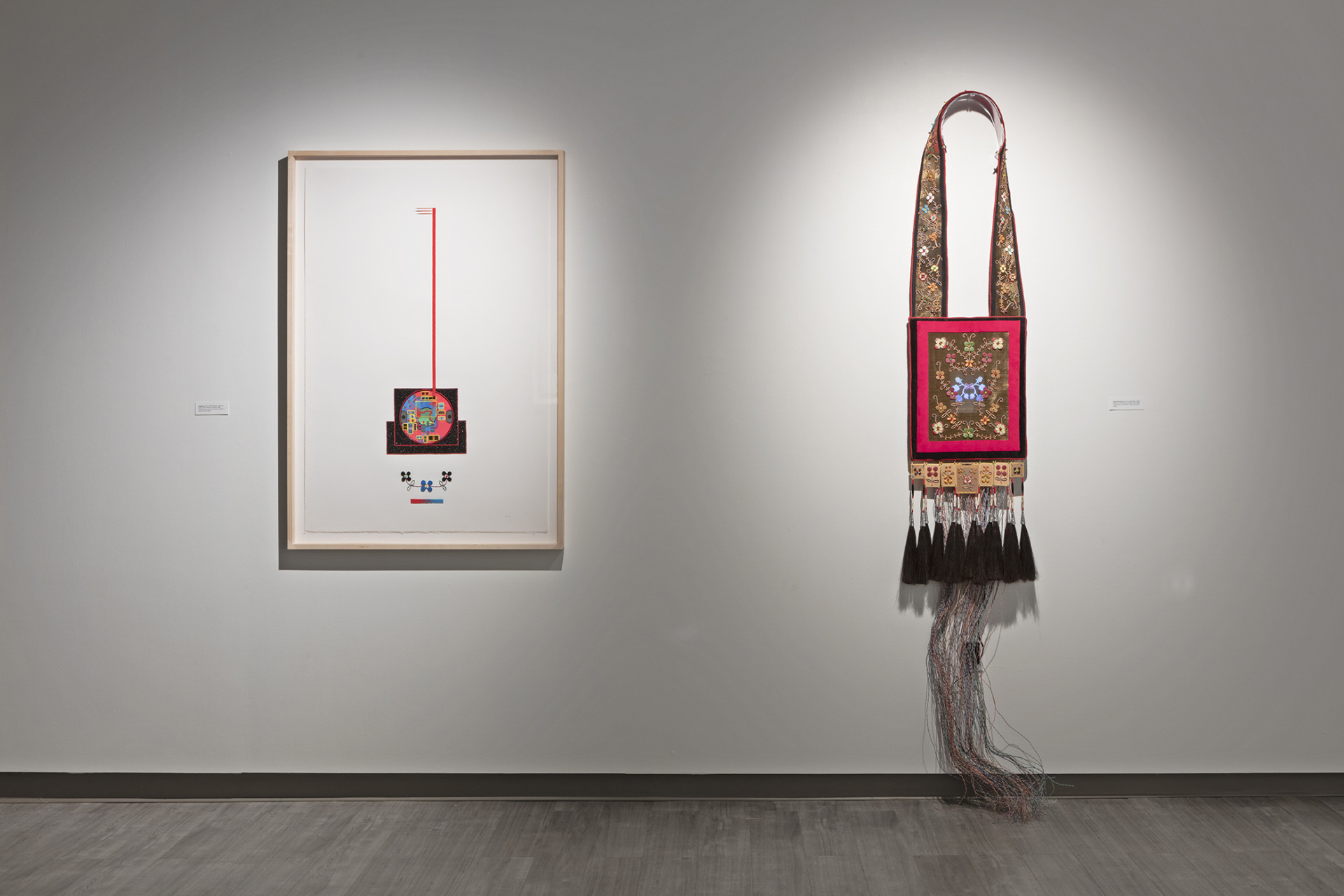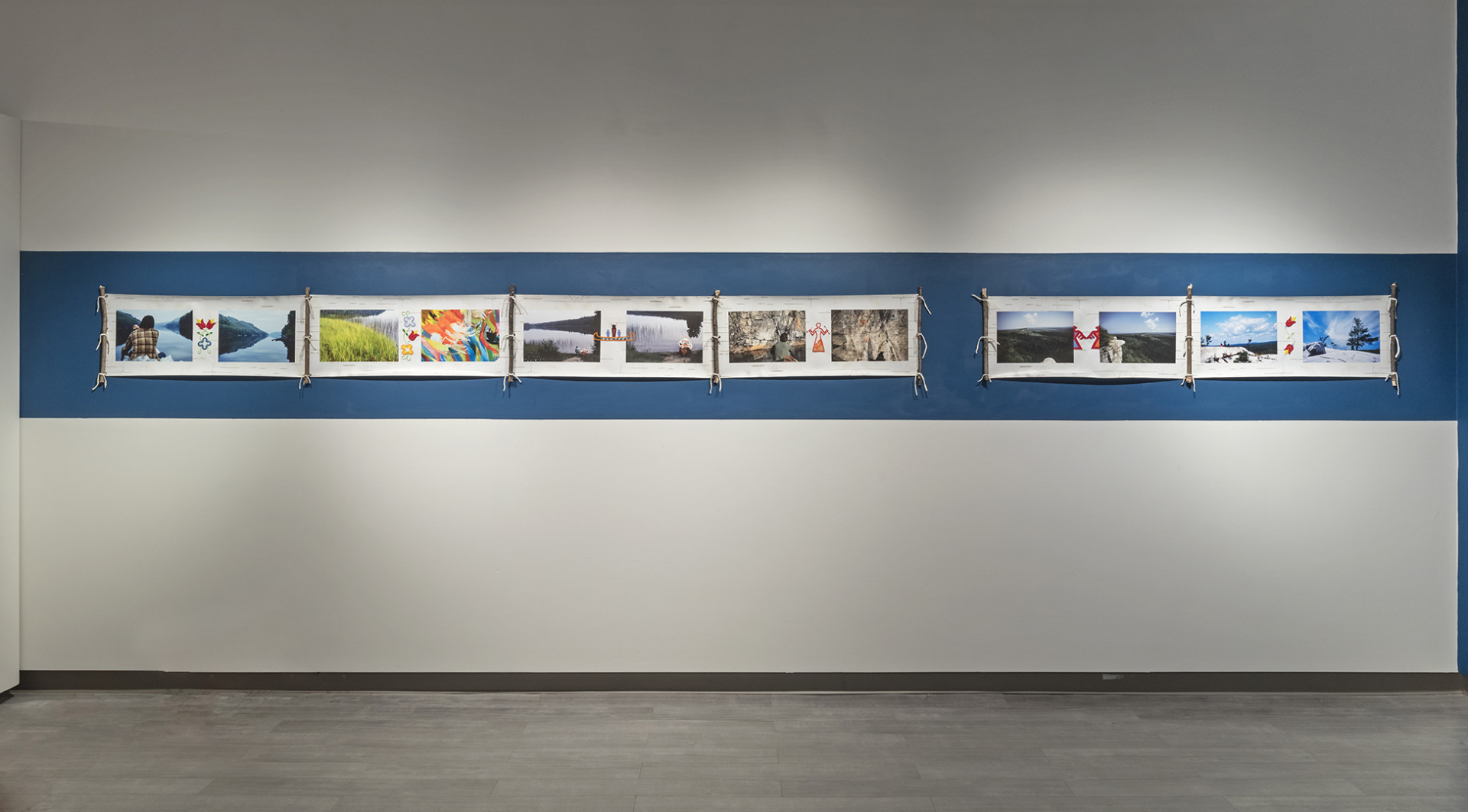 Drawing inspiration from multiple facets of traditional Anishinaabeg culture gathered from historical sources, found objects and cultural research, Ace creates objects and imagery that utilize many traditional techniques, forms and motifs and infuses these with a contemporary energy that grounds the work, and by extension the artist himself firmly in the present historical moment. In the bead works that permeate all the pieces in the exhibition the artist uses traditional glass beads in conjunction with capacitors, resistors and light emitting diodes that turn our readings of these objects on their heads. He extends this material mash up by using traditional glass beads to create representations of electronic schematics as well as transposing traditional designs into a digital signal seen on a video monitor hidden beneath the folds of a traditional bandolier bag. In a memorial work dedicated to his late adopted brother titled Memory Landscape, Ace uses the form of the Anishinaabeg sacred birch bark scroll to weave a personal narrative that reveals their shared journey as youths exploring their traditional territory by canoe. Archival Kodachrome images transposed onto scanned pieces of birch bark and infused with hybrid bead-work tell a personal story filled with poignancy and power.