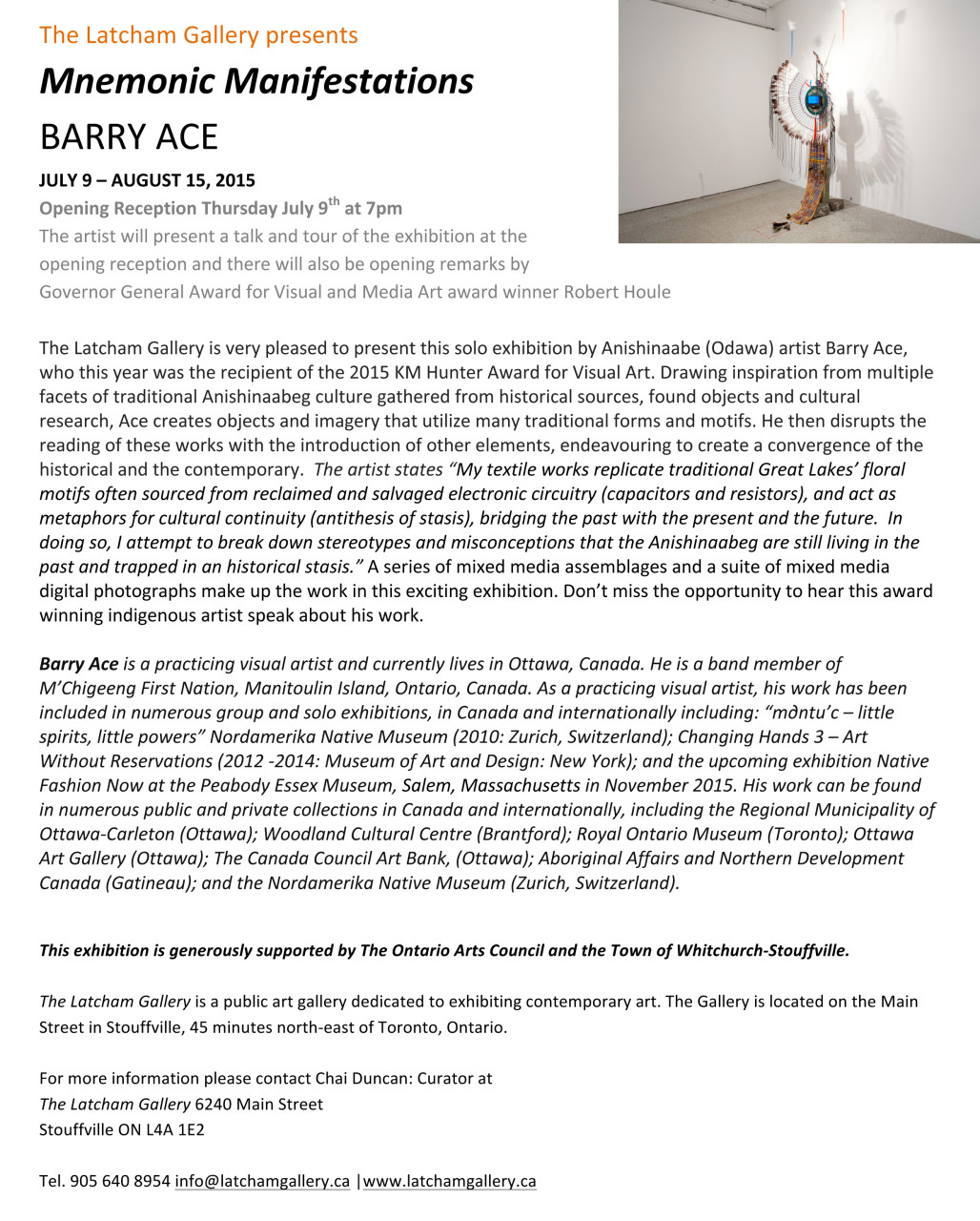 The Latcham Gallery is very pleased to present this solo exhibition by Anishinaabe (Odawa) artist Barry Ace, who this year was the recipient of the 2015 KM Hunter Award for Visual Art.