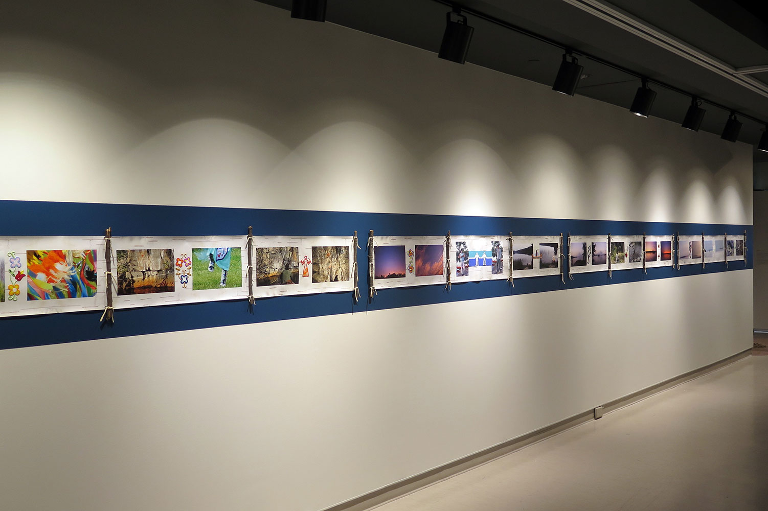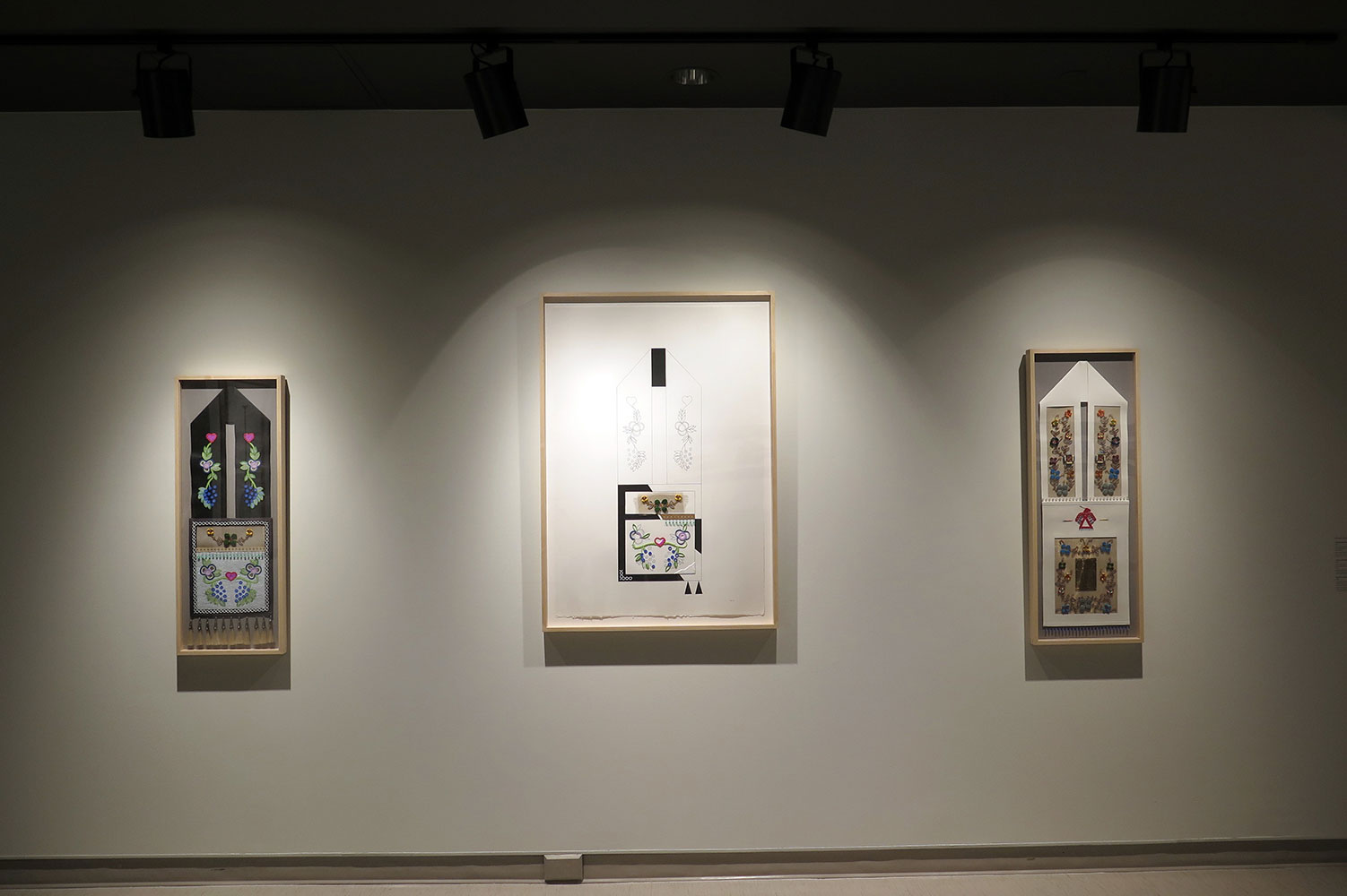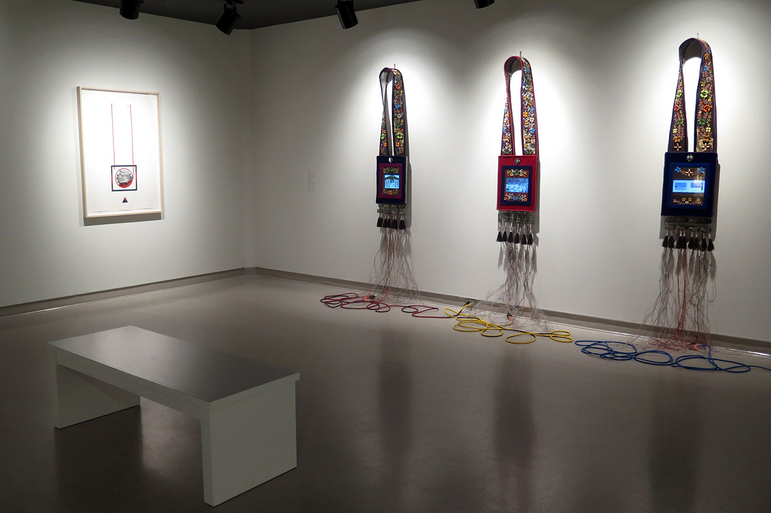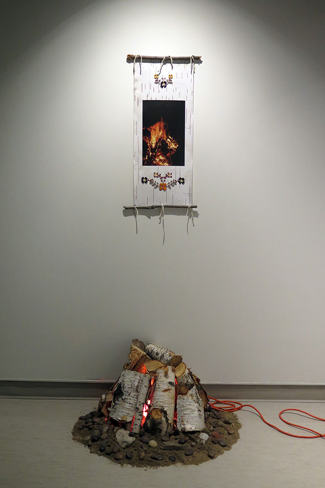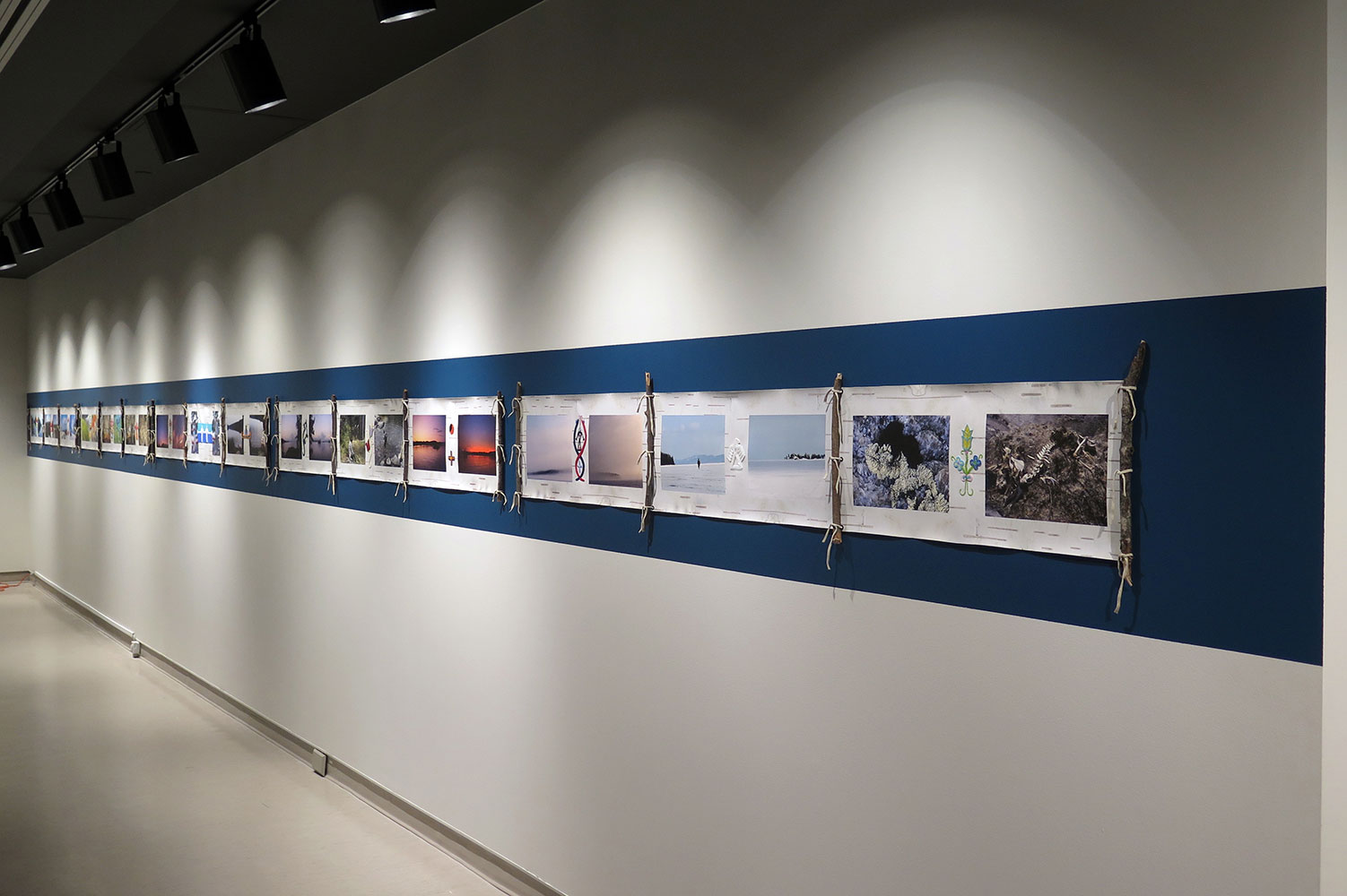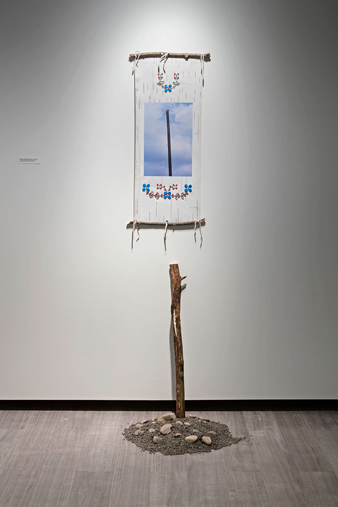 Memory Landscape I (2014), digital print on archival canvas, glass beads, cottonthread, wood, deer hide and metal, 33 x 81 cm each. Collection of the Artist.