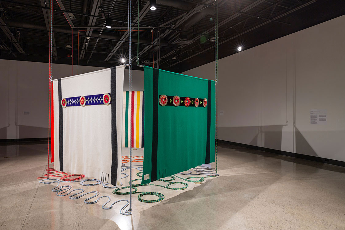 Nayaano-nibiimaang Gichigamiin: The Five Great Lakes (2016) presents an honouring blanket for each of the Great Lakes. By using the Hudson Bay blankets, Ace points to the long narrative of colonization and trade history the blankets have with the peoples of the Great Lakes. The blankets also carry with them culture specific signs and semiotics as they became assimilated into Anishinaabeg material culture. The trade blankets were at one time revered and were offered as highly valued gifts and worn as regalia on important occasions, even fashioned into garments such as coats. When these blankets were decorated with a beaded blanket strip, for instance, they took on an even greater cultural and spiritual significance.