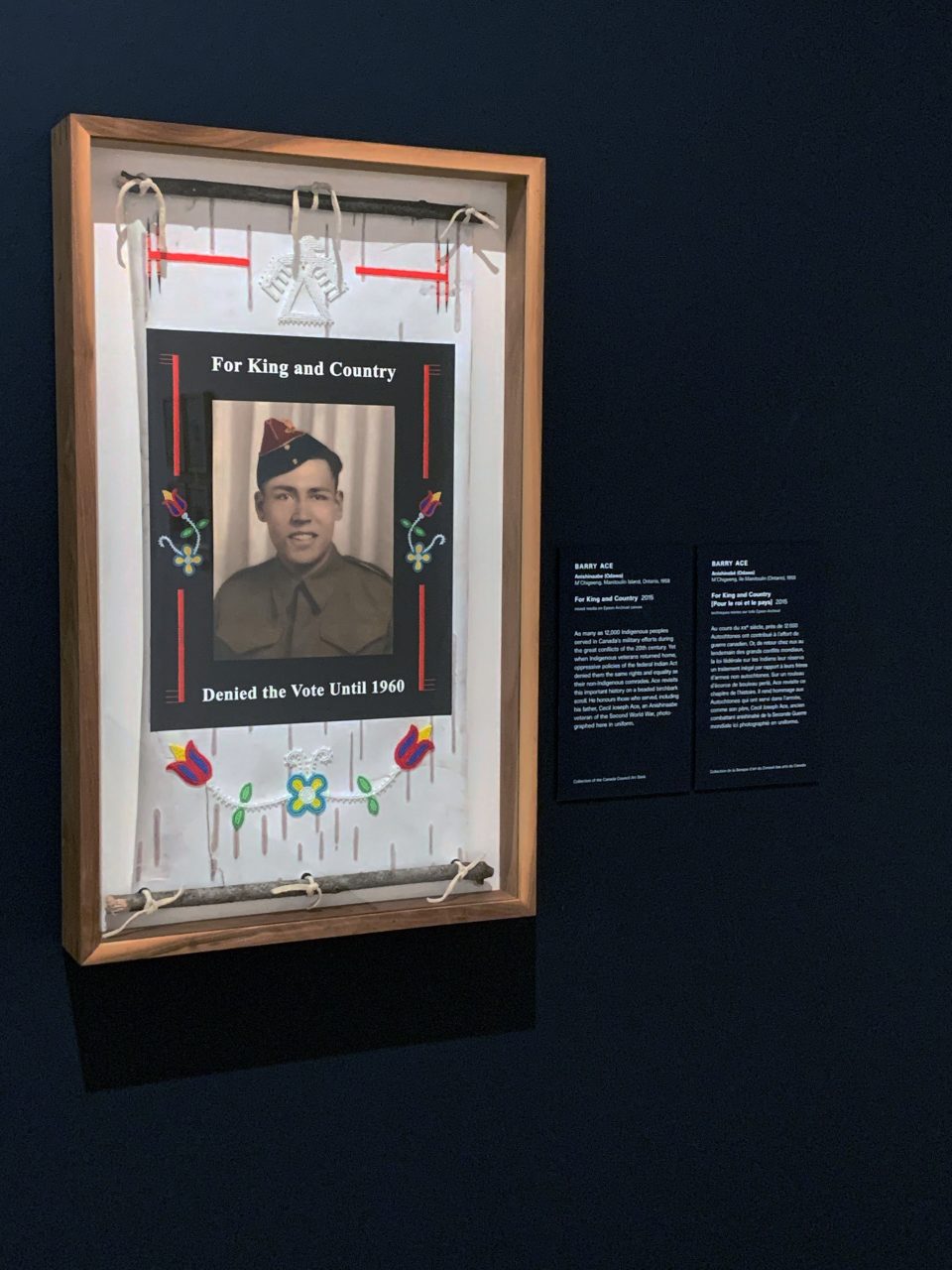 The National Gallery of Canada has installed Ace’s work “For King and Country” in the Canadian and Indigenous Galleries. The work is on a long-term loan from the Canada Council Art Bank Collection who acquired the work in 2016 (more info).