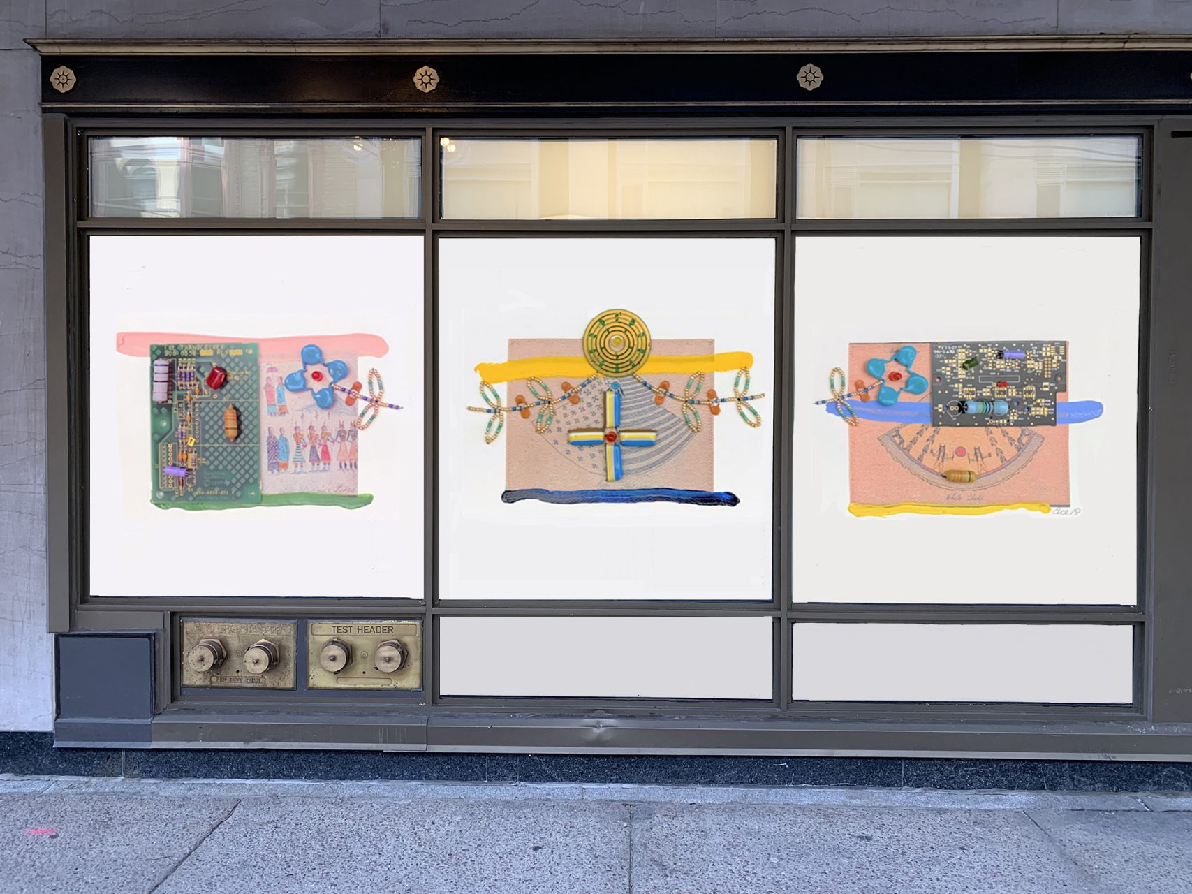 Ace’s mixed media triptych work entitled Shaman’s Medicine Lodge (2019) is reproduced over three storefront windows directly facing Sparks Street pedestrian mall. The work incorporates fragmented drawings of painted medicine lodges and figures engaged in ceremonial activities that is overlaid with electronic circuitry (capacitors, resistors, light-emitted diodes and glass beads) floral motifs replicating beadwork. Traditional floral beadwork designs represent medicines and the glass bead in Anishinaabemowin is called manidoominens (or spirit-energy berry). Like the traditional medicines, and floral glass beadwork that either literally or mythologically release healing energy, these electronic components also store and release energy. There is a powerful simile between the glass bead and electronic component. The Shaman’s activities are also dependent on energy and medicine and the triptych work with the overlaying and connected motifs unite and bring together all these elements of power in art, science, medicine and technology.
