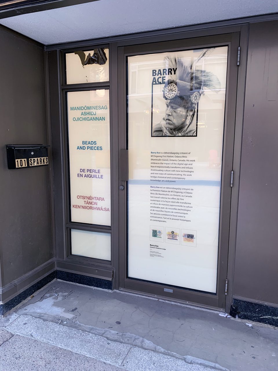 Throughout the year, the City of Ottawa curate public art exhibitions from their permanent art collection and install photographic reproductions of these works throughout the city in public spaces, including vacant storefront buildings. The Birks building on historic Sparks Street is the site for the exhibition Beads and Pieces. This exhibition focuses on the use of beadwork contemporary Indigenous art and includes three artists: Barry Ace (Anishinaabe), Nadia Myre (Anishinaabe) and Shelby Lisk (Kanyen’kehá:ka).