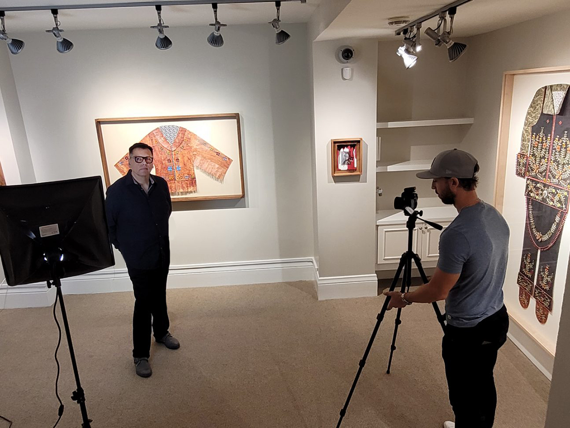 Video documentation at Heffel Montreal. Barry Ace, Artist and Blake Barkwell, Videographer. Photo Courtesy of Heffel.