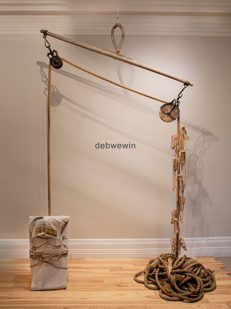 How can you expect me to reconcile, when I know the truth? (2018),wood, hemp rope, metal, linen, organza, bronze screen, electroniccomponents, glass beads, deer hide, cotton thread, vinyl, 284.5 x 271.8 x 134.6 cm. McMichael Canadian Art Collection.
