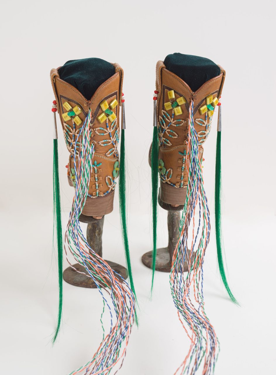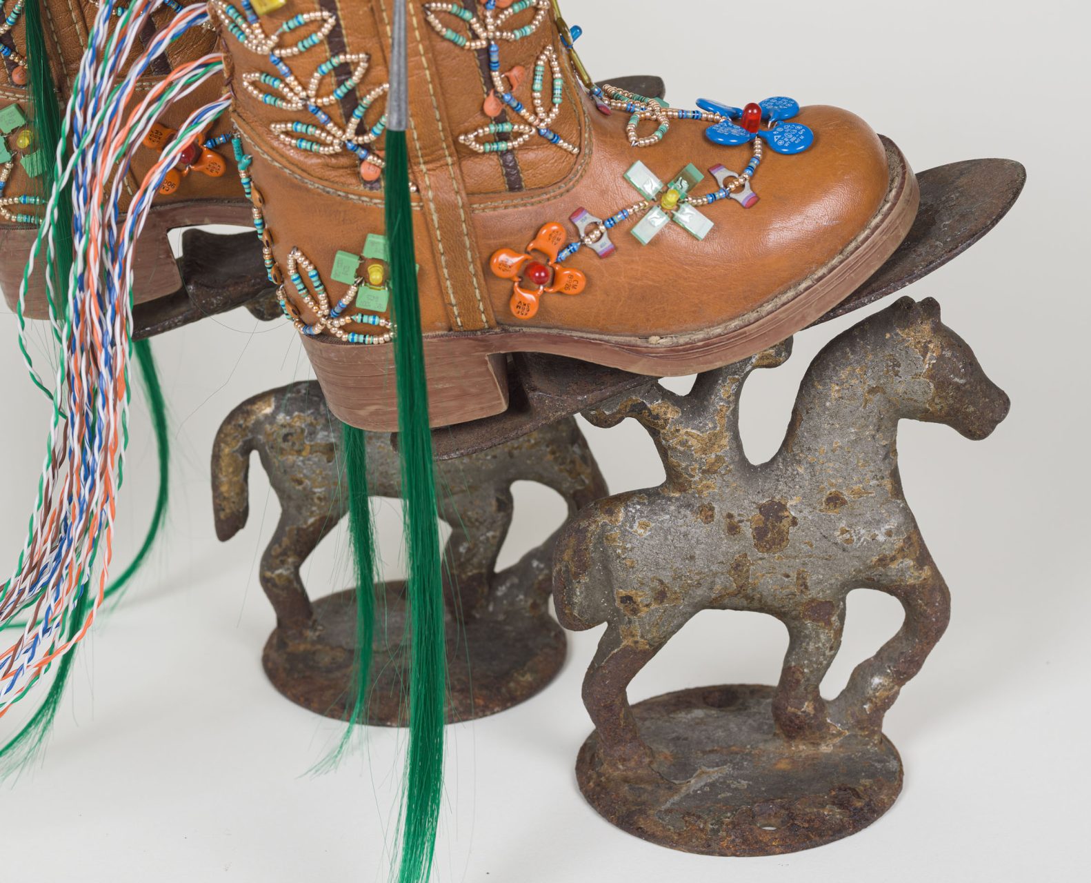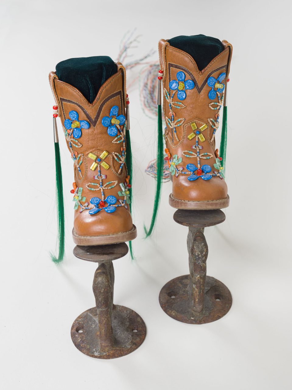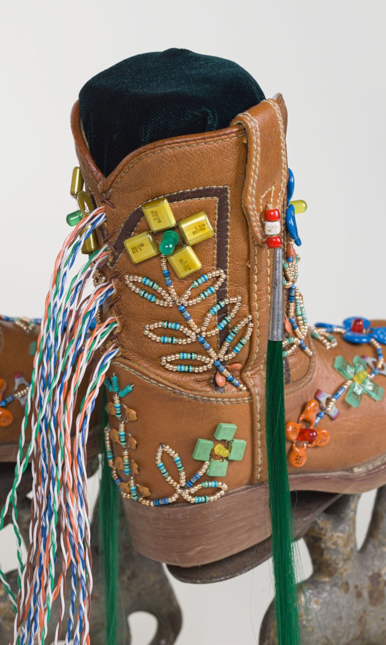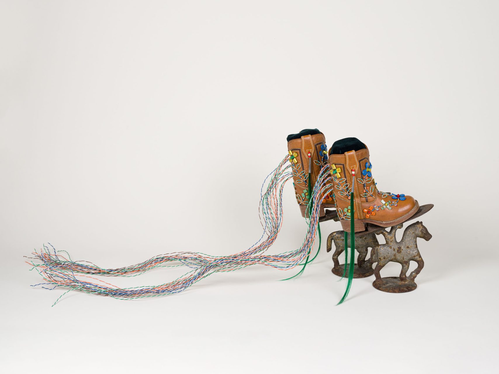 Gwiiwzens Dreamed of Spirit Horses (2023) Found child's cowboy boots, vintage Cobbler's shoe rests, glass-beads, electronic components, coated wire, tin cones, synthetic hair 35.7 x 12.7 x 66 cm. Collection of the Artist. On loan to the Bata Shoe Museum (Toronto).