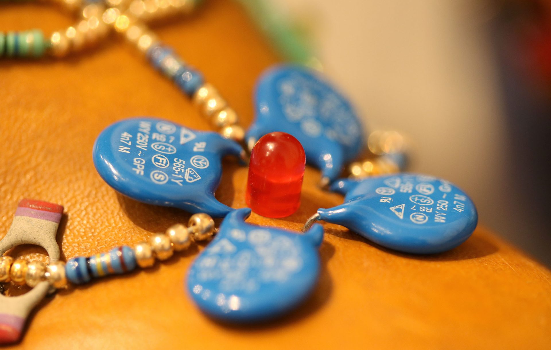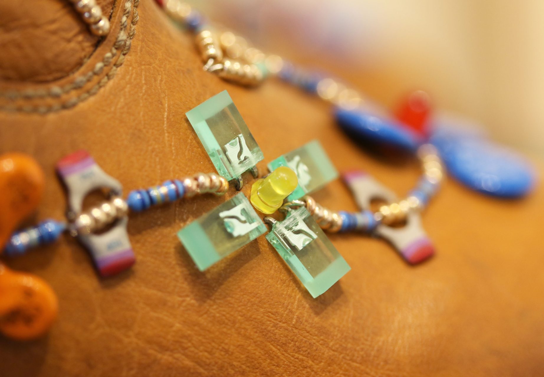 Gwiiwzens Dreamed of Spirit Horses (2023) is a sculptural assemblage work consisting of a found pair of children’s cowboy boots that Ace embellished with his signature electronic component and glass bead medicine flower motifs. The small boots rest on top of two vintage stylized galloping silver horse cobbler shoe rests. The wire fringe extending out from the back of the boots reference the erasure of the Ojibwe Spirit Horses and public awareness of the brutal colonial history that attempted to eradicate them. The title of the work implies an element of optimism for the future, as Gwiiwzens (the young boy) dreamed of the return of these Spirit Horses.