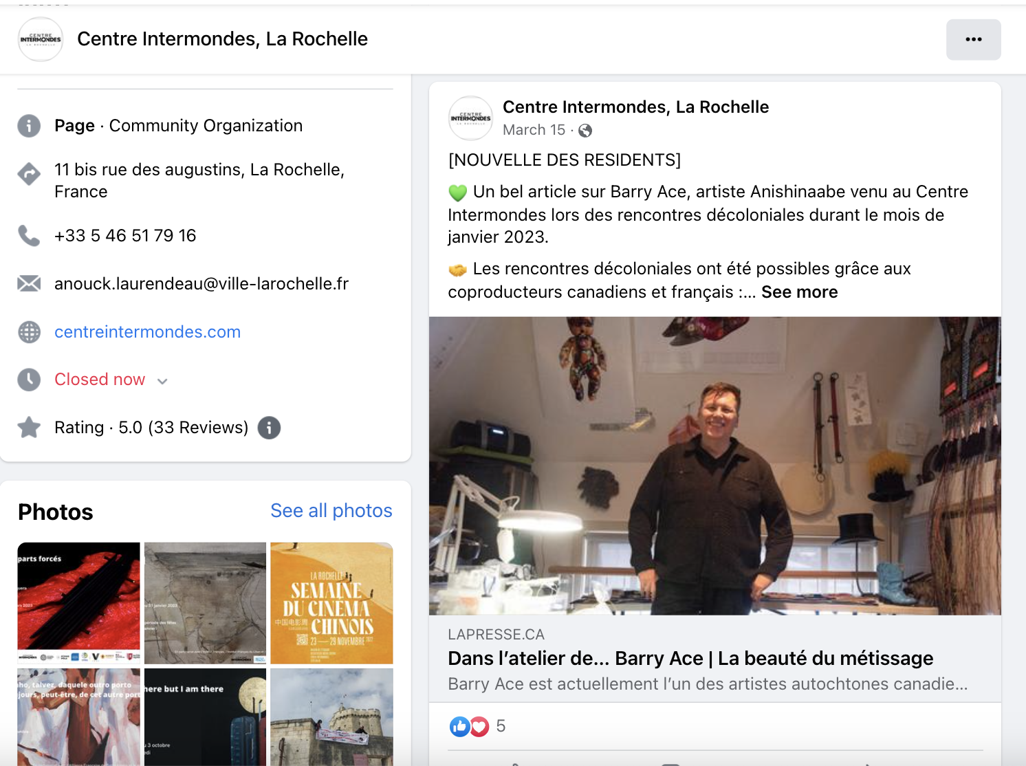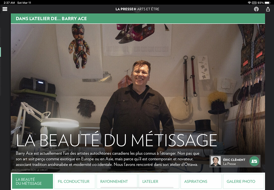 “Barry Ace est actuellement l’un des artistes autochtone canadiens les plus connus à l’étranger. Non pas que son art soit perçu comme exotique en Europe ou en Asie, mais parce qu’il est contemporain et novateur, associant tradition anishinaabée et modernité occidentale. Nous l’avons rencontré dans son atelier d’Ottawa.” Éric Clément