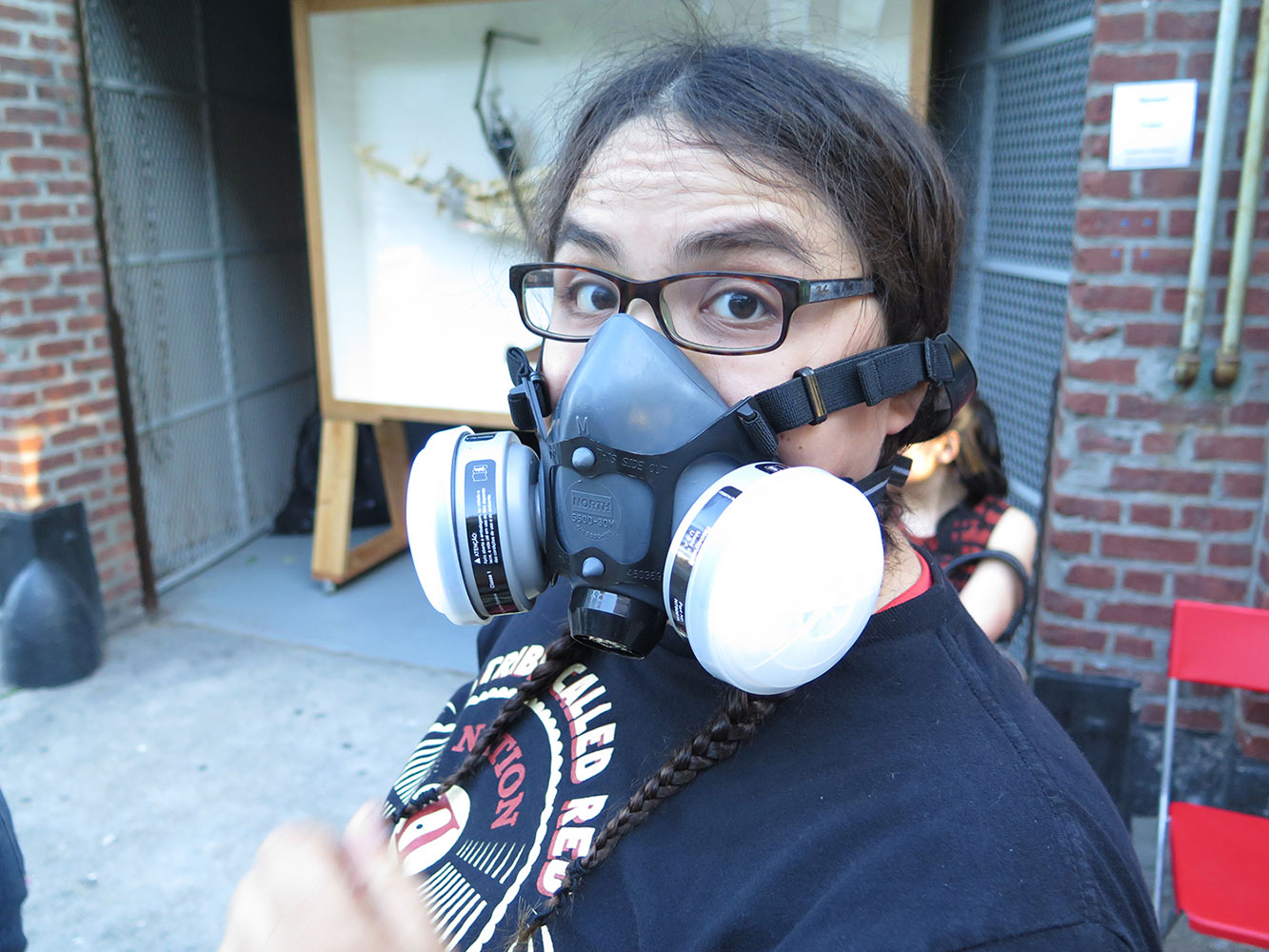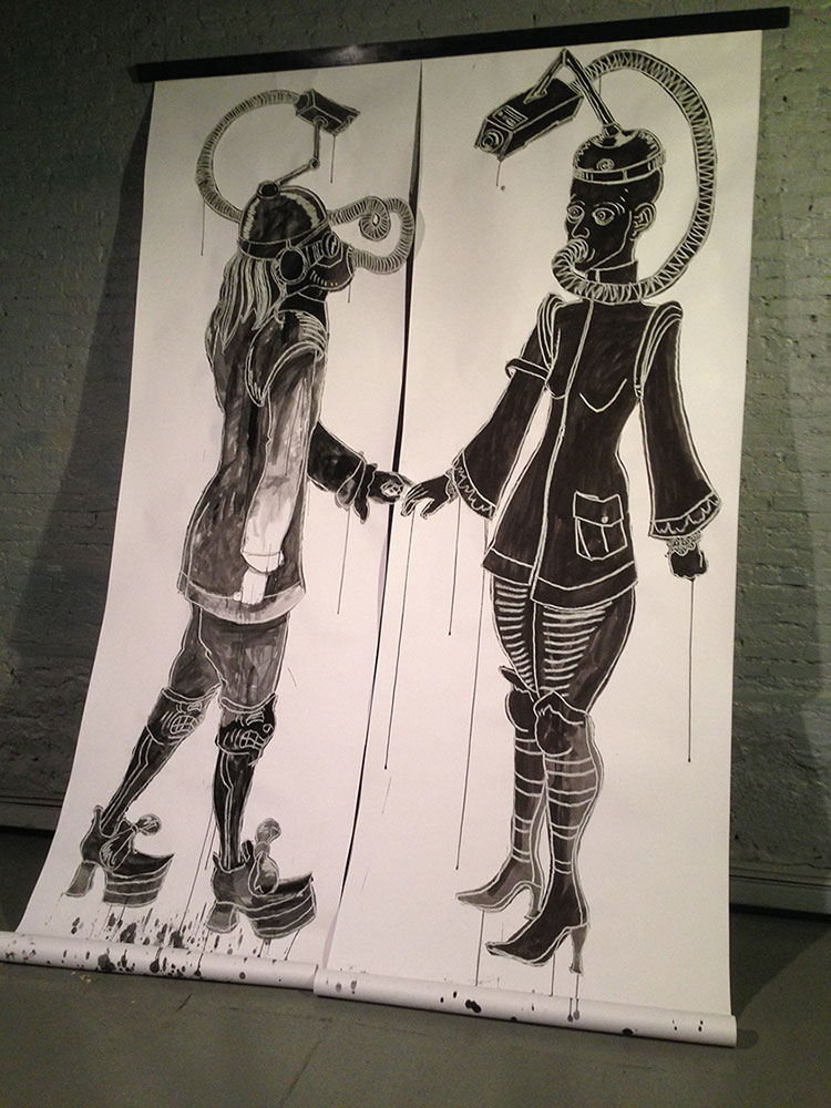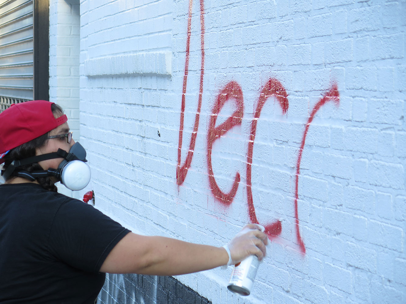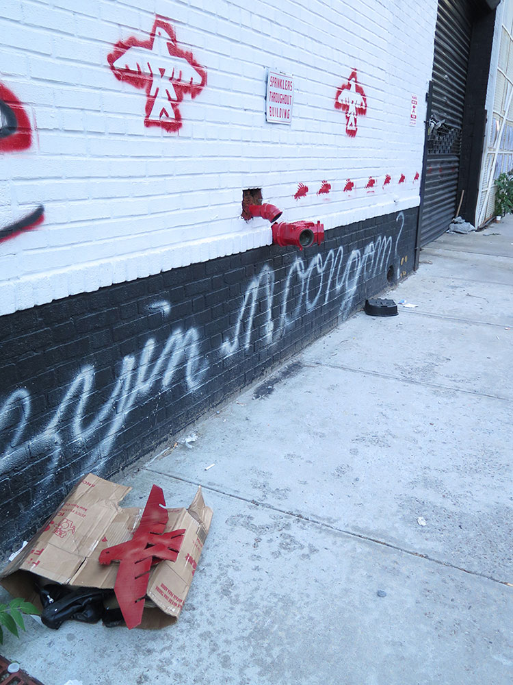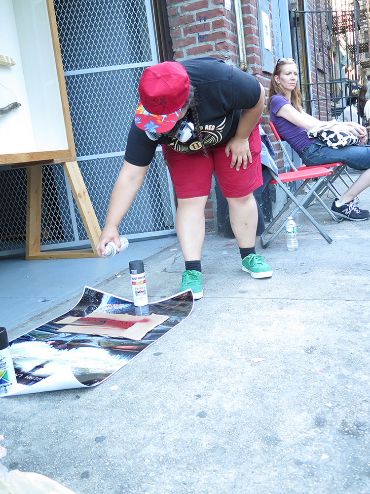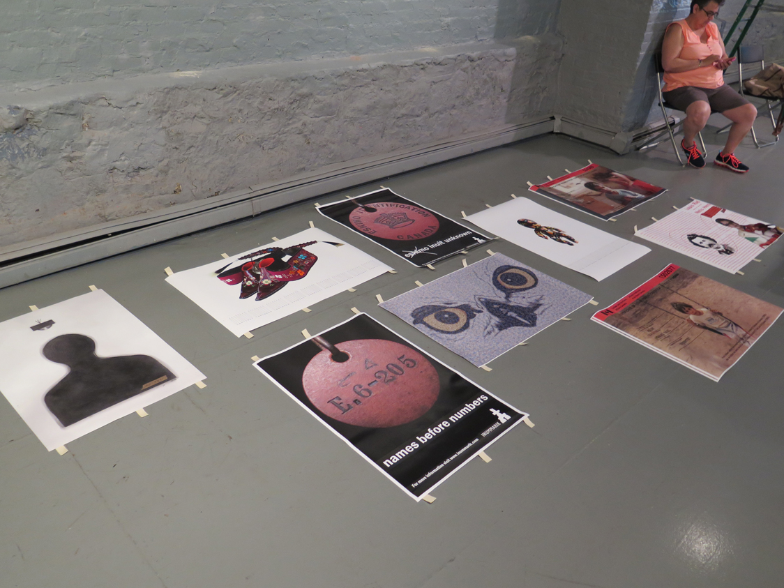 The OO7 undertook a Skype conversation with artCodex to develop the theme for the exhibition and additional public programming that included a film screening of works by artCodex members and guests and OO7 participants Howard Adler and Ariel Smith. In order to keep costs down, since the OO7 do not apply for grant assistance, each artist created a thematic work addressing issues revolving around surveillance in the form of a large poster format. This allowed the OO7 to travel to New York with the rolled poster work. The work was installed with the artCodex work and the exhibition ran from June 7th to June 22nd, 2014. An impromptu site-specific tagging performance on St. John Street ensued upon completing her work on-site by OO7 Special Agent Melody McKiver.