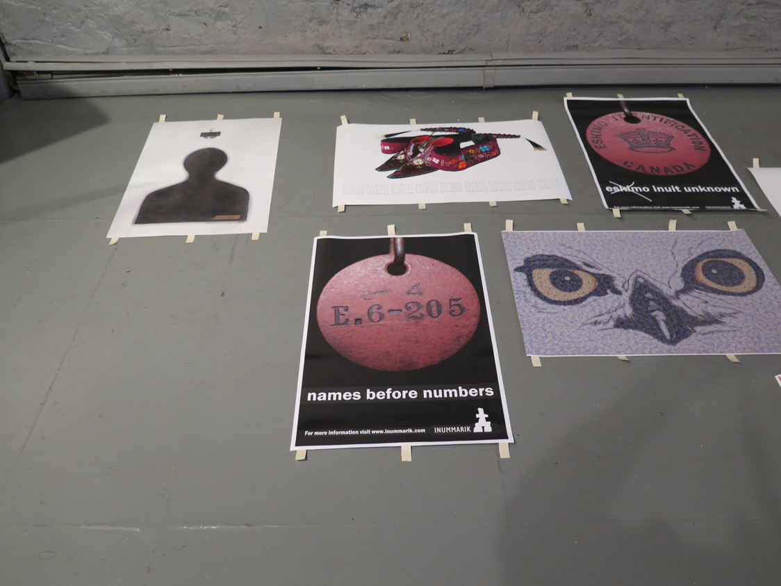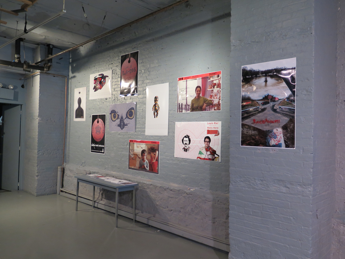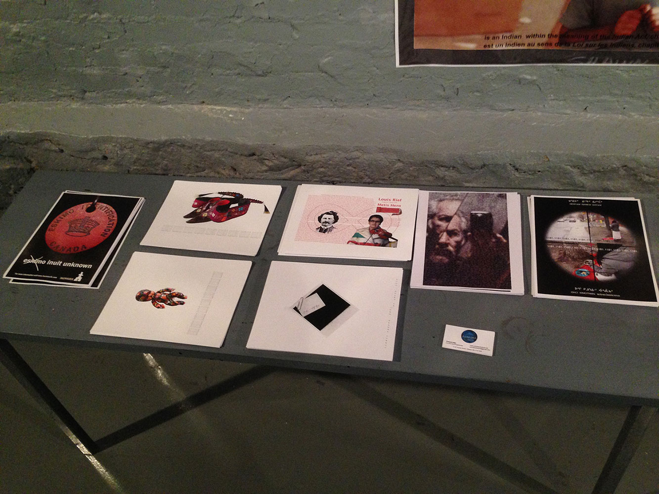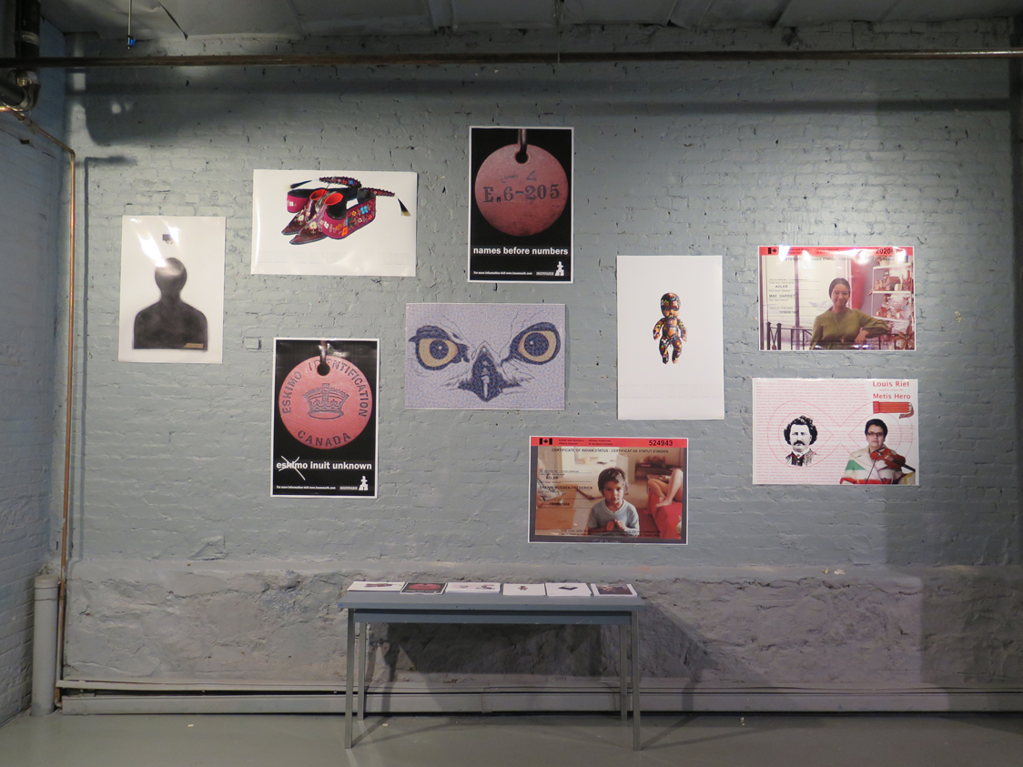 OO7 artist Ron Noganosh created work entirely composed of microscopic images of surveillance camera’s reassembled as pixels to form the images of human and bird (owl) eyes, while Leo Yerxa’s graphite shadowy figure with the surveillance camera directly above referenced the onset of an Orwellian age. A small strip of masking tape affixed to the work with a code written in ink OG-4891 (1984 – George Orwell). Ace’s reworked his iconic image of the Baby Warrior and Otter Tail moccasins underscored with a numeric binary code text spelling out the word Footprint. Ariel Smith’s looped a static surveillance video shot outside her window on a small flat tablet, while Barry Pottle’s Inuit disc numbers assigned to Inuit in the Canadian North was juxtaposed against Howard Adler’s Indian Status Card with assigned numbers for himself and his brother. Rosalie Favell’s work was based on the Metis leader Louis Riel who was stocked and surveilled by the Canadian Government officials in the late 1800s. Riel was eventually tried for treason and brutally executed.