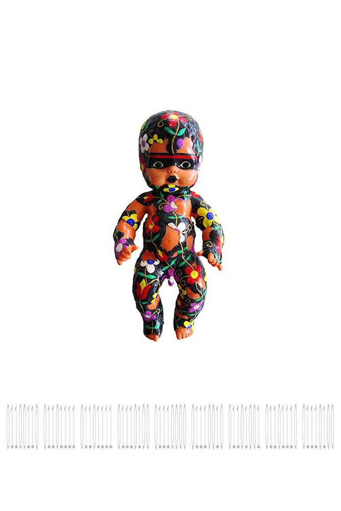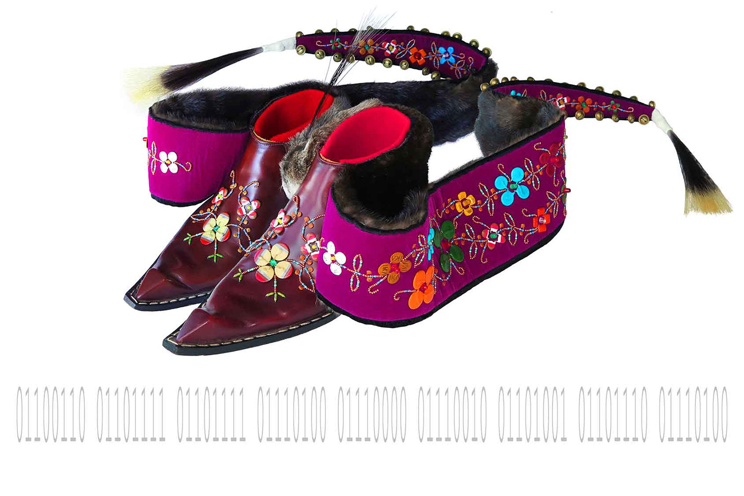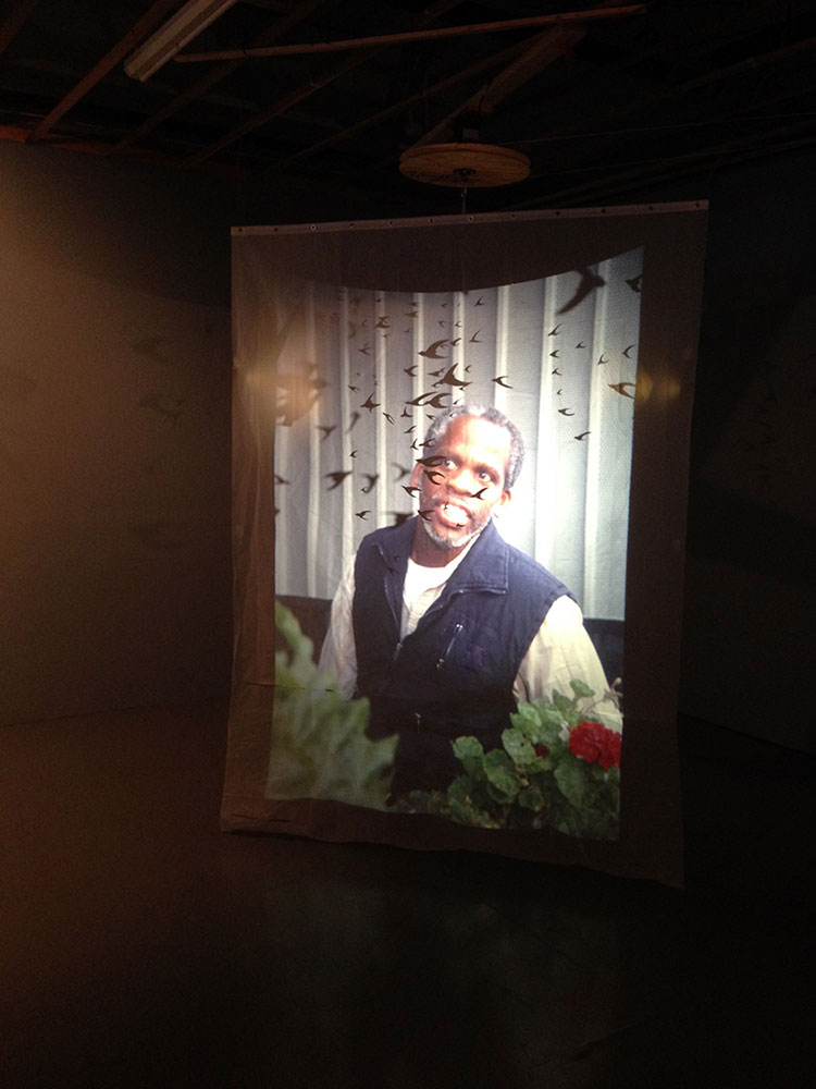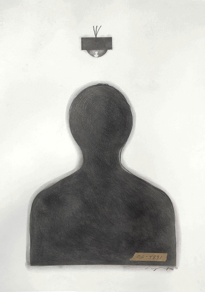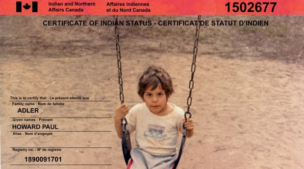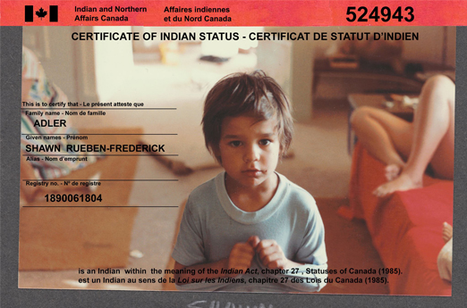 OO7 artist Ron Noganosh created work entirely composed of microscopic images of surveillance camera’s reassembled as pixels to form the images of human and bird (owl) eyes, while Leo Yerxa’s graphite shadowy figure with the surveillance camera directly above referenced the onset of an Orwellian age. A small strip of masking tape affixed to the work with a code written in ink OG-4891 (1984 – George Orwell). Ace’s reworked his iconic image of the Baby Warrior and Otter Tail moccasins underscored with a numeric binary code text spelling out the word Footprint. Ariel Smith’s looped a static surveillance video shot outside her window on a small flat tablet, while Barry Pottle’s Inuit disc numbers assigned to Inuit in the Canadian North was juxtaposed against Howard Adler’s Indian Status Card with assigned numbers for himself and his brother. Rosalie Favell’s work was based on the Metis leader Louis Riel who was stocked and surveilled by the Canadian Government officials in the late 1800s. Riel was eventually tried for treason and brutally executed.