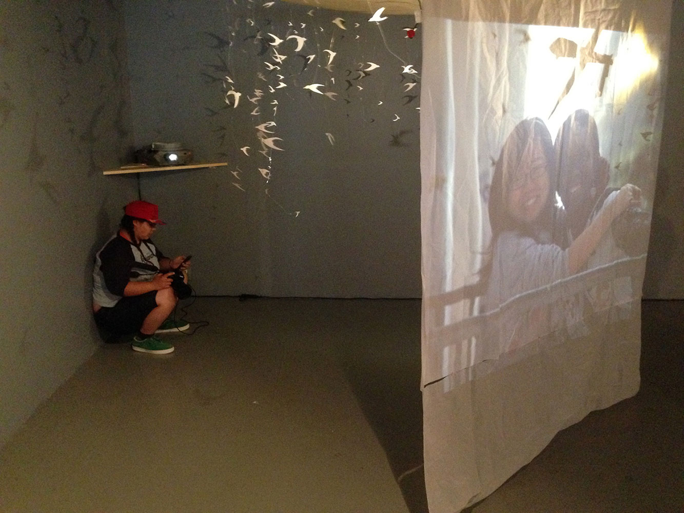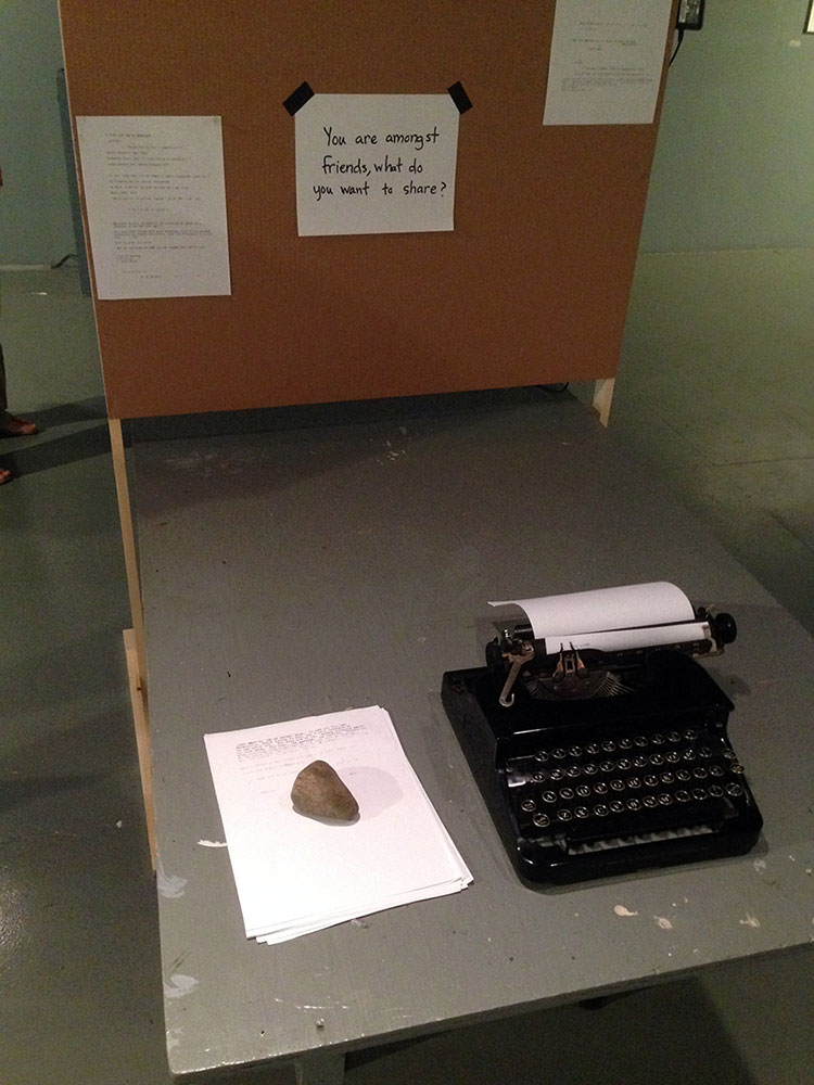 Some of the works in the exhibition included “You Are Amongst Friends”, an interactive installation investigating trust in the face of increasing government and corporate observation, led by artCodex: On one side of the gallery space is a sign notifying visitors they are being watched. Participants are invited to sit at a computer and reply to the question, “What do you work hardest to keep secret?” The opposite side of the gallery holds a manual typewriter with the sign, “You are amongst friends, what do you want to share?” The contents of each was displayed and shared publicly.