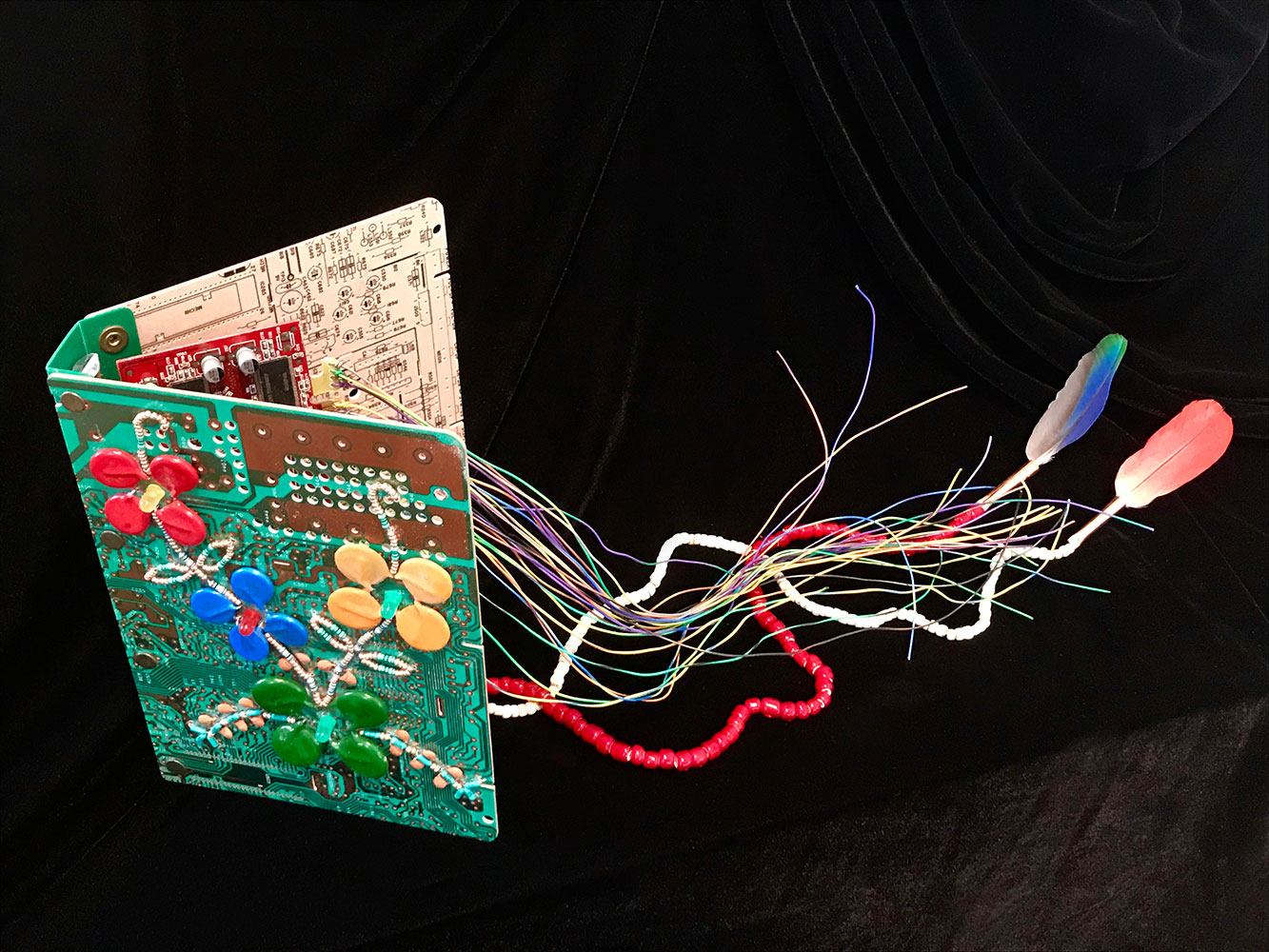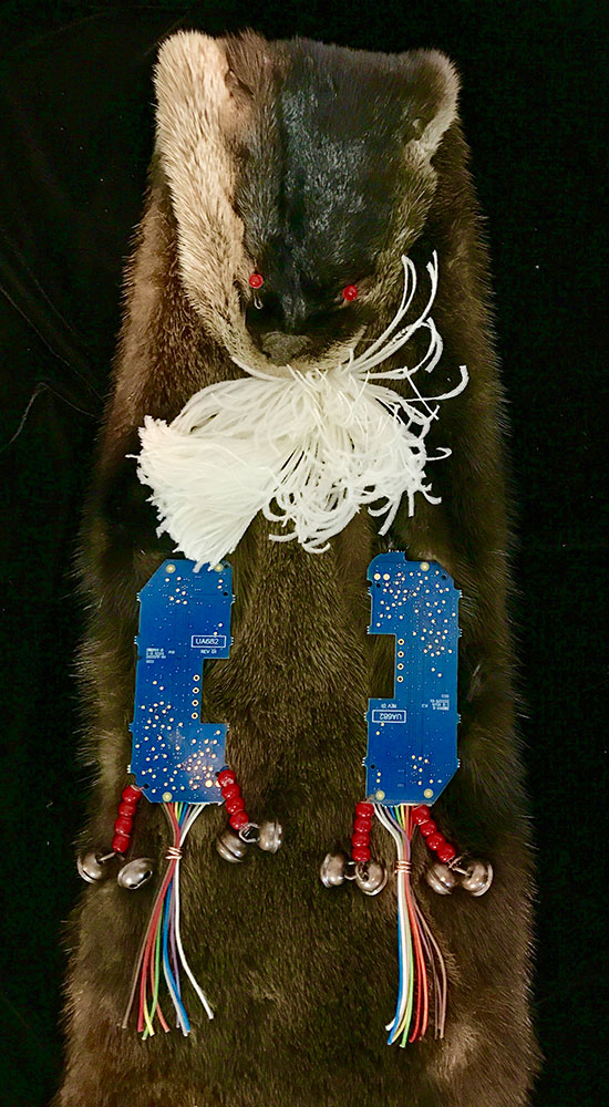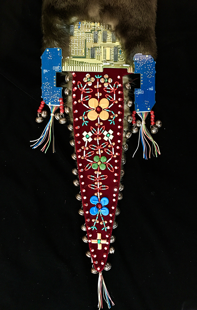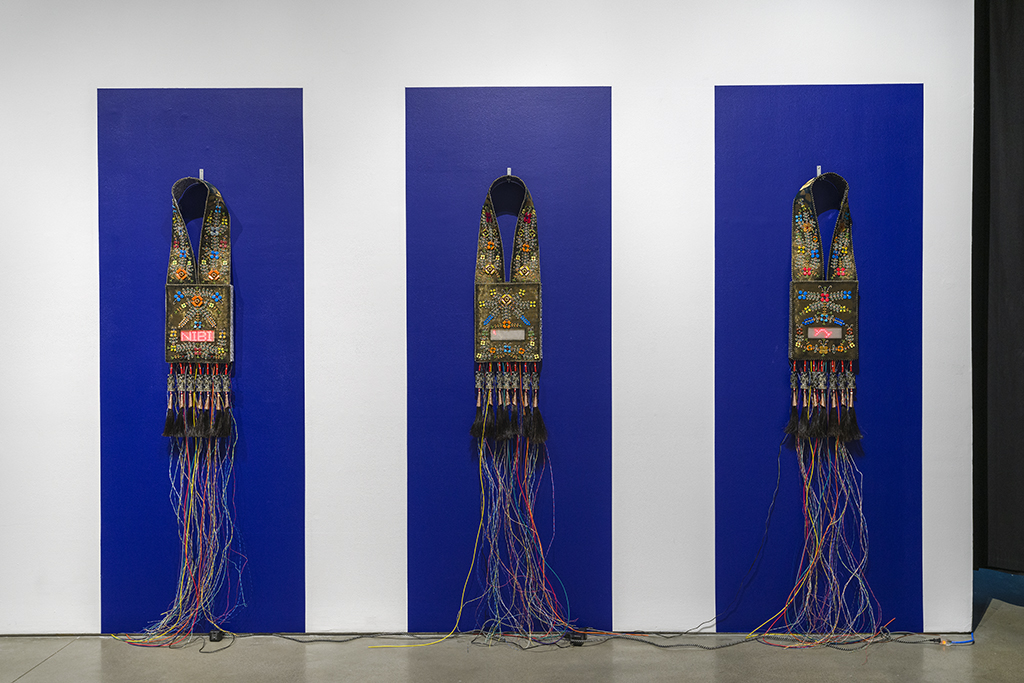 Barry Ace, trinity suite: Bandolier for Niibwa Ndanwendaagan (My Relatives); Bandolier for Manidoo-minising (Manitoulin Island); Bandolier for Charlie (In Memoriam), 2011-2015 Mixed media (motion sensor display monitors, fabric, metal, horsehair, extension cords, mirror, plastic, capacitors and resistors), overall installed: 207 x 95 x 53 cm Collection of the Art Gallery of Ontario, Toronto -