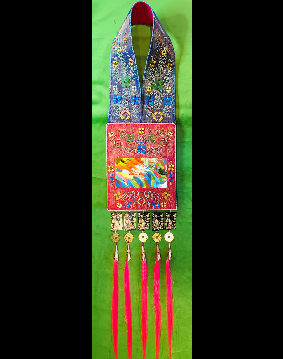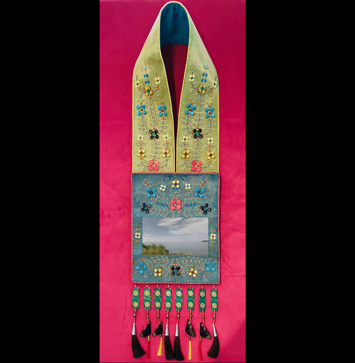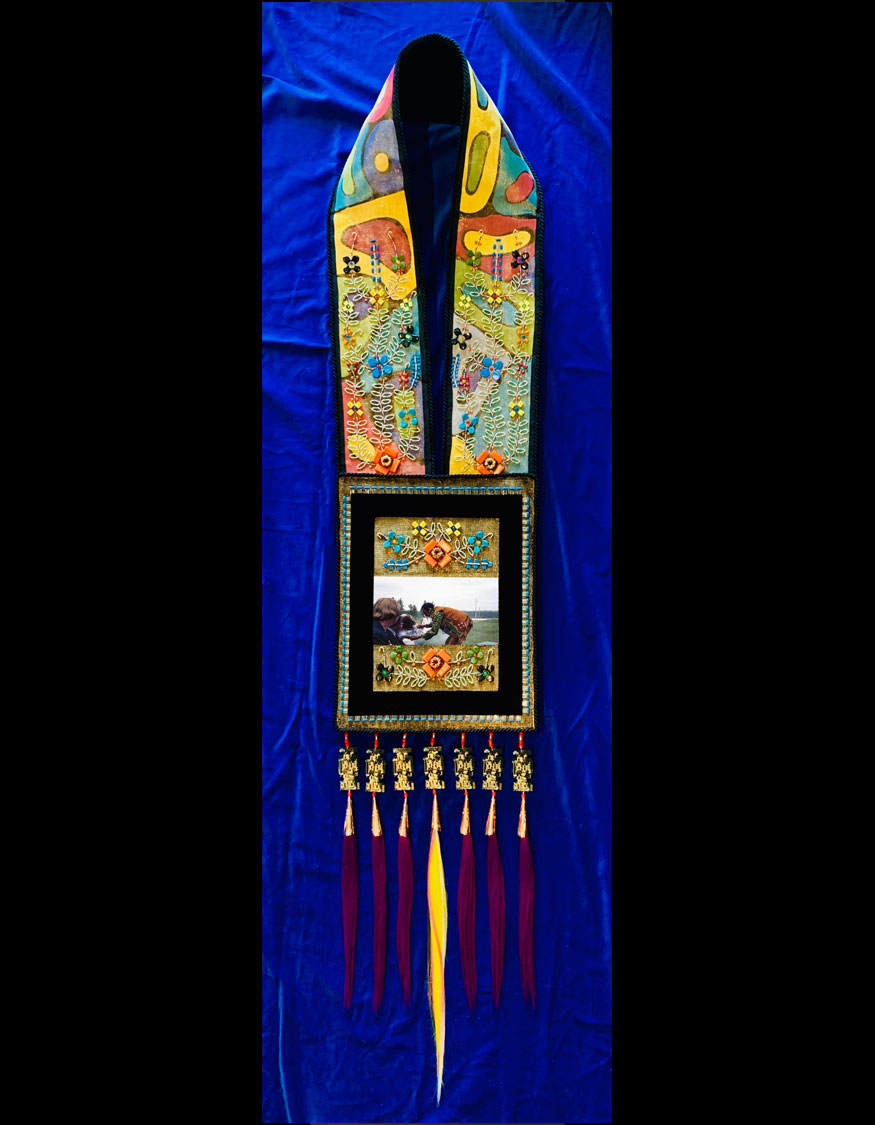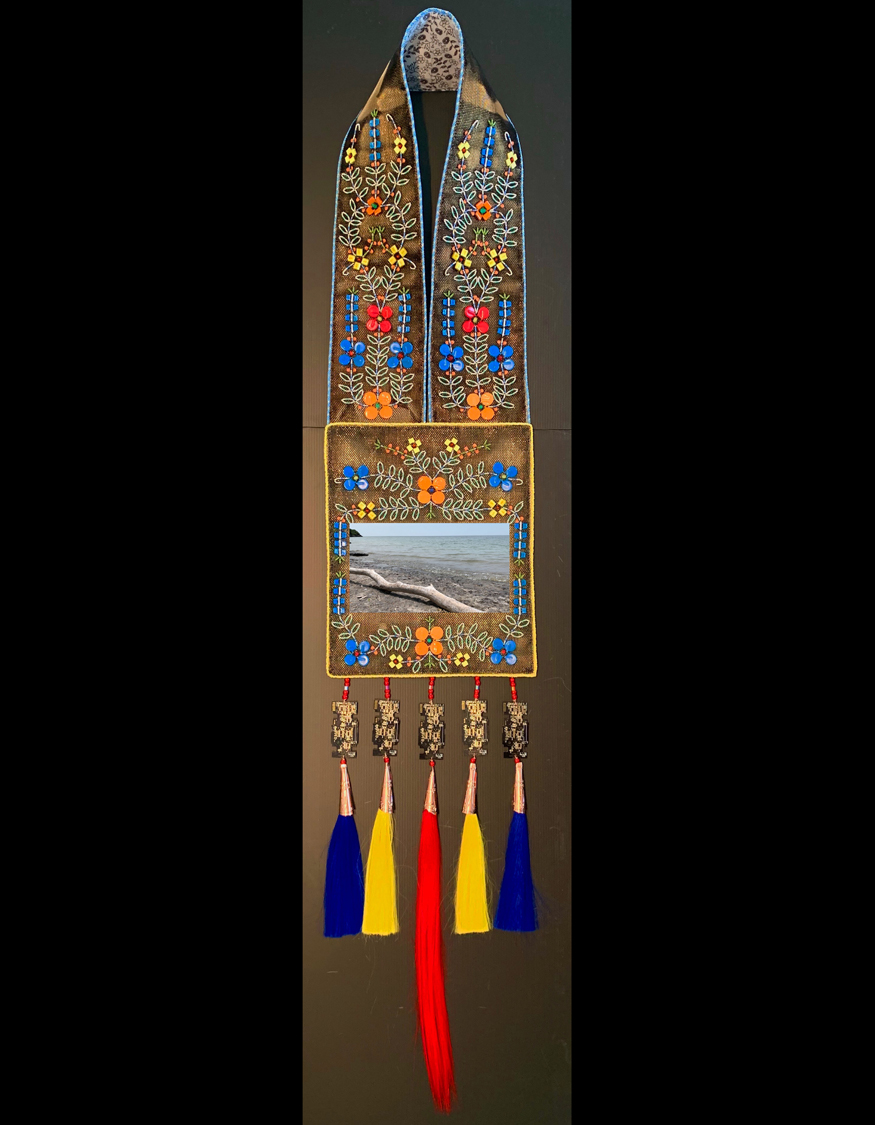 Bandolier for Niimi'idiwin (Powwow) (2019) mixed media 108 x 29 x 11 cm with still photographs. Private Collection (Ontario). -