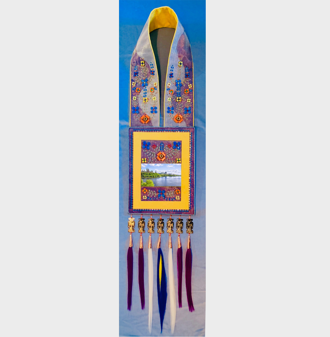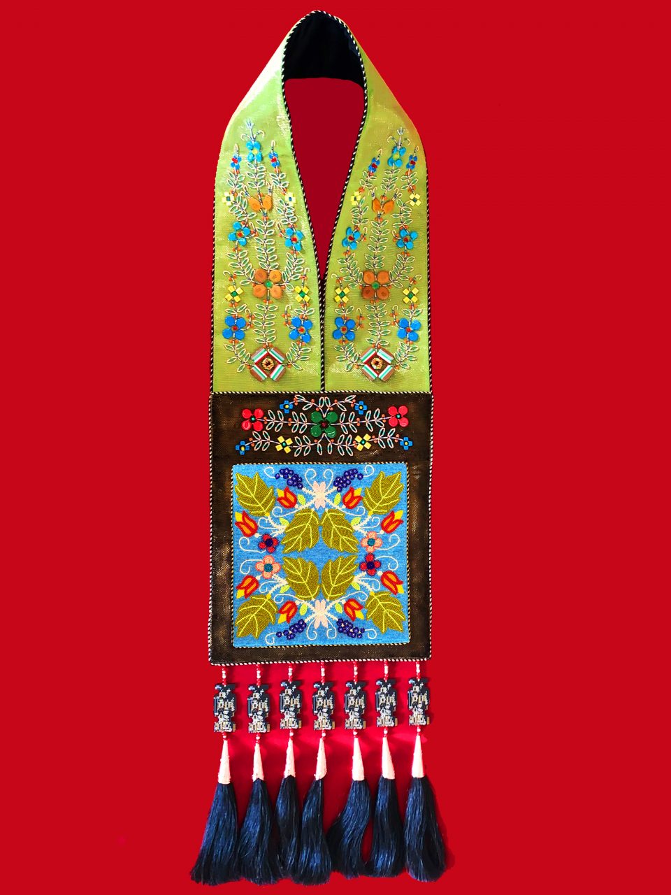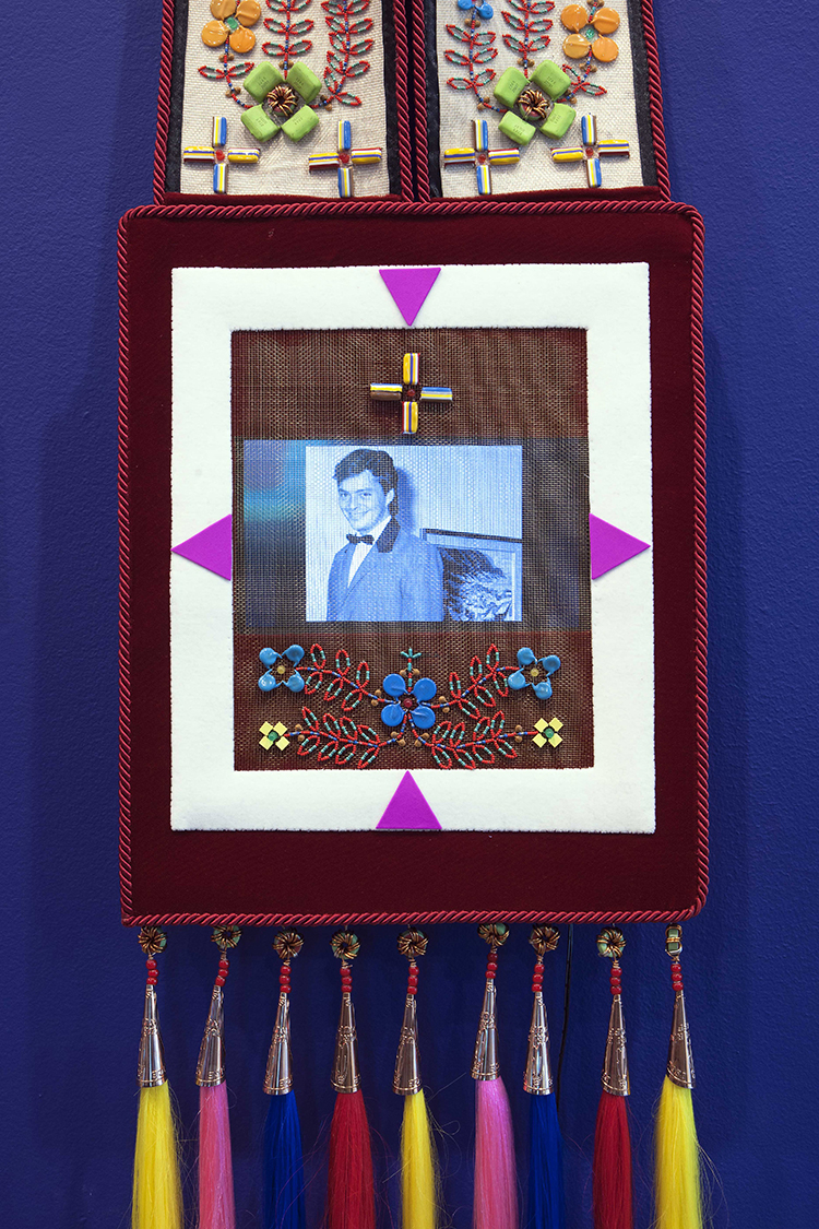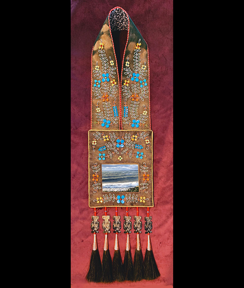 Bandolier for Niimi'idiwin (Powwow) (2019) mixed media 108 x 29 x 11 cm with still photographs. Private Collection (Ontario). -
