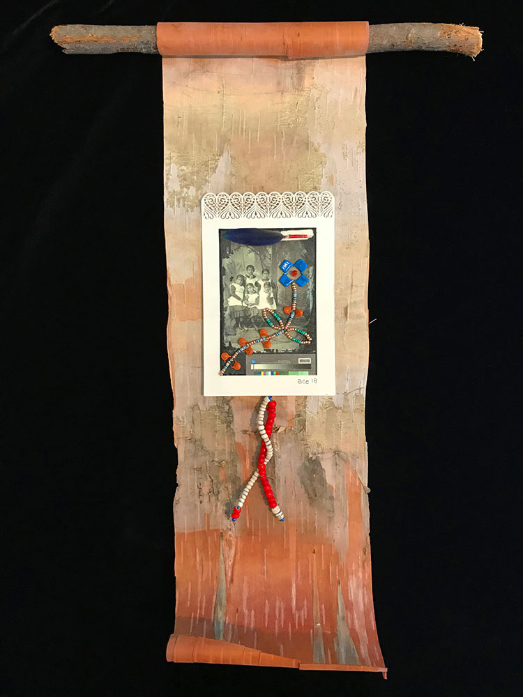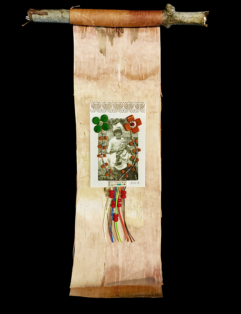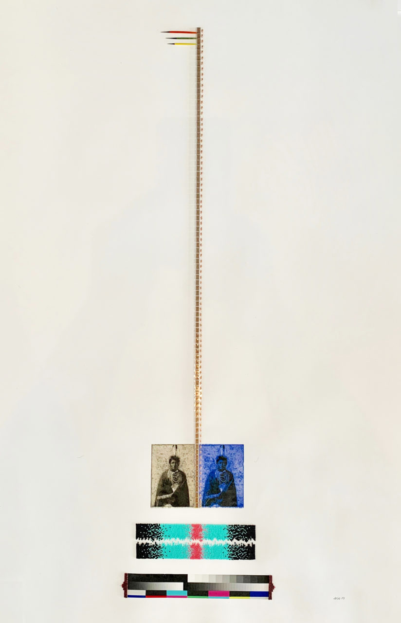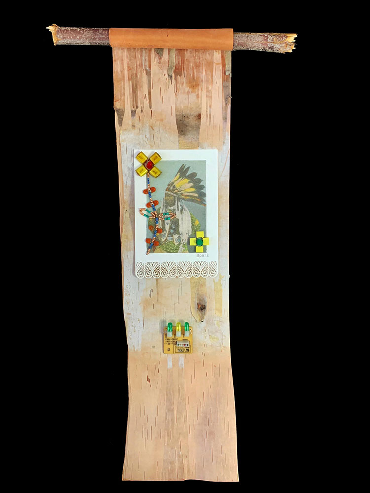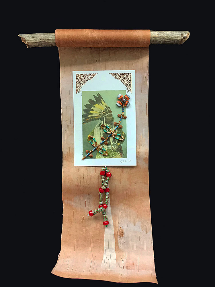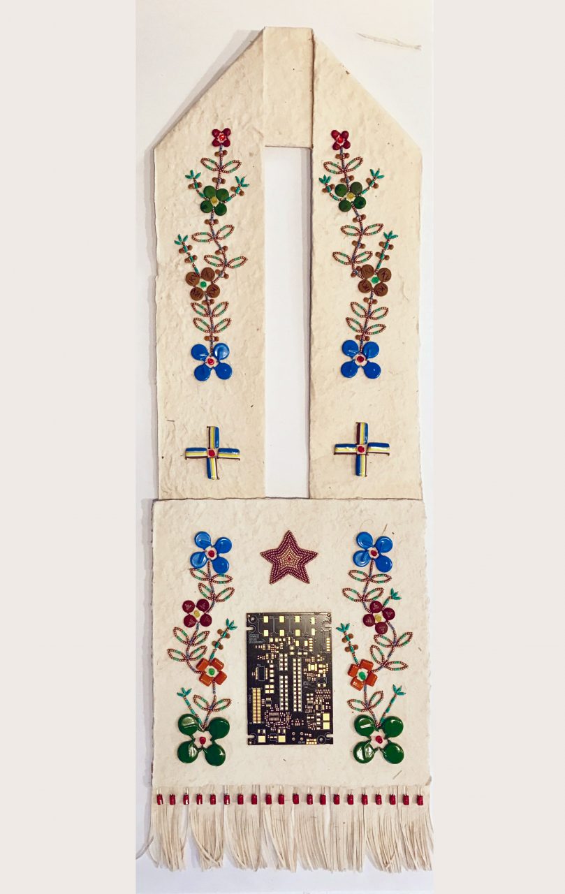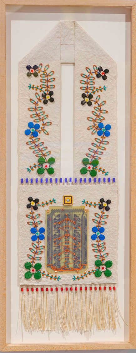 Bandolier for Anongonse (2017) 83 (h) x 38 (w) cm, mixed media on hand-made paper. Private Collection (M'Chigeeng). -