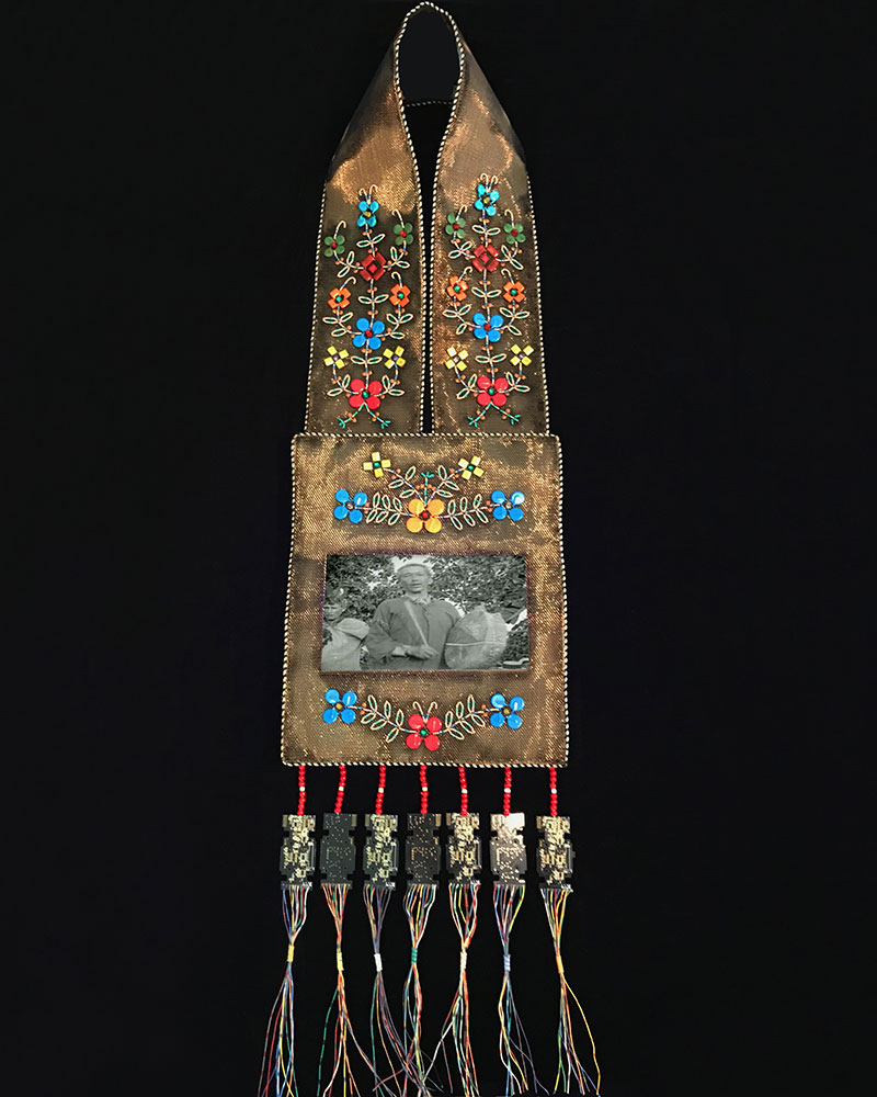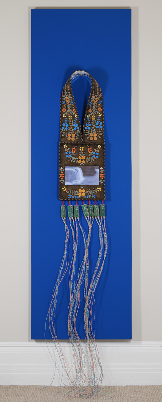 Bandolier for Norval Morrisseau (2019) mixed media 180 x 38 x 15 cm digital screen with still photographs. Collection of Westerkirk Works of Art (Toronto). -