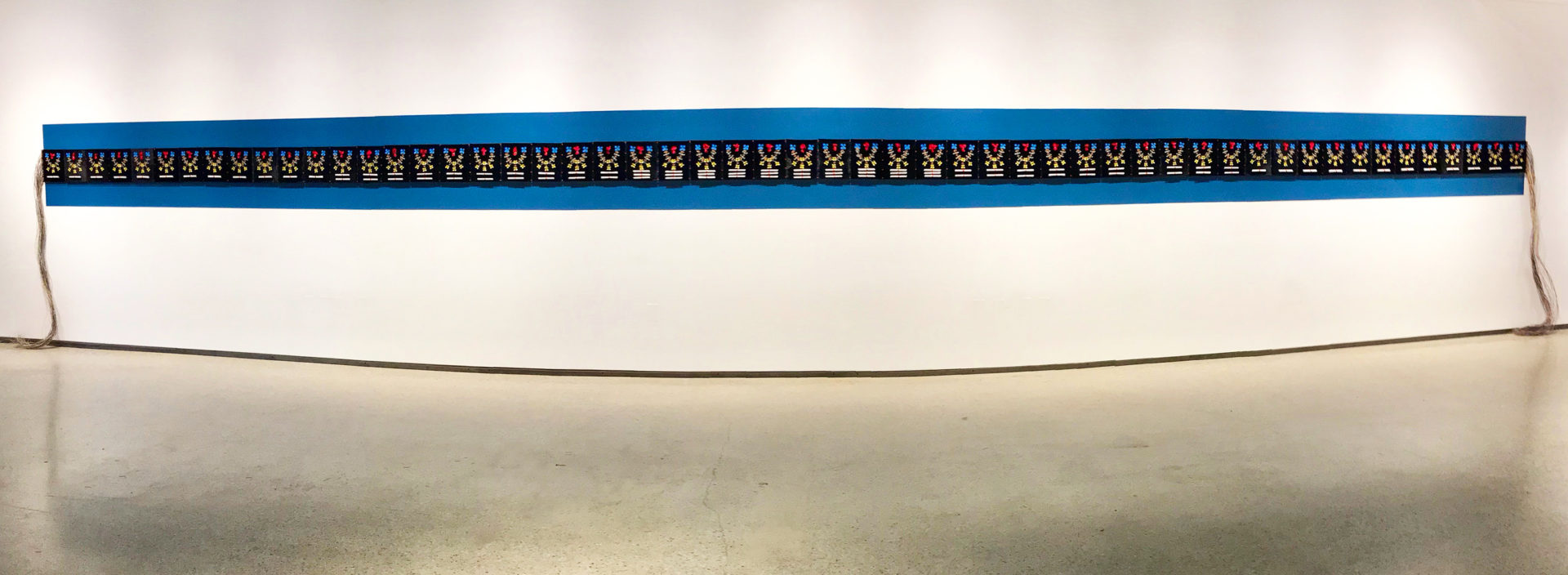 For as long as the sun shines, the grass grows and the river flows (2018), canvas, wood, velvet, metal, electronic components, glass beads, cotton, tobacco, vellum, graphite, paper, cotton thread, copper, wire.11.5 metres (l) x 178 (h) cm. Collection of the Artist. Photo taken University of Windsor (2018). -