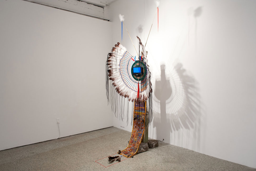 Fox Tail Moccasins (2016) Each 17.78 x 22.86 x 104.14 cm, mixed media. McMichael Canadian Art Collection (Kleinburg, Ontario). Photo: Courtesy of Heffel. -