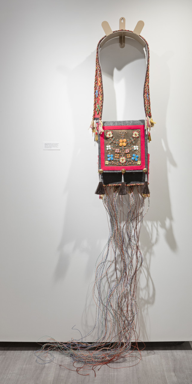 Aazhooningwa'igan “It is worn across the shoulder” (2015) 210(h) x 40(w) x 11(d) cm, mixed media. Collection of Canadian Museum of History (Gatineau). -