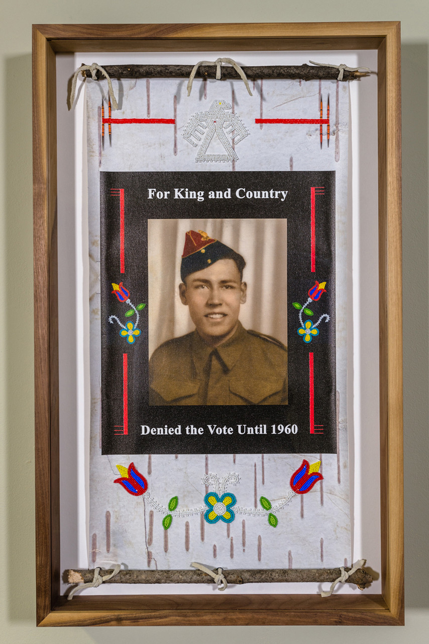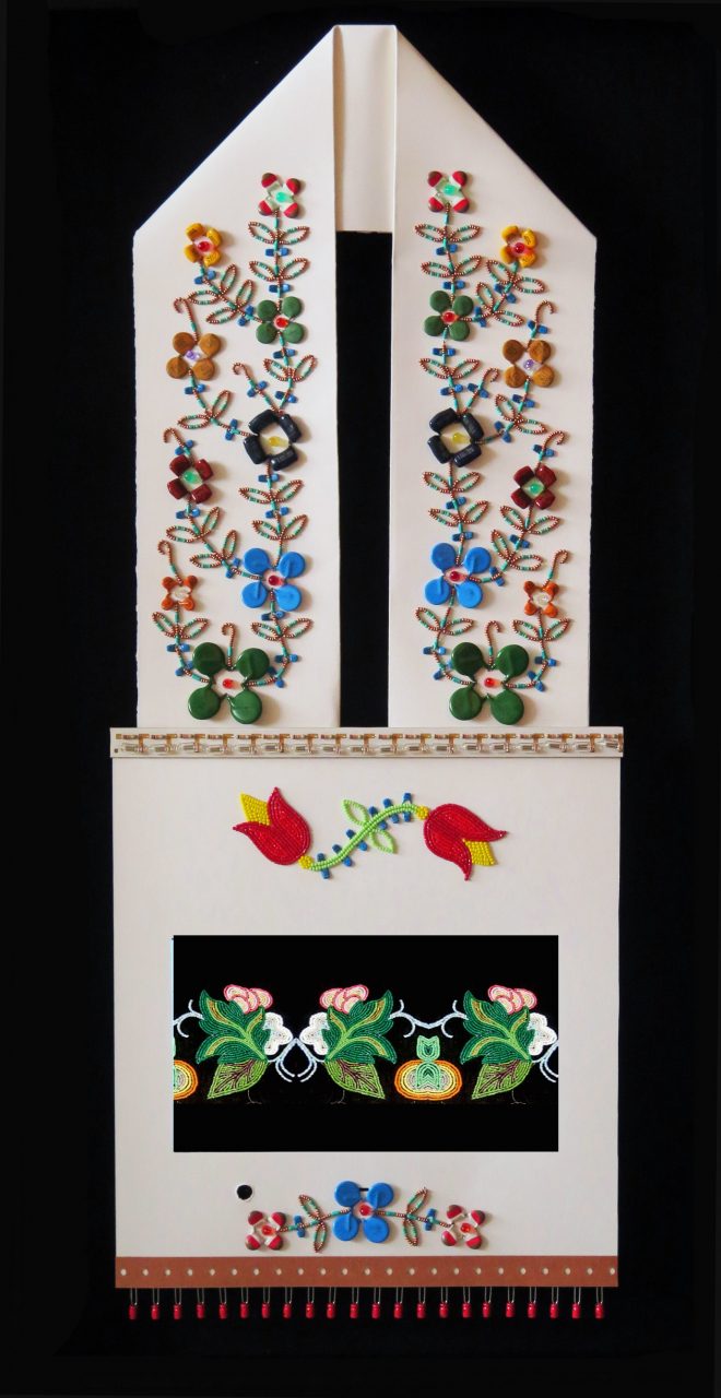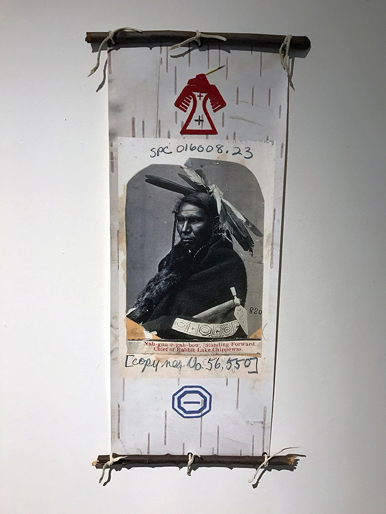 Honouring Scroll for Nahgunegahbow (2016) 33 x 81 cm, digital print on Epson archival canvas, beads, wood, hide. Collection of the Artist. -