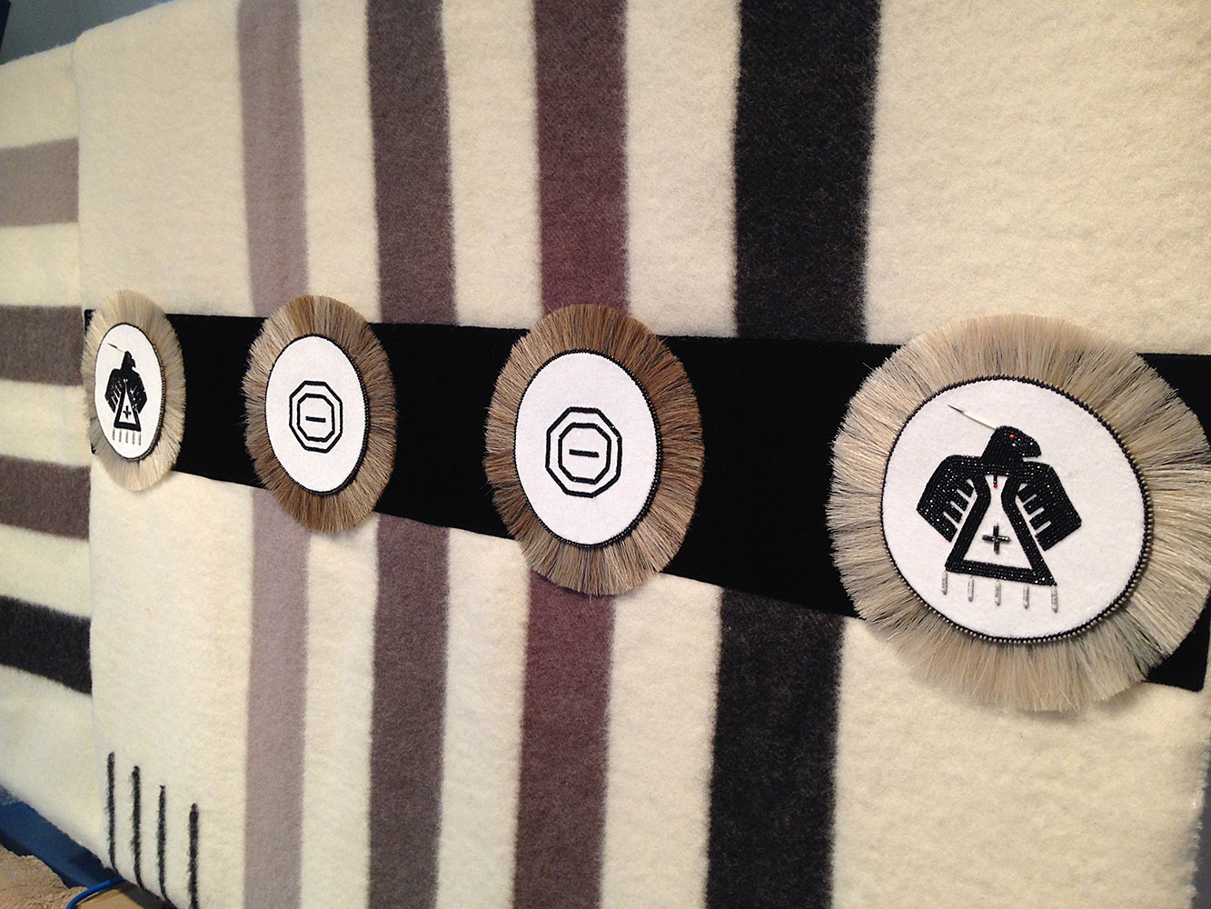 Honouring Blanket for Nahgunegahbow (2016) 163 x 91 cm, wool, velvet, beads, porcupine quills, horse hair. Private Collection (Gatineau). -