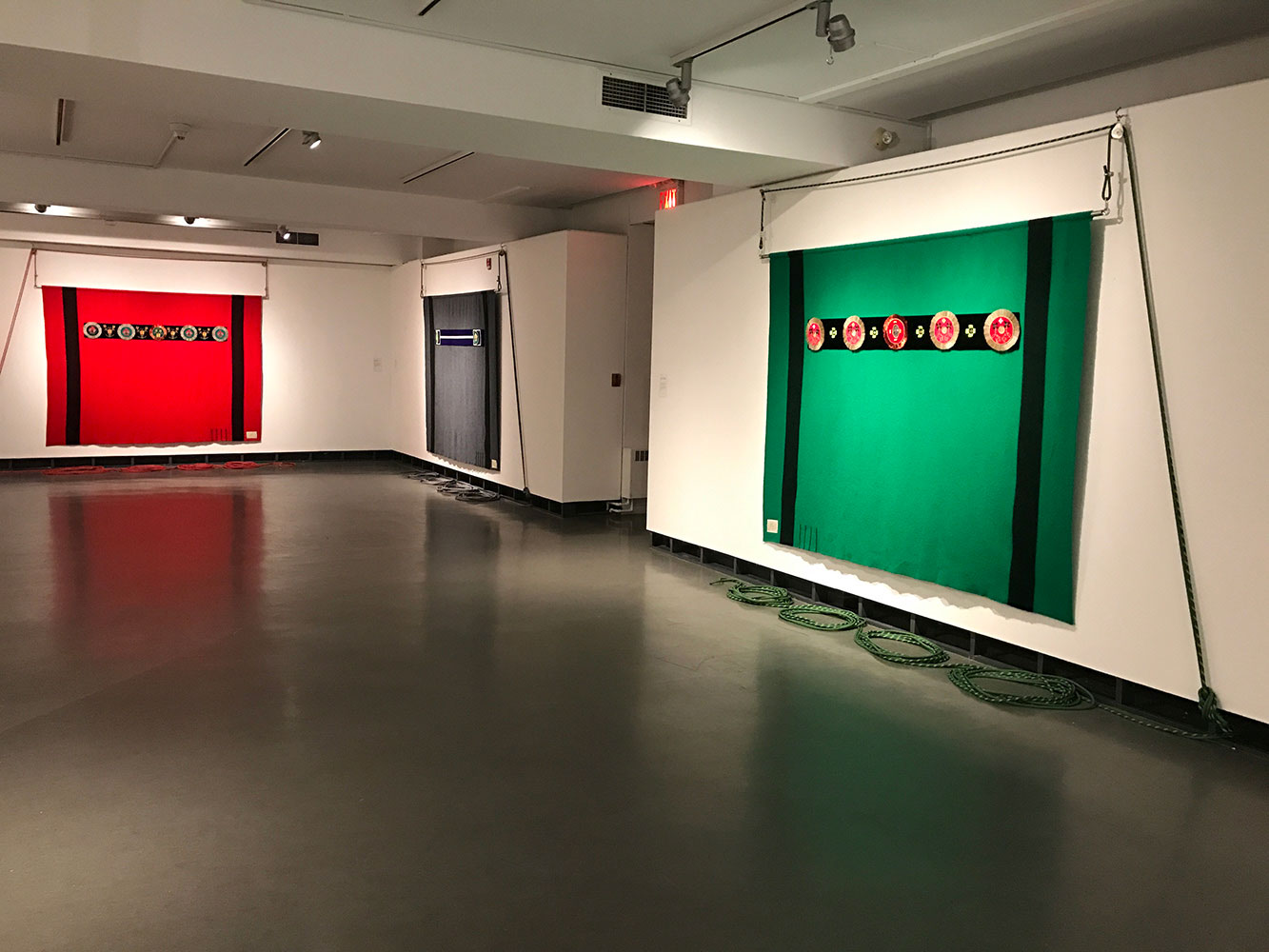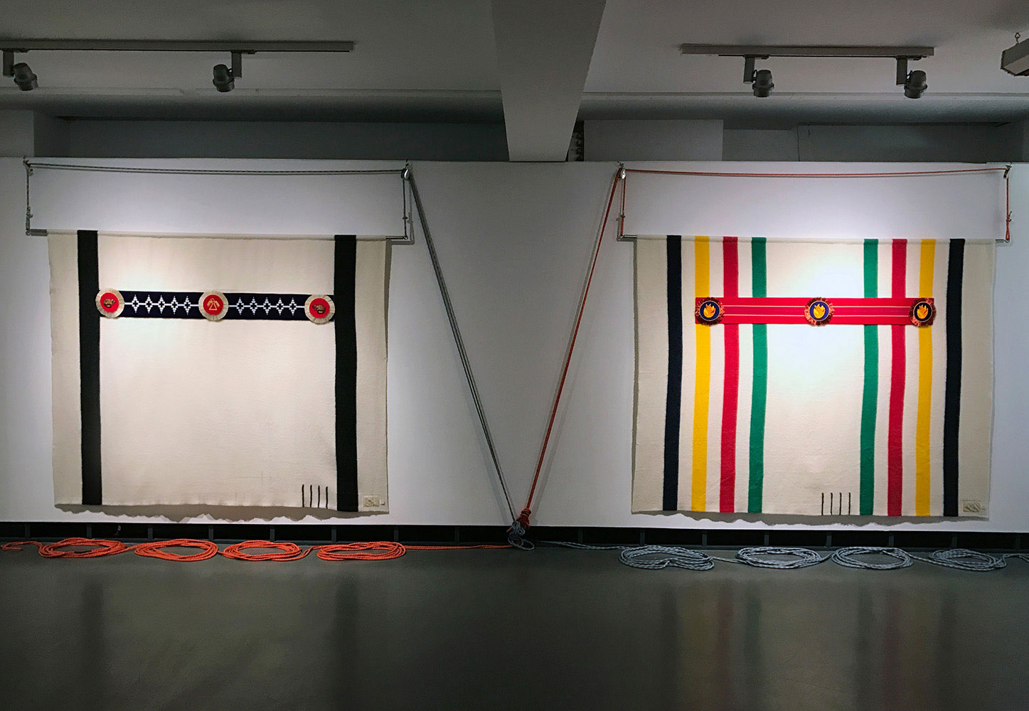 (left) Gichi-zaaga’igan: Lake Ontario (Big Lake) (2016) and (right) Ininwewi-gichigami: Lake Michigan (Illinois Sea) (2016) each measuring 183 x 228 cm, Hudson Bay blanket, velvet, beads, transistors, horse hair, metal, mountain climbing rope. Collection of the Artist. -