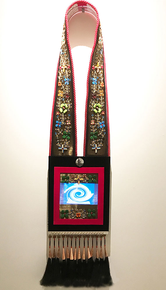 Bandolier for M'Chigeeng (2016) 210(h) x 40(w) x 11(d) cm, mixed media. Collection of the Ojibwe Cultural Foundation (M'Chigeeng). -