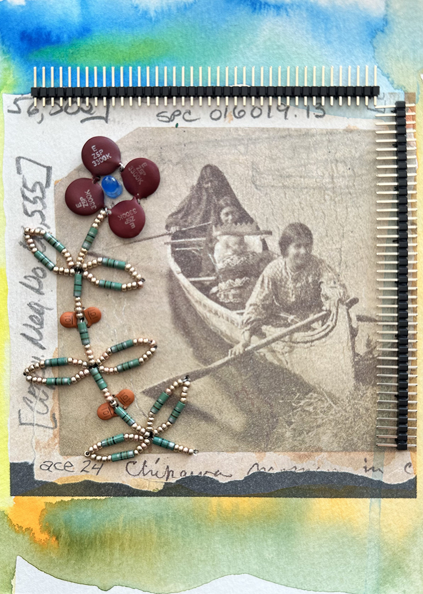 Nsiwak Anishnaabe-kwek miinwaa biibiins (2024) mixed media on paper 18 x 13 cm. Private Collection (Montreal). -