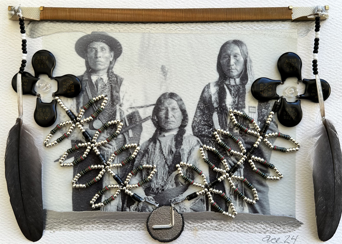 Tekahionwake (Pauline Johnson); Bloodline #7; Jiimaan (Canoe) Triptych (2020) digital output, capacitors, resistors, light emitting diodes, beads, acrylic on paper, 17.8 x 48.3 cm. Private Collection (Ottawa). -