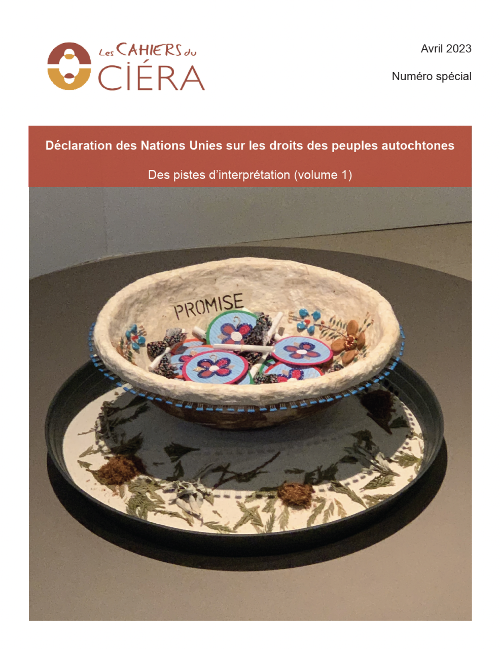United Nations Declaration on the Rights of Indigenous Peoples: Possible Interpretations (Volume 1). Les Cahiers du CIÉRA, Centre interuniversitaire d’études et de recherches autochtones, Université Laval, Québec, QC. (cover art).