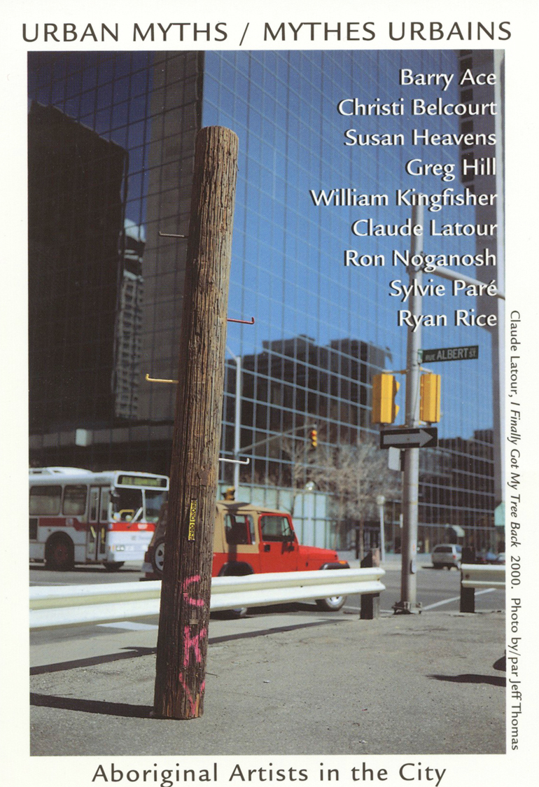 Urban Myths is motivated by this metaphor of visibility and invisibility. What we see in the metropolitan environment-buildings, monuments, parks, street names, neighbourhoods-reflects and reproduces societal values. Yet there is little in the Ottawa landscape that valorizes or affirms the existence of its Aboriginal inhabitants. In the realm of public art, there is only the Indian Scout statue in Major’s Hill Park, and several totem poles scattered throughout the city.