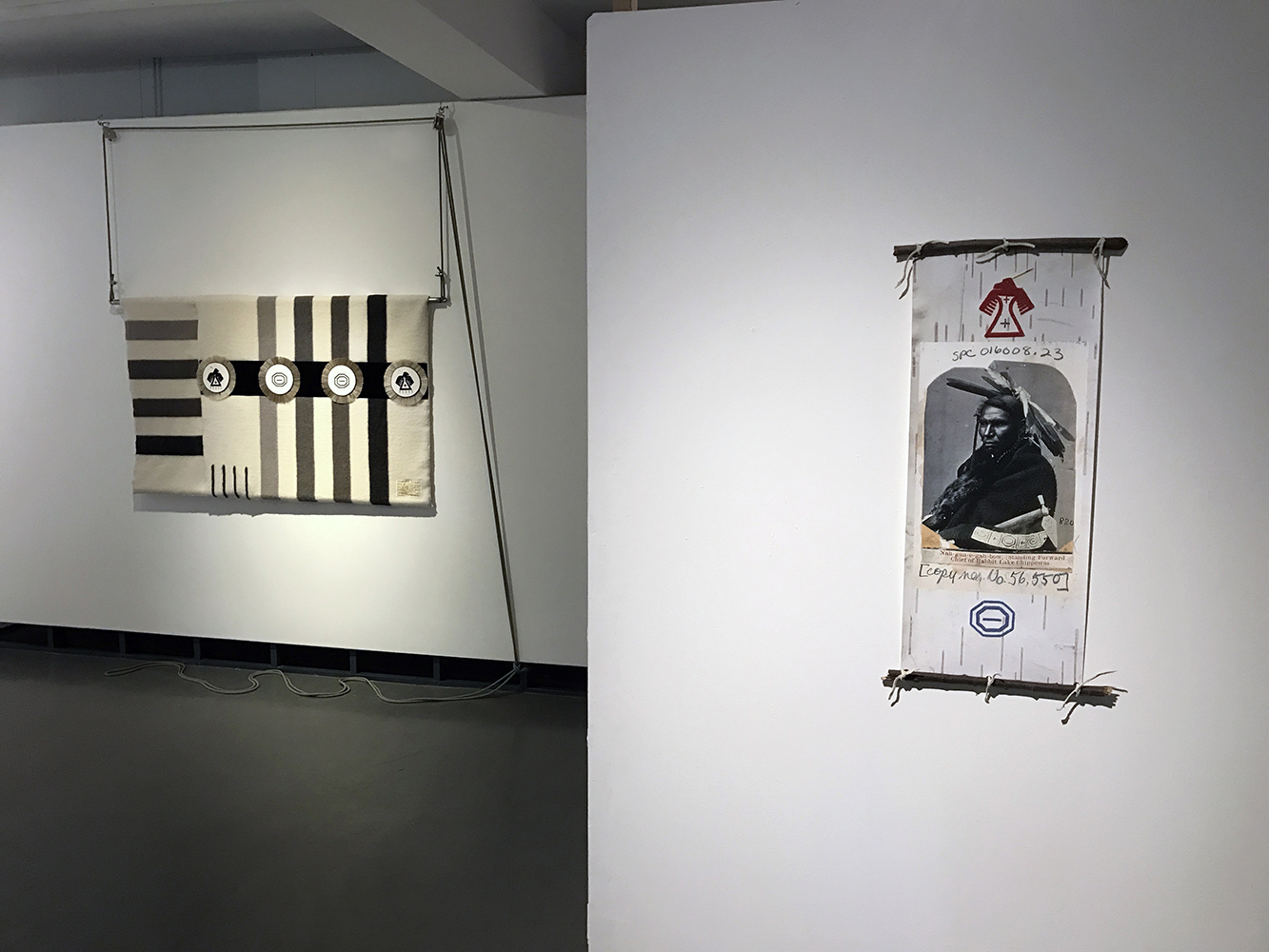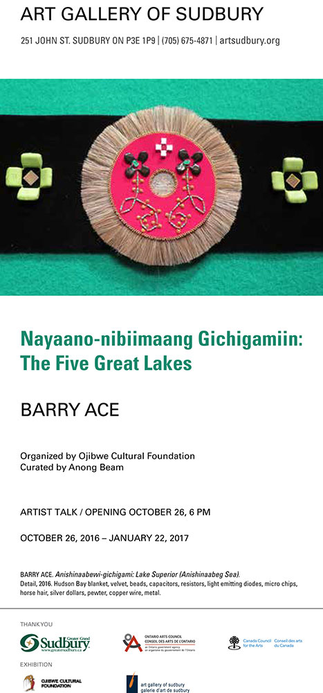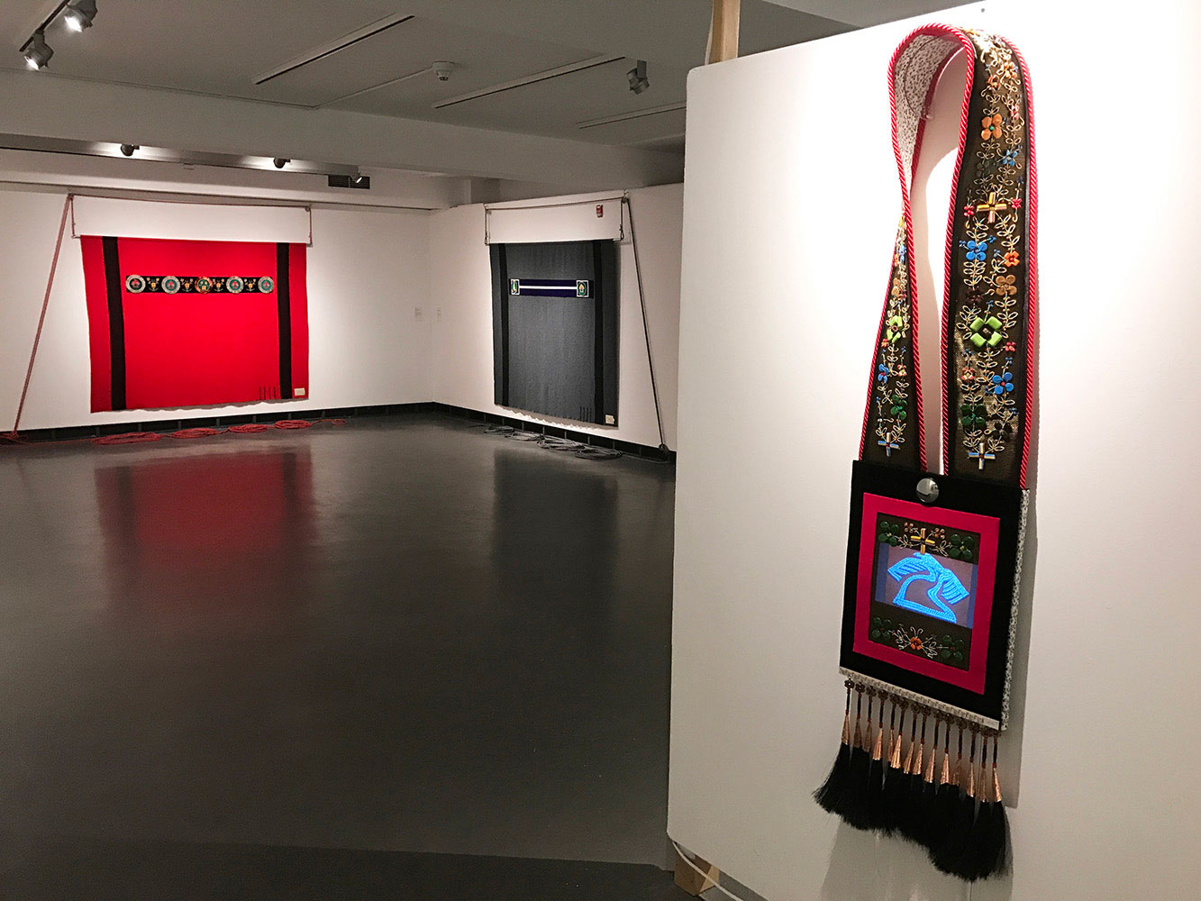 The exhibition is further complimented by a generous loan of a recently gifted work by the artist to the Ojibwe Cultural Foundation, entitled Bandolier for M’Chigeeng. Ace’s contemporary animated Anishinaabe bandoliers are generously embellished works with complex bead and electronic component floral motifs. Embedded in the front of this bandolier bag is a new media digital tablet streaming the transformation of the sacred thunderbird and underwater panther, acknowledging the significance of cultural continuity of traditional knowledge and the on-going confluence between the historical and contemporary in Anishinaabeg culture.