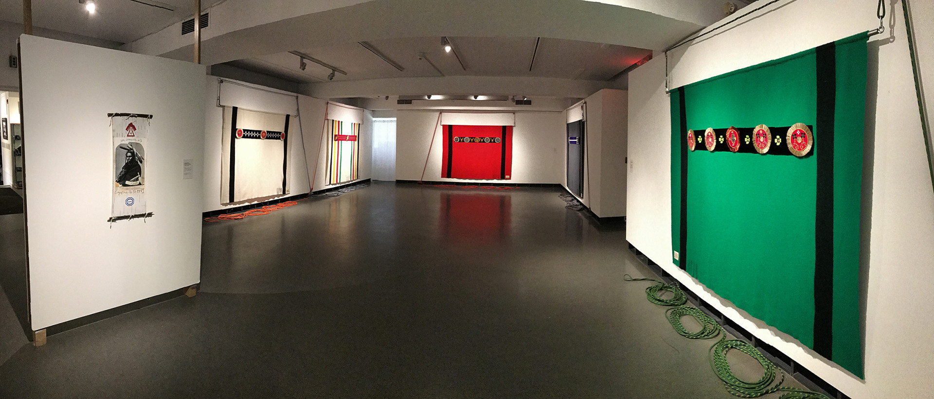 (left) Gichi-zaaga’igan: Lake Ontario (Big Lake) (2016) and (right) Ininwewi-gichigami: Lake Michigan (Illinois Sea) (2016) each measuring 183 x 228 cm, Hudson Bay blanket, velvet, beads, transistors, horse hair, metal, mountain climbing rope.
