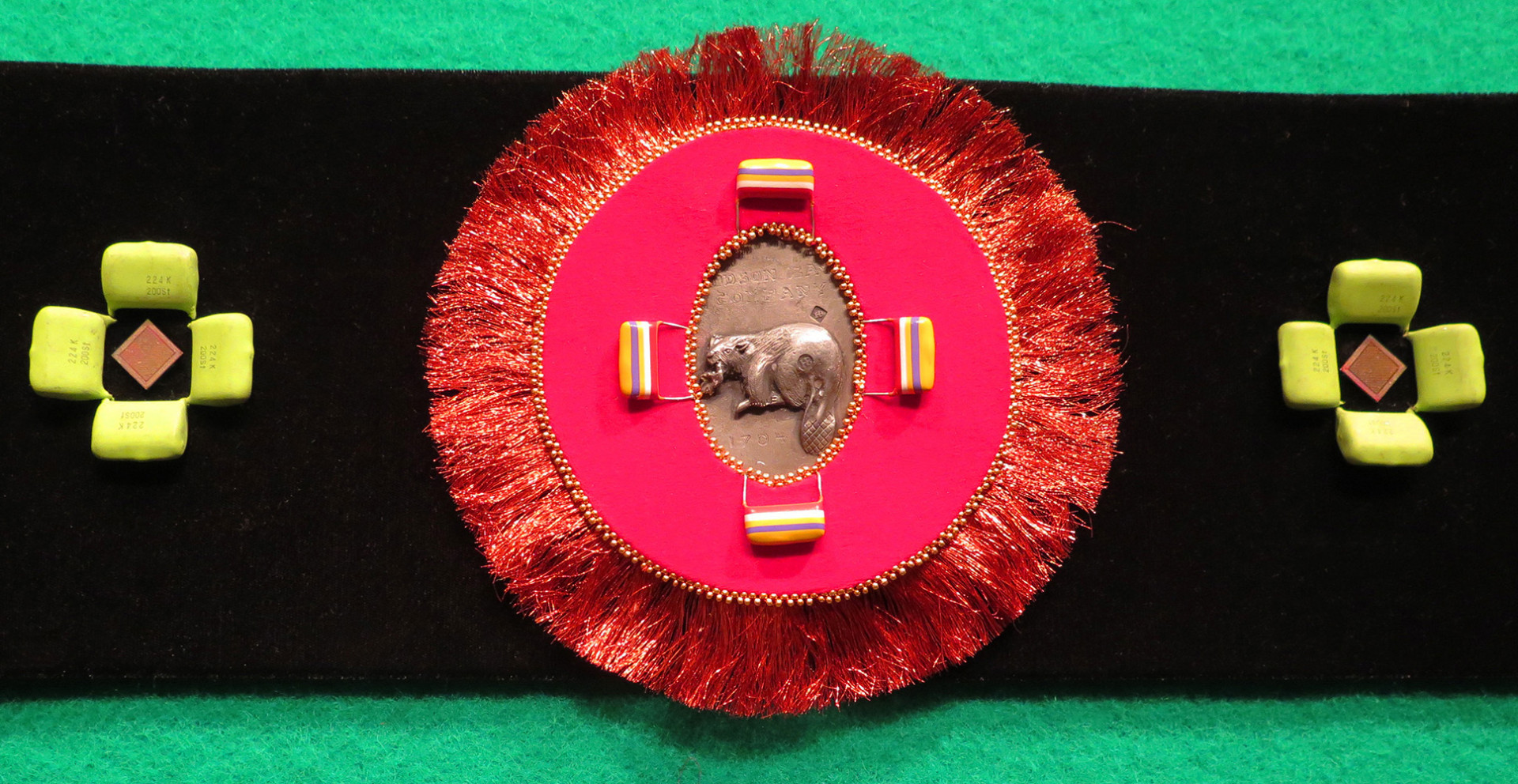 Nayaano-nibiimaang Gichigamiin: The Five Great Lakes presents a brand new series of Anishinaabe honouring blankets with mnemonic recounting blanket strips for each of the Five Great Lakes: the territory and homeland of the Anishinaabeg (Ojibwe, Odawa and Potawatomi peoples). This textile work replicates traditional Great Lakes’ floral and geometric motifs, but they are made from reclaimed and salvaged electronic circuitry (capacitors, microchips, resistors, and diodes) that act as metaphors for cultural continuity (antithesis of stasis), bridging the past with the present and the future. The Hudson Bay trade blankets carry with them a longstanding narrative and response to colonization; acts of self-determination and a complicated economic trade history between the original peoples of the Great Lakes and newly arrived settlers, but these blankets also carry with them significant culture-based signs and semiotics. This body of work explores these aspects of the trade blanket.