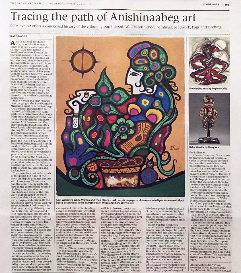 Exhibition review “Tracing the path of Anishinaabeg Art”, The Globe and Mail, Saturday, June 17, 2017. Page R9.
