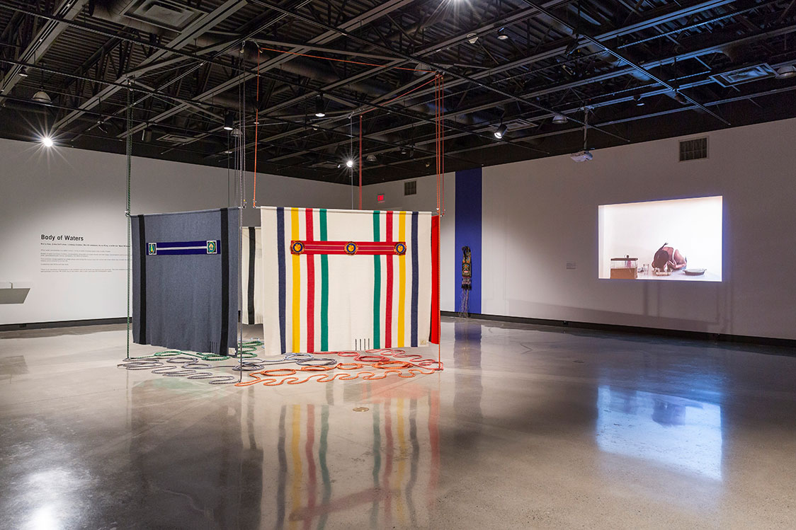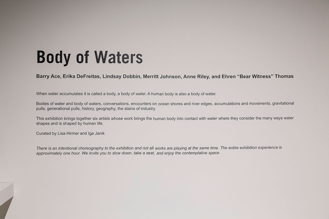This exhibition brings together six artists – Barry Ace, Erika DeFreitas, Lindsay Dobbin, Merritt Johnson, Anne Riley, and Ehren “Bear Witness” Thomas – whose work brings the human body into contact with water where they consider the many ways water shapes and is shaped by human life.”