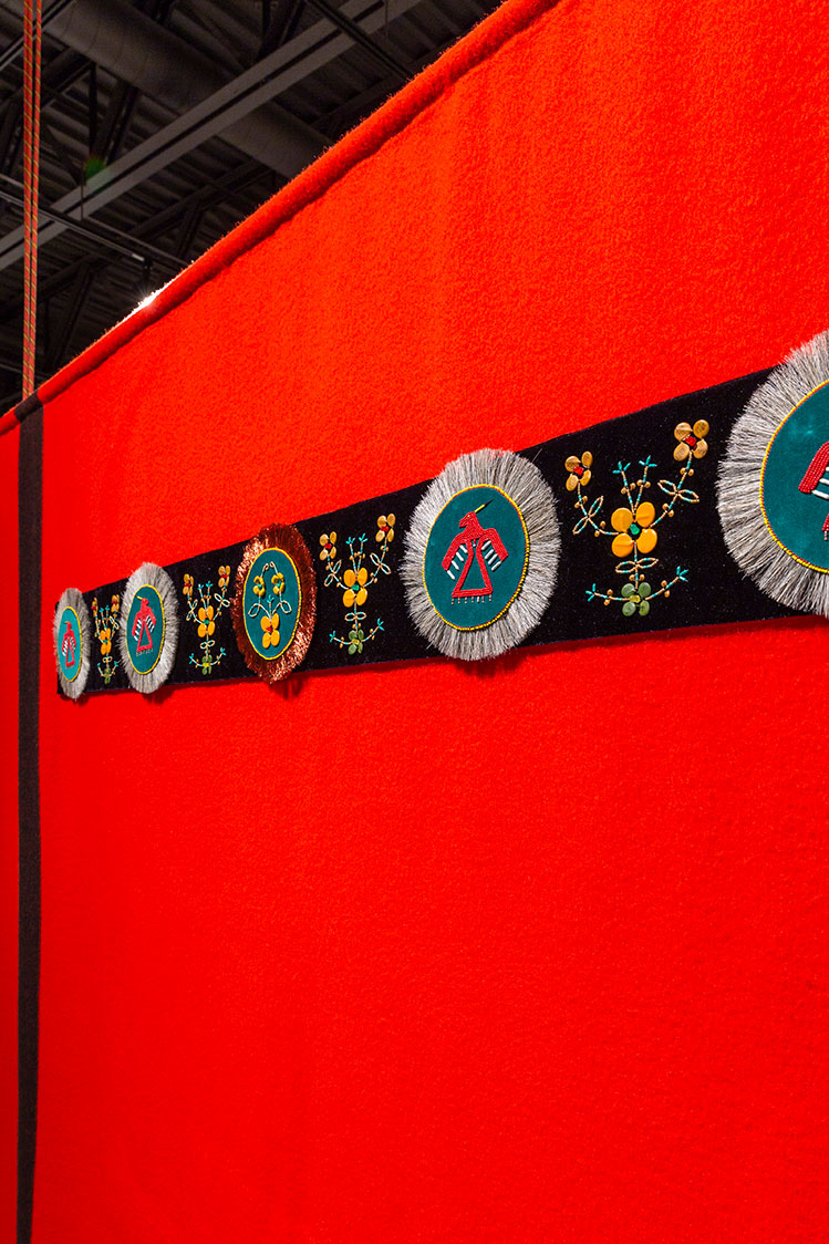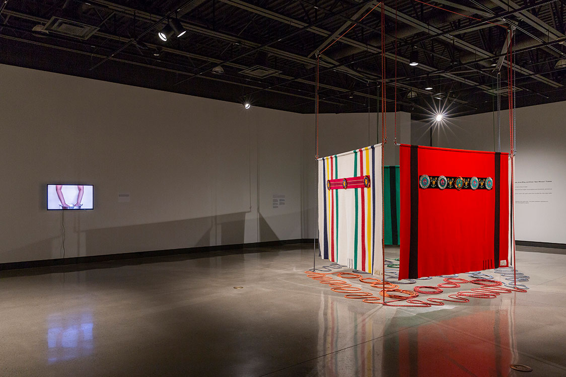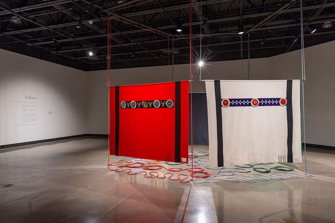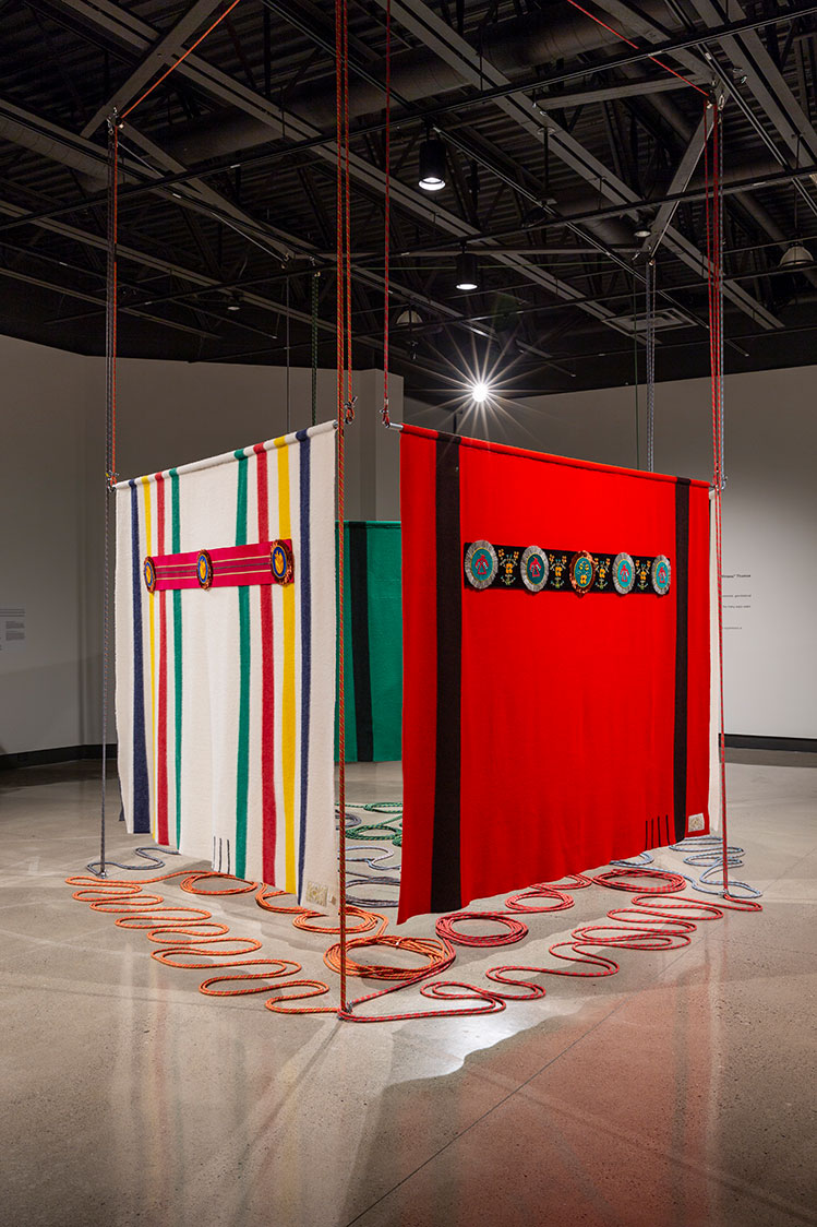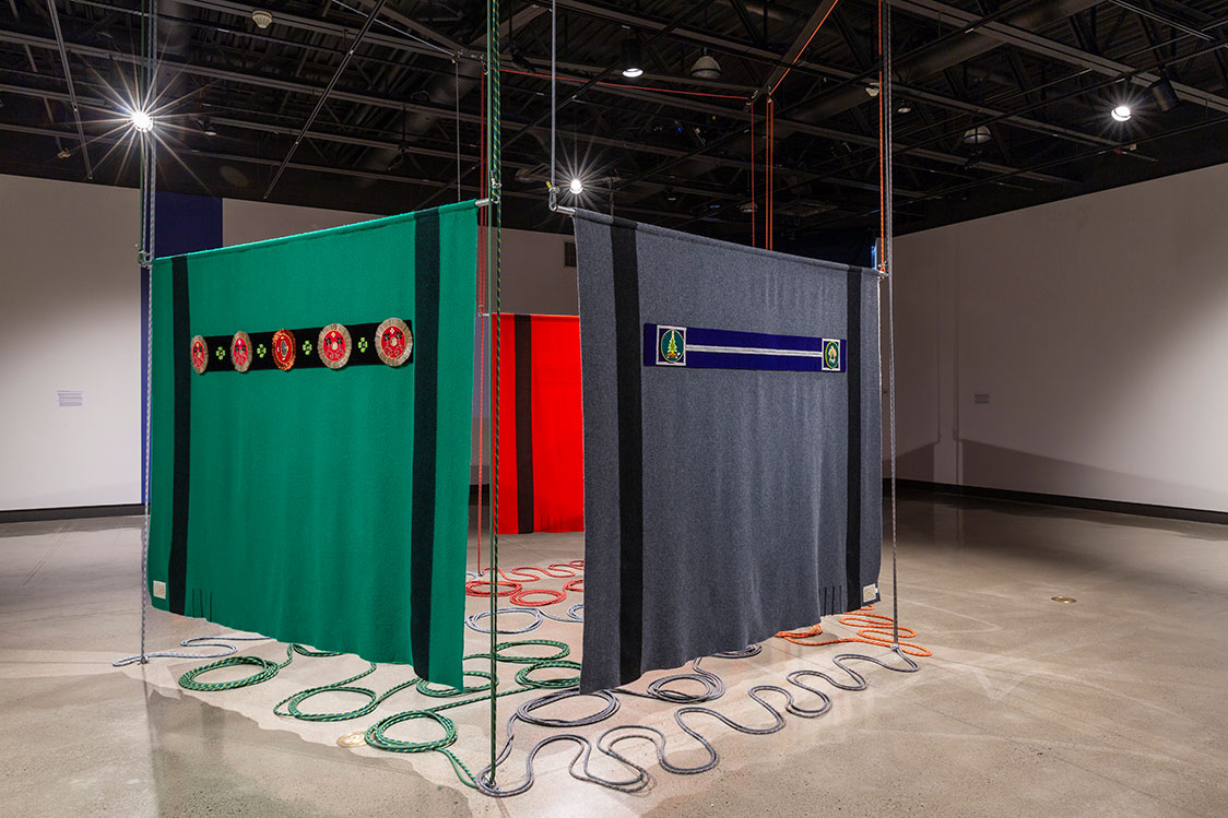 Nayaano-nibiimaang Gichigamiin: The Five Great Lakes (2016) presents an honouring blanket for each of the Great Lakes. By using the Hudson Bay blankets, Ace points to the long narrative of colonization and trade history the blankets have with the peoples of the Great Lakes. The blankets also carry with them culture specific signs and semiotics as they became assimilated into Anishinaabeg material culture. The trade blankets were at one time revered and were offered as highly valued gifts and worn as regalia on important occasions, even fashioned into garments such as coats. When these blankets were decorated with a beaded blanket strip, for instance, they took on an even greater cultural and spiritual significance.