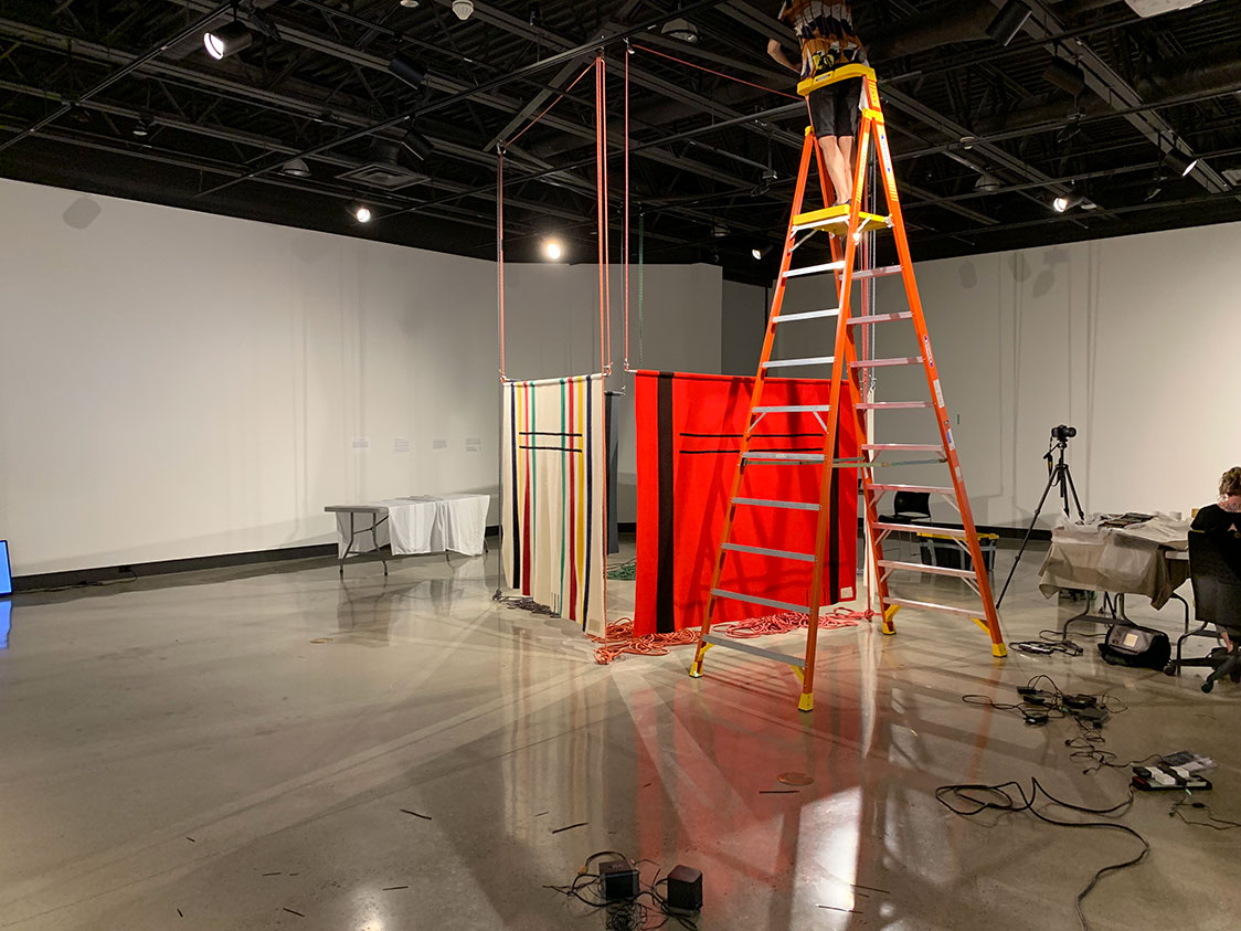 Installation in progress of "Nayaano-nibiimaang Gichigamiin: The Five Great Lakes" at Idea Exchange.