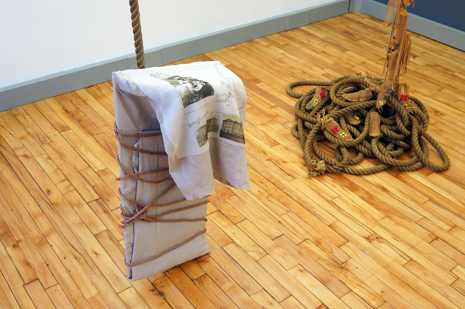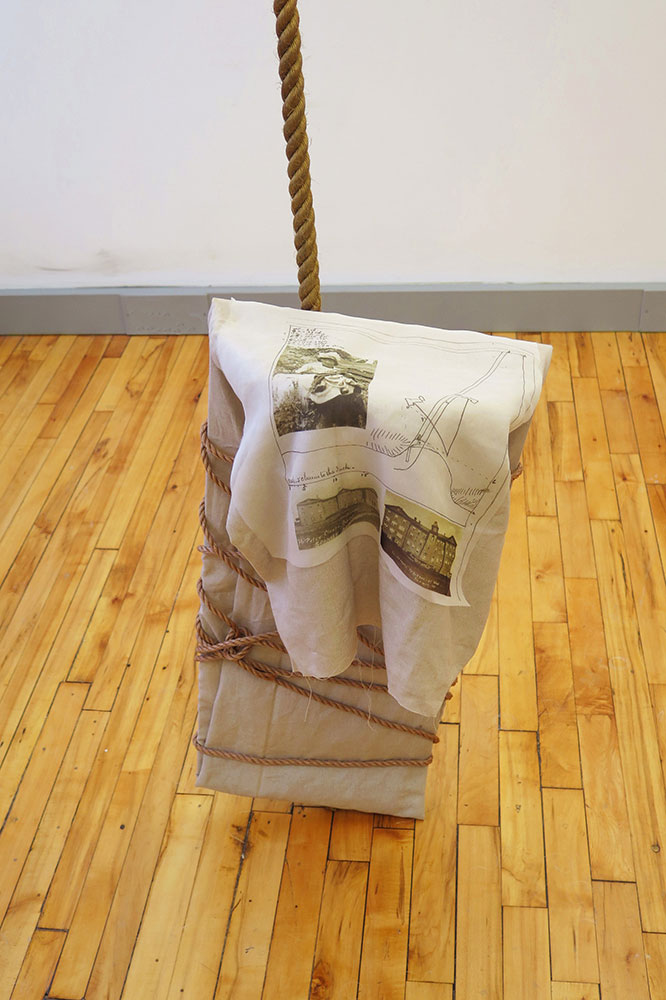 For this work, I have replicated a cradleboard and overlaid it with a bolt of linen and lashed it in place with rope. Laid on top of the cradleboard is an historical photograph taken of my great-aunt holding my father as a baby taken circa 1922 by my grandmother. The photograph has been printed directly on transparent organza fabric to evoke a ghost-like image. Also printed on the organza is an image that I sourced from the Jesuit Archives in Montreal of the original survey drawing of the two schools along with photographic images of Saint Peter Claver and Saint Joseph’s.