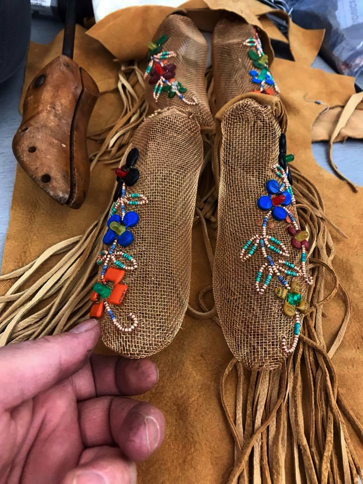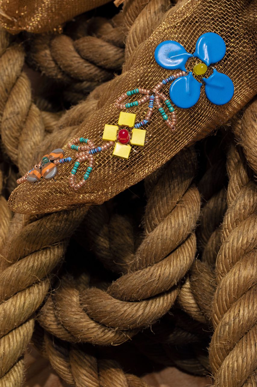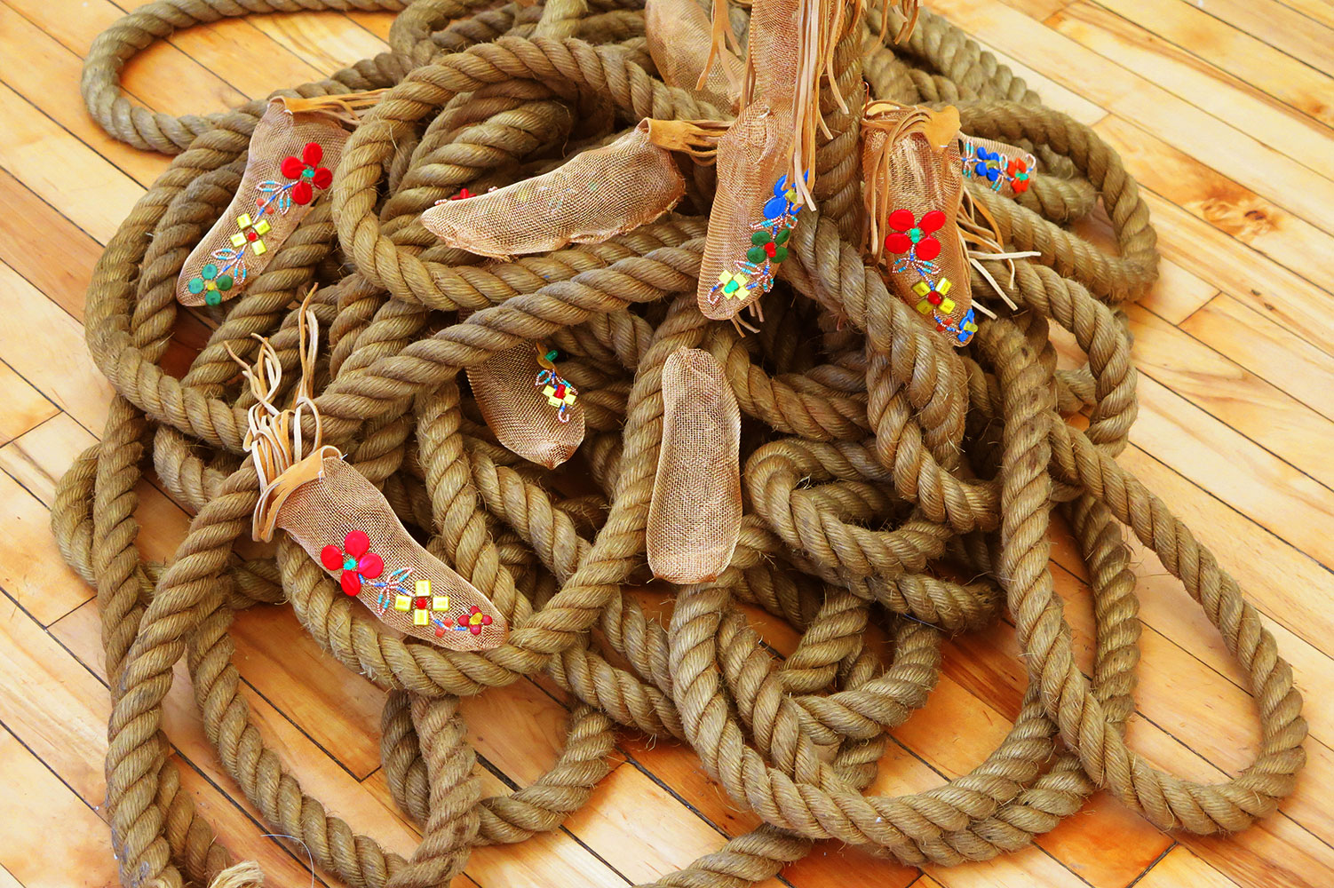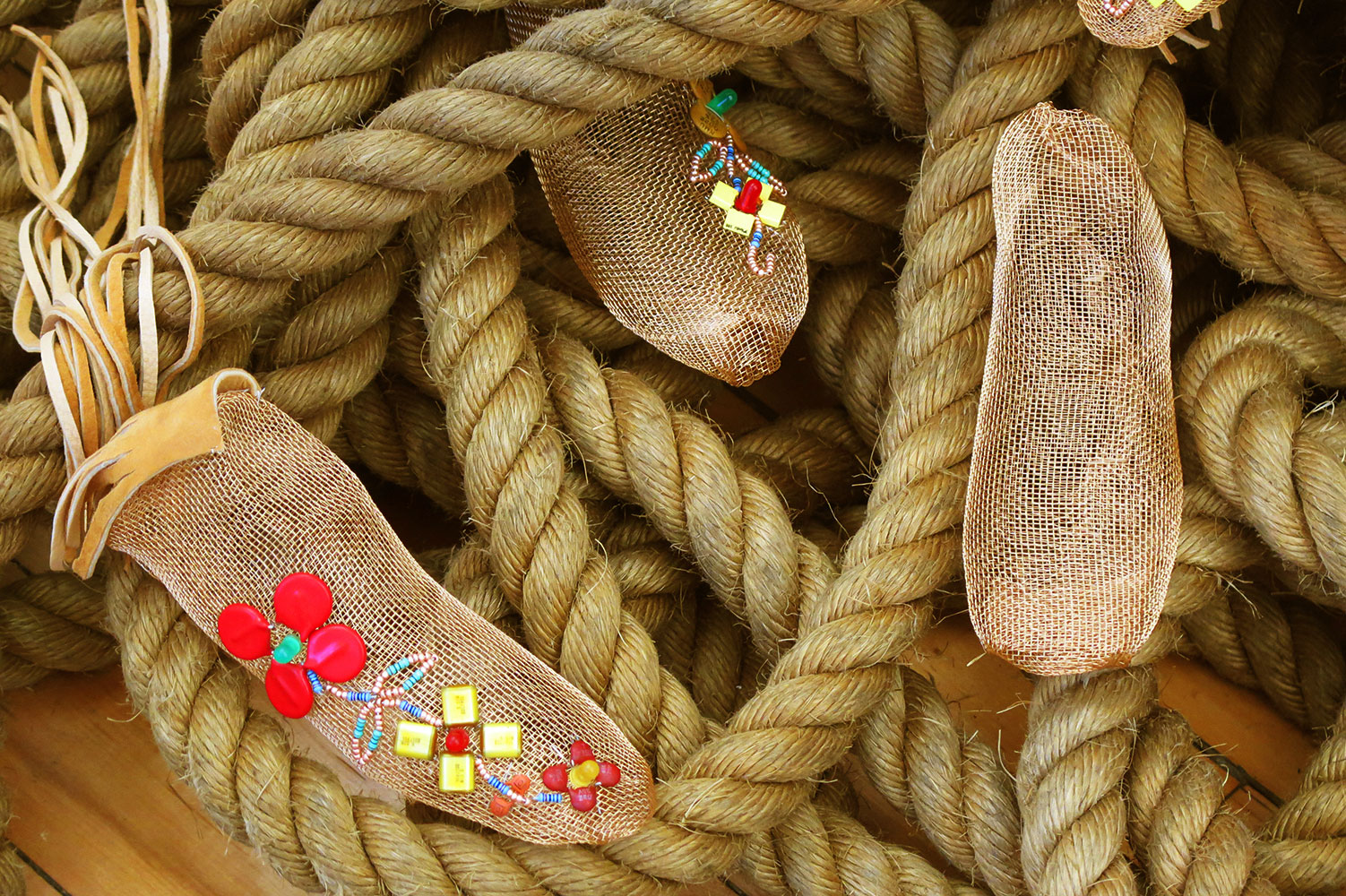 The hemp rope used to suspend the cradleboard is similar to the rope that was used to pull an open boat called the Red Bug behind the motorized Garnier vessel filled with children. The thick hemp rope extends from the cradleboard through two wooden pulleys attached to a wooden yoke that together reference the nautical and the burden of assimilation. Cascading down the rope that pools and coils on the floor are small bronze wire shoe forms that are molded from a child’s wooden shoe last. Some of these wire moccasin-like shoe forms are adorned with deer-hide fringe and electronic components with glass beads to form Anishinaabe floral motifs. The shoes are held transparent and hollow to represent the impact of assimilation and cultural loss, while the shoes that have partial floral motifs represent some aspects of the culture and language that survived to be passed on to future generations. Some of the moccasins are left blanket representing those who died at these schools. The hide fringe reference trail dusters that were once affixed to the heel of moccasins that dragged behind the wearer to erase evidence of their tracks. But these dusters are falling forward representing the experiences and stories of these children that must never be forgotten or erased.
